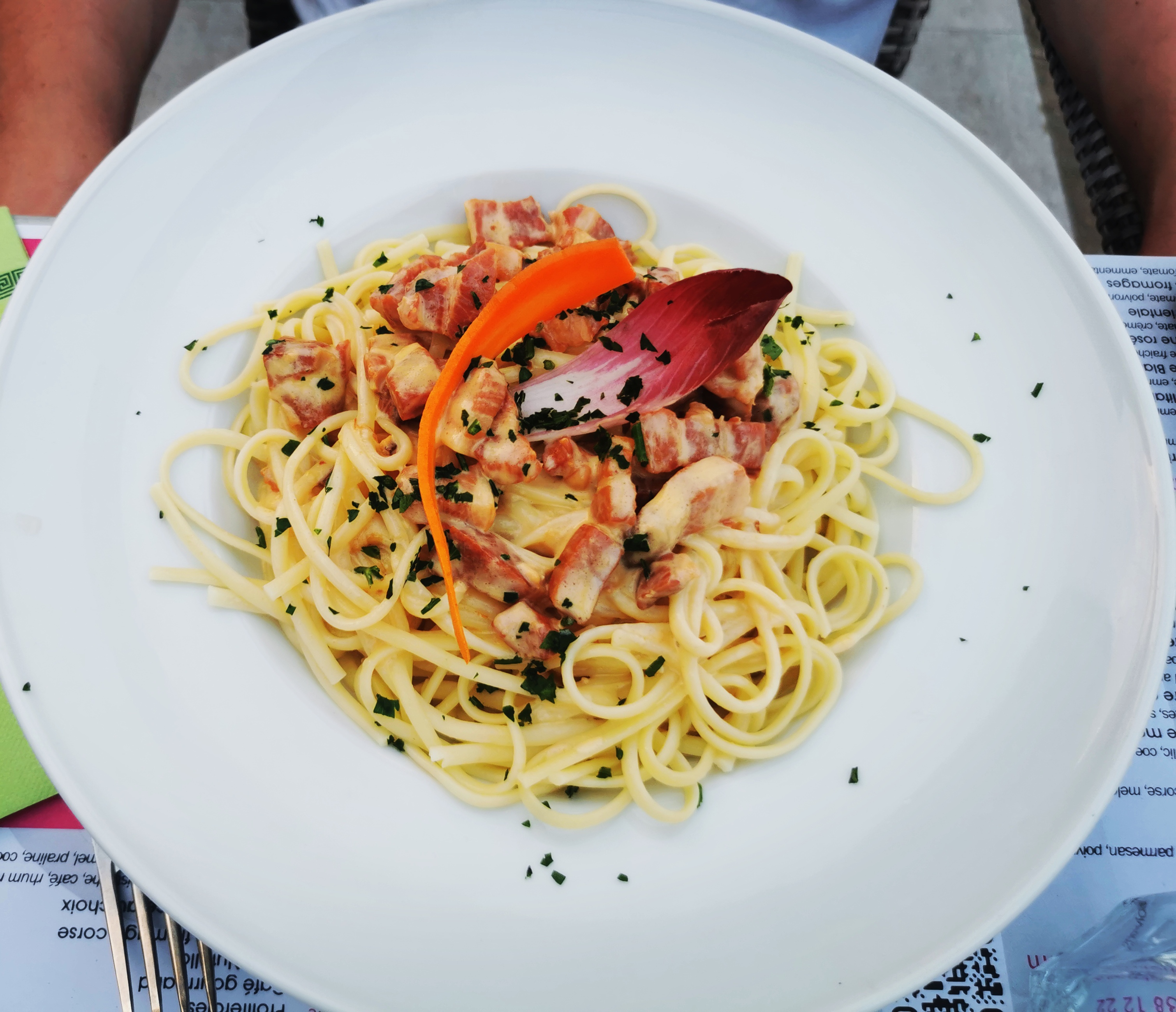 Très bonnes pizzas avec une pâte fine comme on les aime, en revanche les pâtes à la carbonara avec les morceaux de pancette trop salé .