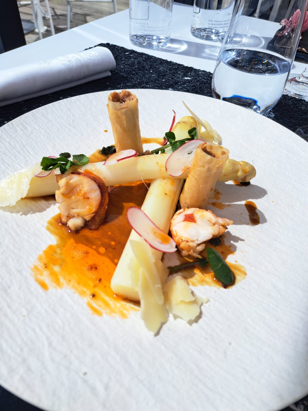 Accueil, service, conseils du sommelier très bien. Par contre aux cuisines il serait bon de se remettre en cause .si c est du fait maison et j en doute patte feuilletée des asperges incassable ! Plastique d emballage livré comme assaisonnement. !!!Quand au plat viande trop cuite..bof globalement une bonne presentation des plats mais sans saveurs .