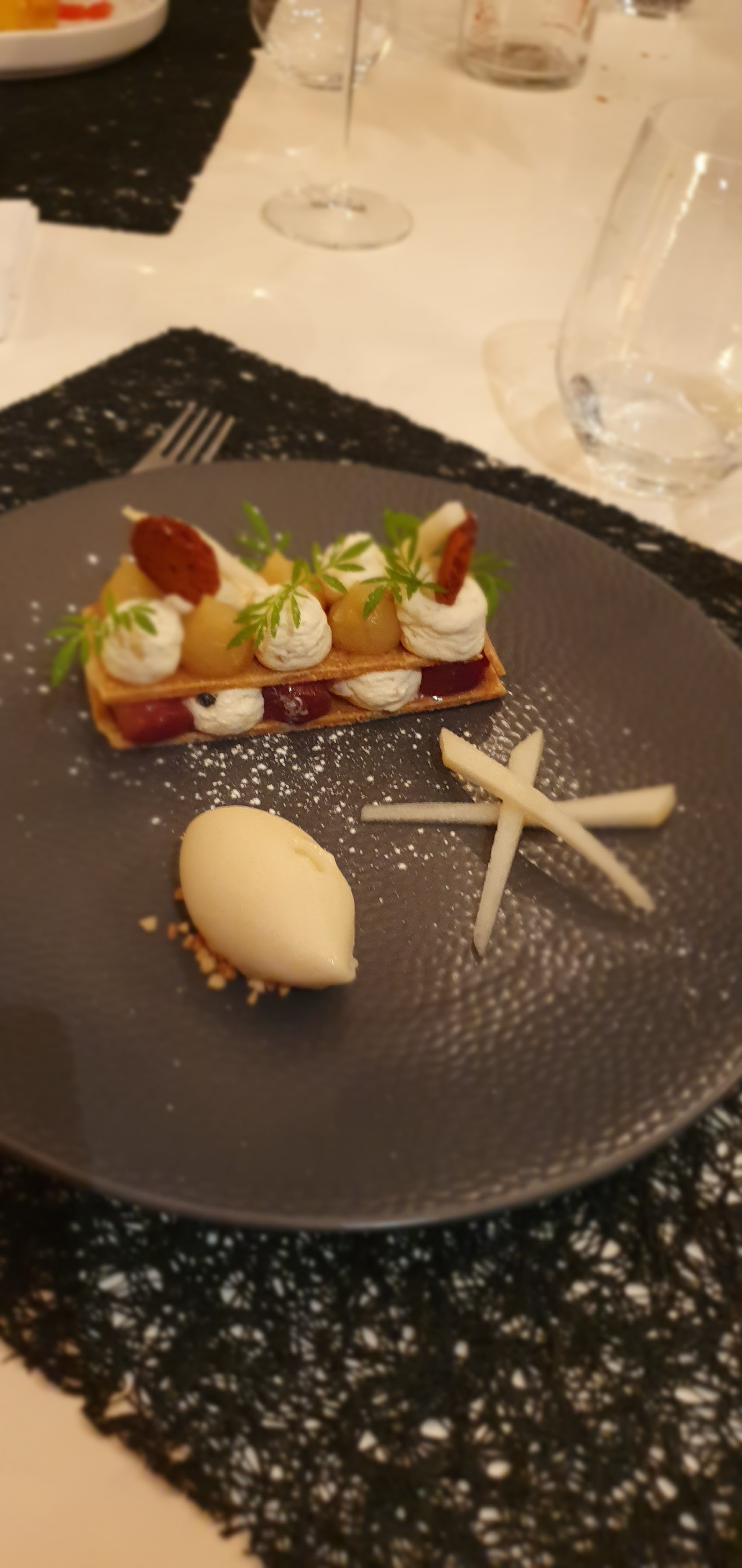 Cadre sympa. Accueil assez froid j'ai trouvé, pas de choix pour la table et pas de 'est ce cette table vous convient ? ' alors qu'il y avait d'autres tables vides. Très long pour la prise de commande(au moins 30mn).amuses bouche offerts puis autre amuse bouche offert pour patienter . J'ai trouvé la carte du menu plutôt difficile à comprendre. Par contre après la prise de commande, service plutôt efficace et rapide. Entrée très bonne avec un bon assemblage de saveurs. On se dit que la suite va être pas mal du tout. Puis arrive le plat principal, merlan et gnocchi. Assez déçue, bon mais pas exceptionnel. Extrêmement lourd (du mal à finir). Puis dessert (certains desserts doivent être commandés à la prise de commande) mais pas apprécié du tout car trop lourd aussi. On a laissé les mignardises. Toilettes à rafraîchir. Globalement déçue de ce resto, nous n'y retourneront pas.