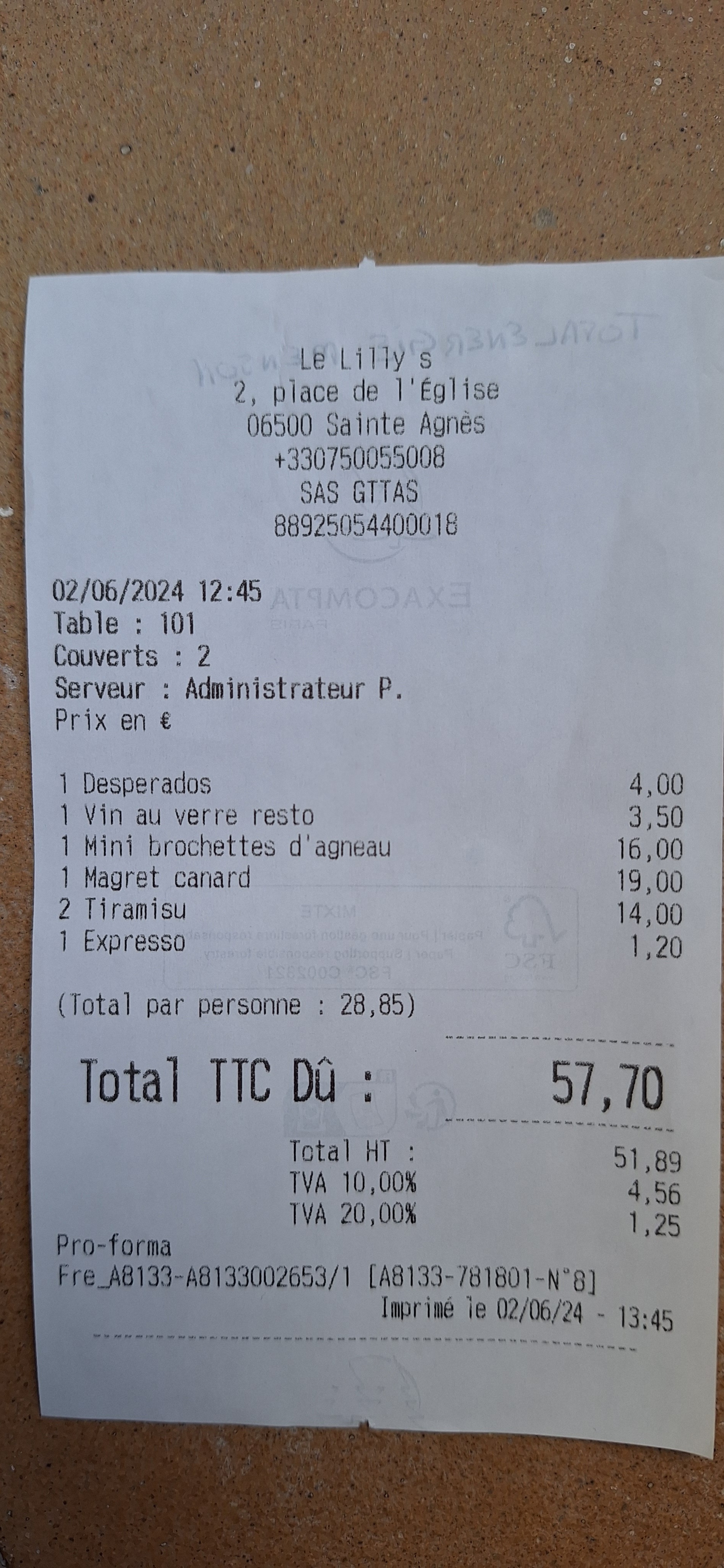 Nous devions y aller depuis longtemps car nous en avions entendu que du bien et nous en étions convaincu comme c’était tenu par une personne originaire du village que nous connaissons bien et qui est du métier. Mais le temps est passé, le covid etc ….bien qu’habitant Menton, nous n’avons pu y aller pour la 1ère fois que fin juillet 2023 mais à notre surprise les « créateurs » du Lilly’s l’avait vendu …mais bon, bonne surprise néanmoins fin juillet car bon accueil, même si les nouveaux propriétaires et les serveurs semblent découvrir le métier (ce qui n’est cependant à priori pas le cas contrairement aux apparences) , les plats sont bons surtout les pizzas et le burgers mais les desserts sont bien présentés mais ne sont pas du tout goûtus. Nous avons testé la crème caramel pas mauvaise mais très fade, le tiramisu encore plus fade, le moelleux au chocolat surchauffé donc infecte et nous avons voulu tester les profiterolles au chocolat, qui sont à la carte, mais ils en avaient jamais …. En 3 semaines nous y sommes allés 3 fois …. Ce qui donnait envie c’était les plats… Une des fois il y avait un concert avec une bonne musique mais vraiment trop fort à en percer les tympans ….donc soit c’est nous qui sommes sensibles au bruit soit les autres étaient déjà sourd mais franchement c’était désagréable ..pour aider à supporter nous avions mis nos oreillettes de telephone qui ont servi de bouchon d’oreille …. Une autre fois, des enfants jouaient sur la place ce qui mets de l’animation en soit donc ça peut être sympa mais là ils hurlaient en courant partout et faisant rouler sur les pavers leurs trottinettes et les parents leur disaient de s éloigner d’eux pour être tranquille et donc se rapprocher de nous : super …. Mais encore une fois, les plats étaient bon donc cela aidait et on savait désormais qu’il ne fallait plus prendre de dessert à part limite une valeur sûre : des sorbets ;-) donc comme indiqué sur les tickets ci joint nous y sommes allés le 29 juillet, le 11 et le 16 Août …. Ils nous avaient dit servir à manger jusque 22h donc nous y sommes retournés jeudi 17 Août à 21h30 après une longue journée à courir entre hopital et en j’en passe …. Et puis c’est la semaine du 15 Aout donc pas de doute, j’ai eu un restaurant sur Menton donc je sais que c’est une des semaines où l’on peut se faire le plus gros chiffre d’affaires de l’année : mais la cuisine était fermée …. !!!!!! Donc bon on veut bien faire travailler les commerces locaux mais 30 minutes de route sinueuse pour aucun effort : non merci …. On n’y retournera plus ….bon courage à vous !