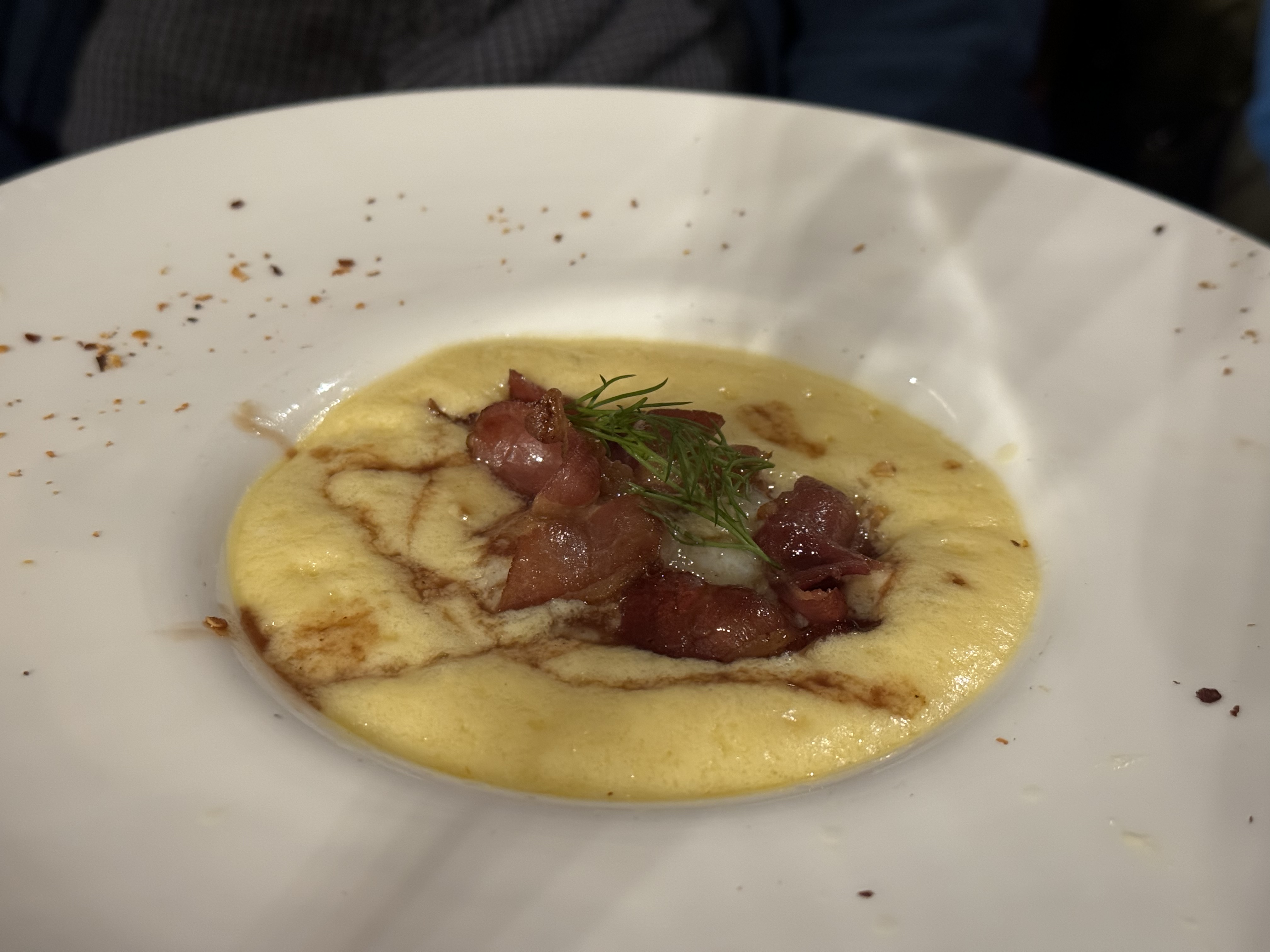 Le cadre est très sympathique : petite salle intimiste où l'on s'y sent bien. En entrée, j'ai pris l'œuf parfait au lard et sauce à la truffe, le goût était bon mais j'ai été surprise de rencontrer quelques gnocchis dans le fond de l'assiette... Un peu étrange mais ce n'était pas mauvais. Pour le plat, j'ai opté pour les saint Jacques poêlées, rôti de fenouil et oignons rouges épicés, conchiglionis farcis. Les saint jacques étaient bonnes par contre il y avait une sauce citronnée qui était beaucoup trop acidulée (je n'ai pas pu la manger alors que j'adore le citron) et encore une fois je me demande ce que les conchiglionis farcis au fromage blanc et poivrons (il me semble) viennent faire là. Puis, je n'ai aucun avis sur le dessert, je l'ai trouvé bon mais quelconque. Je dirai que dans l'ensemble ce n'était pas mauvais mais il y a clairement un déséquilibre des saveurs ce qui n'est pas digne d'un restaurant gastronomique.