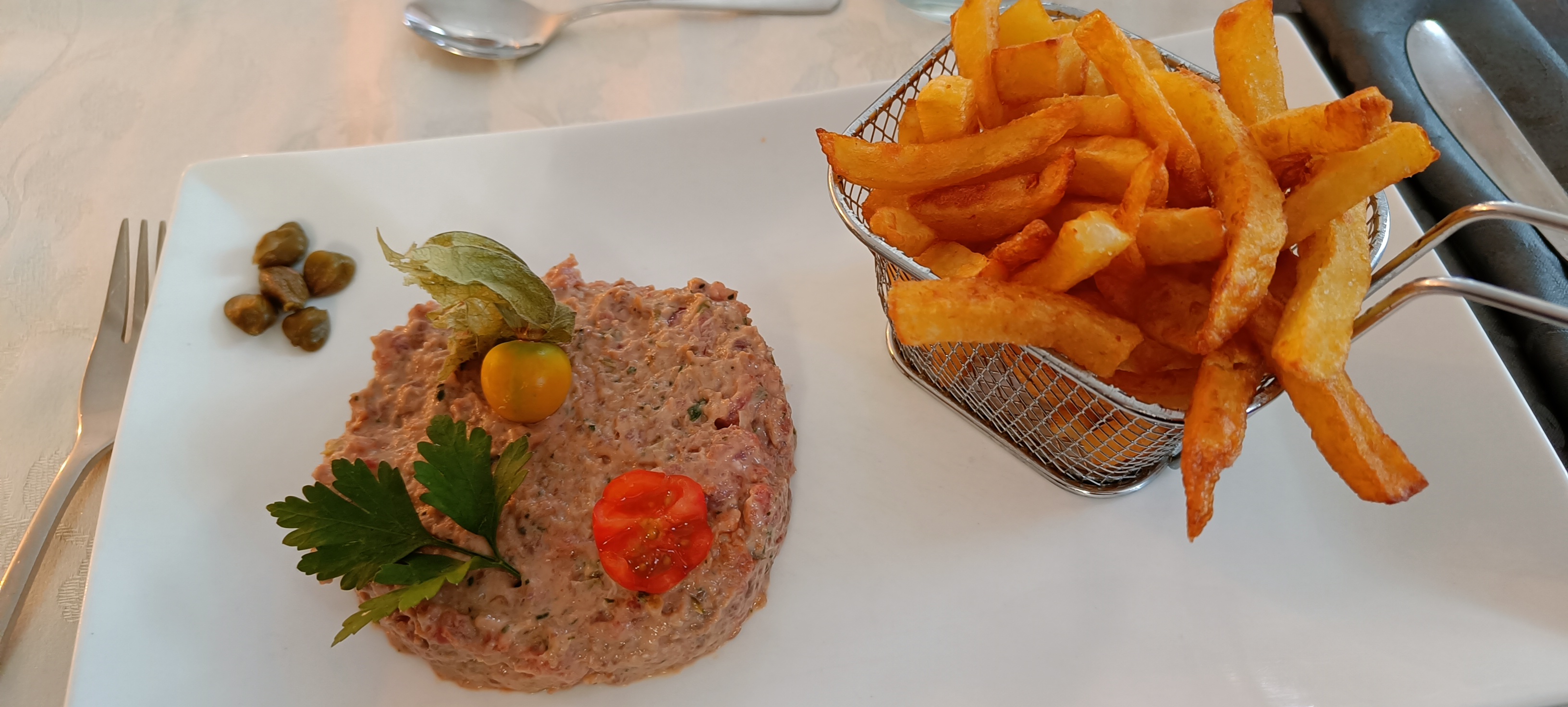 Frisée lardons en entrée : La vinaigrette a du peps c'est bien, par contre la salade était cuite par endroit, peut être à cause des lardons qui ont été versé chaud directement dans la salade ? Je ne sais pas. Tartare de bœuf avec frites, c'était correct, sans folie, ça aurait mérité plus de peps. Je pense que ça vient du faire qu'il n'y avait pas d'oignons ou d'échalotes, sauce worcestershire, Tabasco et peu de moutarde.