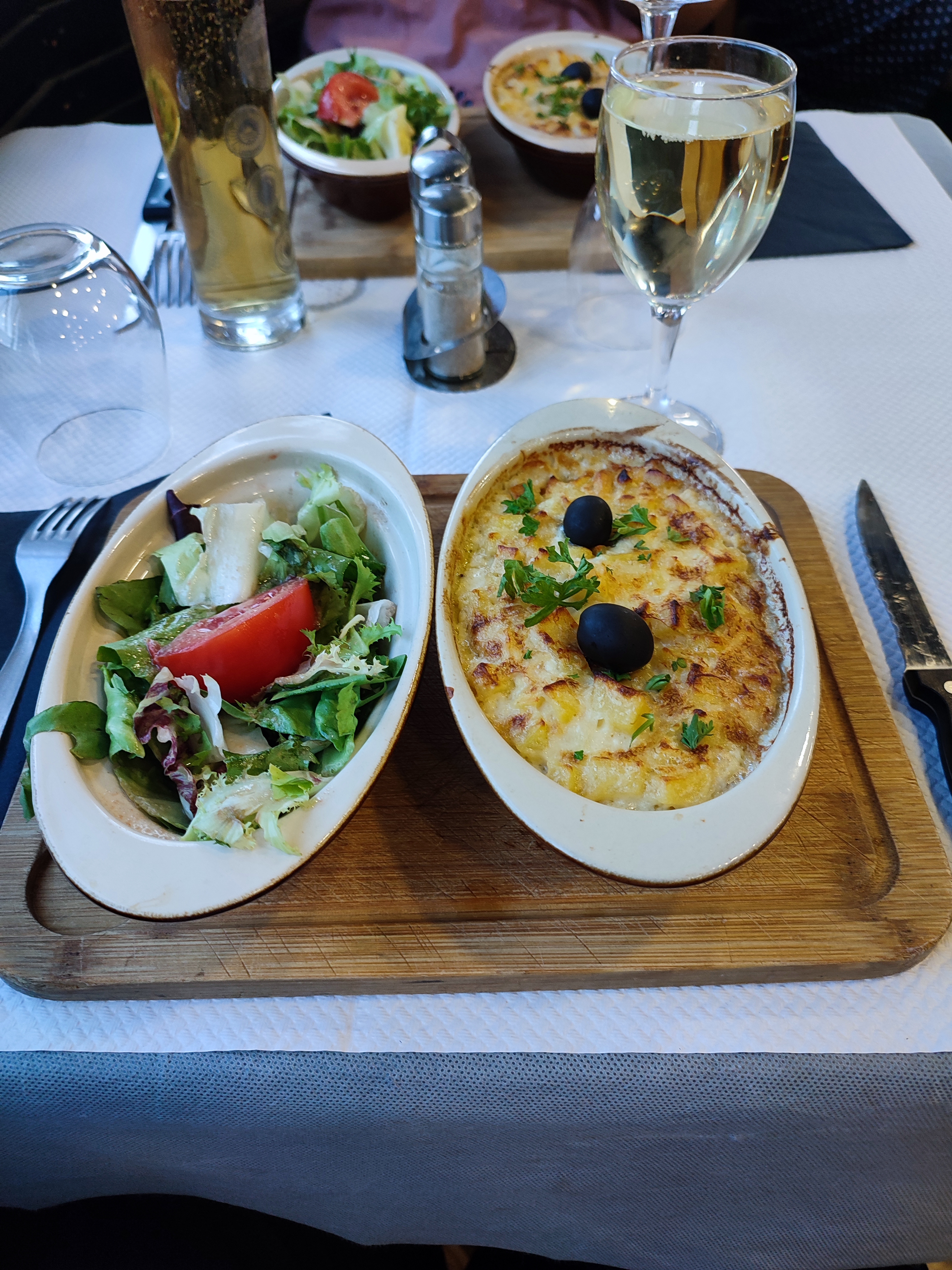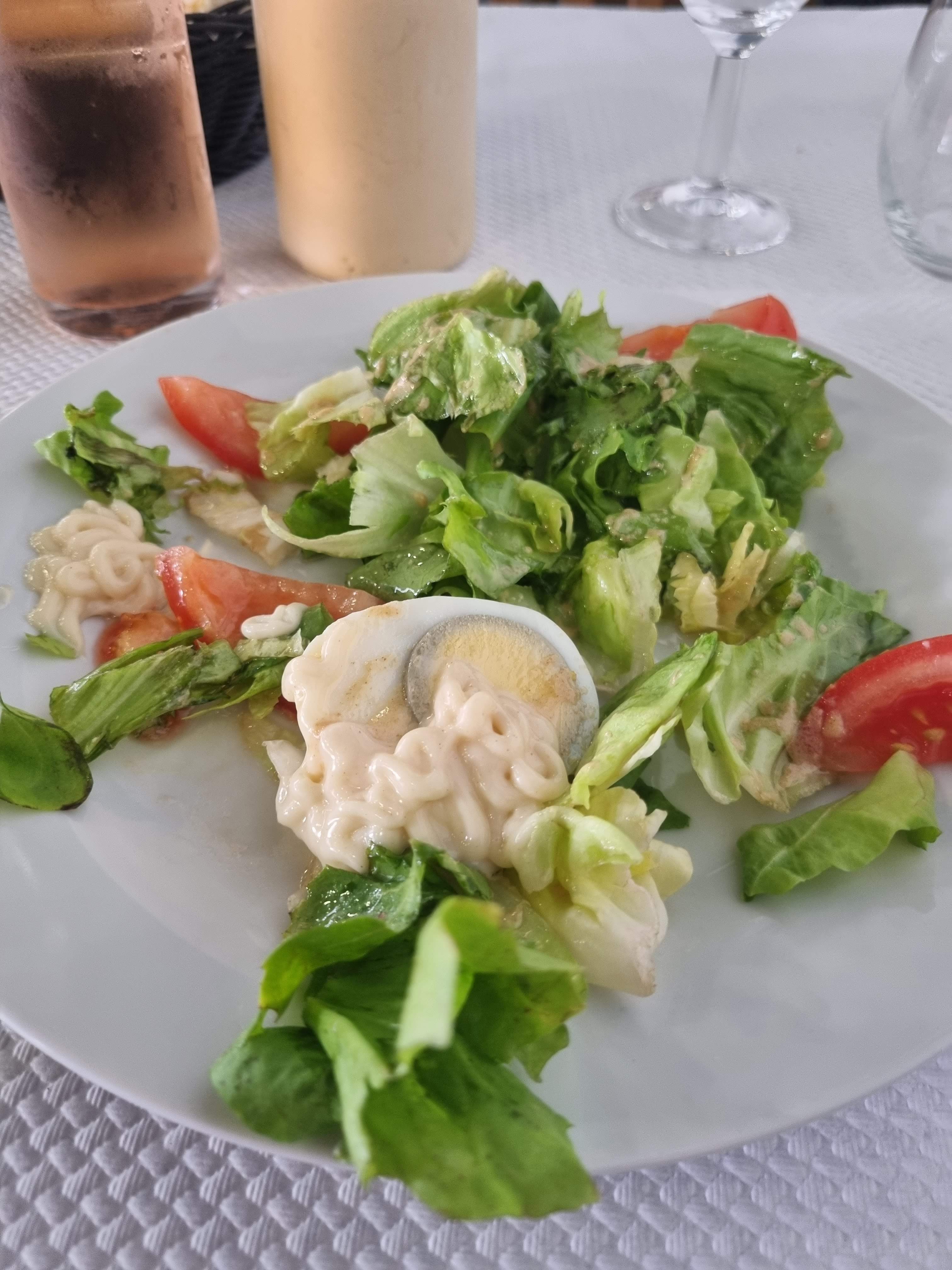 La cuisine est bonne et généreuse, petit bémol pour l'entrée salade de chèvre chaud ,une rondelle de chèvre à peine chaude sur un mélange de salade tout prêt. Par contre le pavé de morue à la Lisbonne était délicieux, un beau pavé qu'on a pas réussi à finir avec une sauce et gambas et frites maison, accompagné d'un très bon vin Cabriz et pour finir une boule de glace pour digérer.