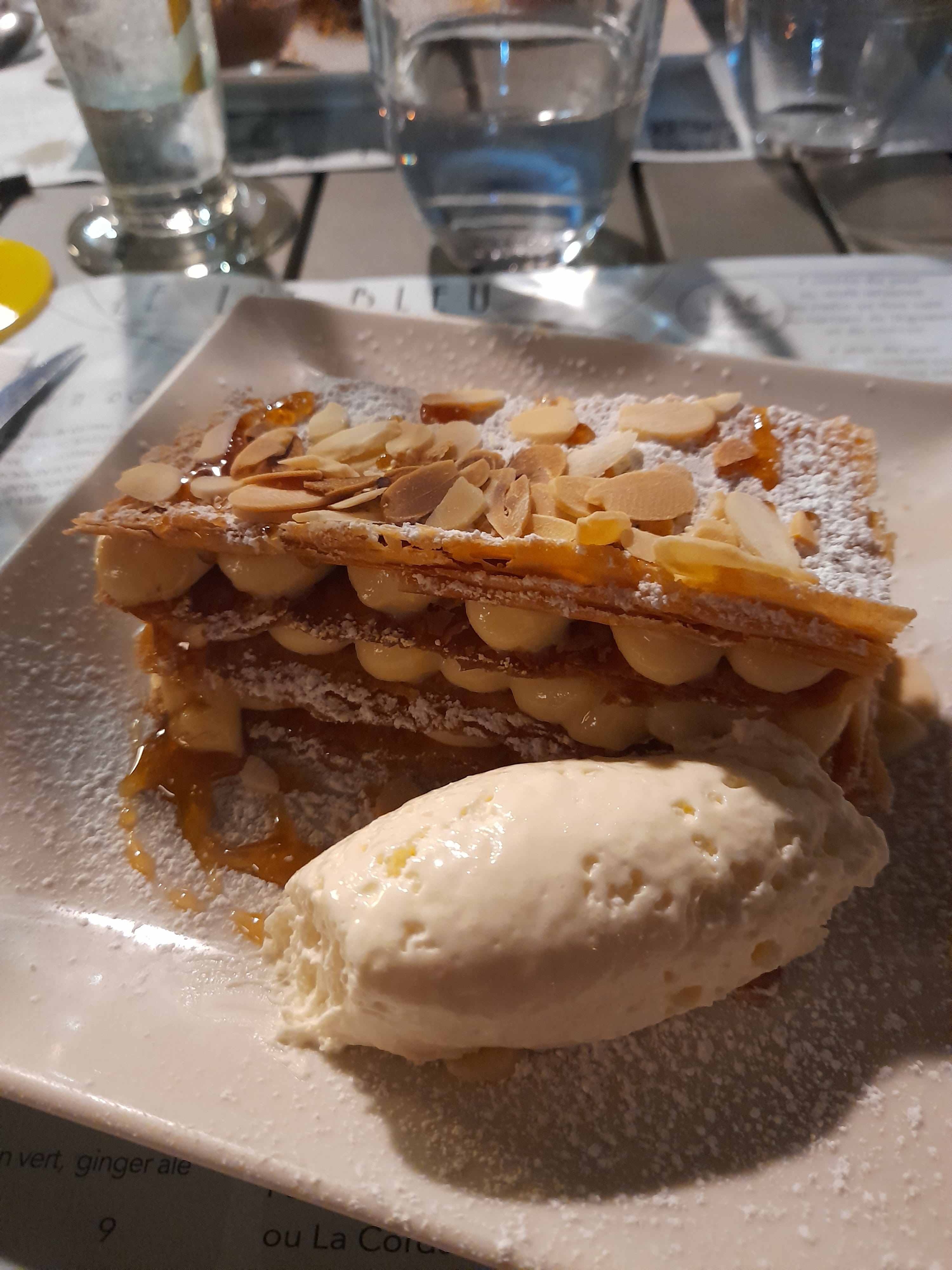 Si je devais résumé en un mot notre expérience au lit bleu : décevant. Entre l attente interminable entre les plats nous sommes arrivés a 21 h et nous sommes sorties seulement à 1 heure du matin. Effectivement c était la fête de la musique mais 4 heures pour servir 6 personnes je trouve ça légèrement abusé. Nous avions pris un menu entrée, plat et dessert à 35 euros (le menu le plus cher de la carte), je ne parle pas de la cuisson de la seiche qui était aussi dur que de la brique et nous avons dû nous lever pour aller demander le dessert. Puisque personne ne venait au bout de plus de 30 minutes et d ailleurs heureusement que nous nous sommes levés car un employé nous a dit qu il ne faisait plus les desserts à partir de minuit, il me semble pas que ce soit la faute des clients si le timing du service n est pas respecté. En prenant le menu le plus cher de la carte il me semble logique qu on ait le choix des desserts et bien non on ne pouvait pas prendre ni un milles feuilles ni une tarte aux fruits donc seulement des desserts déjà tout fait. Enfin bon décevant