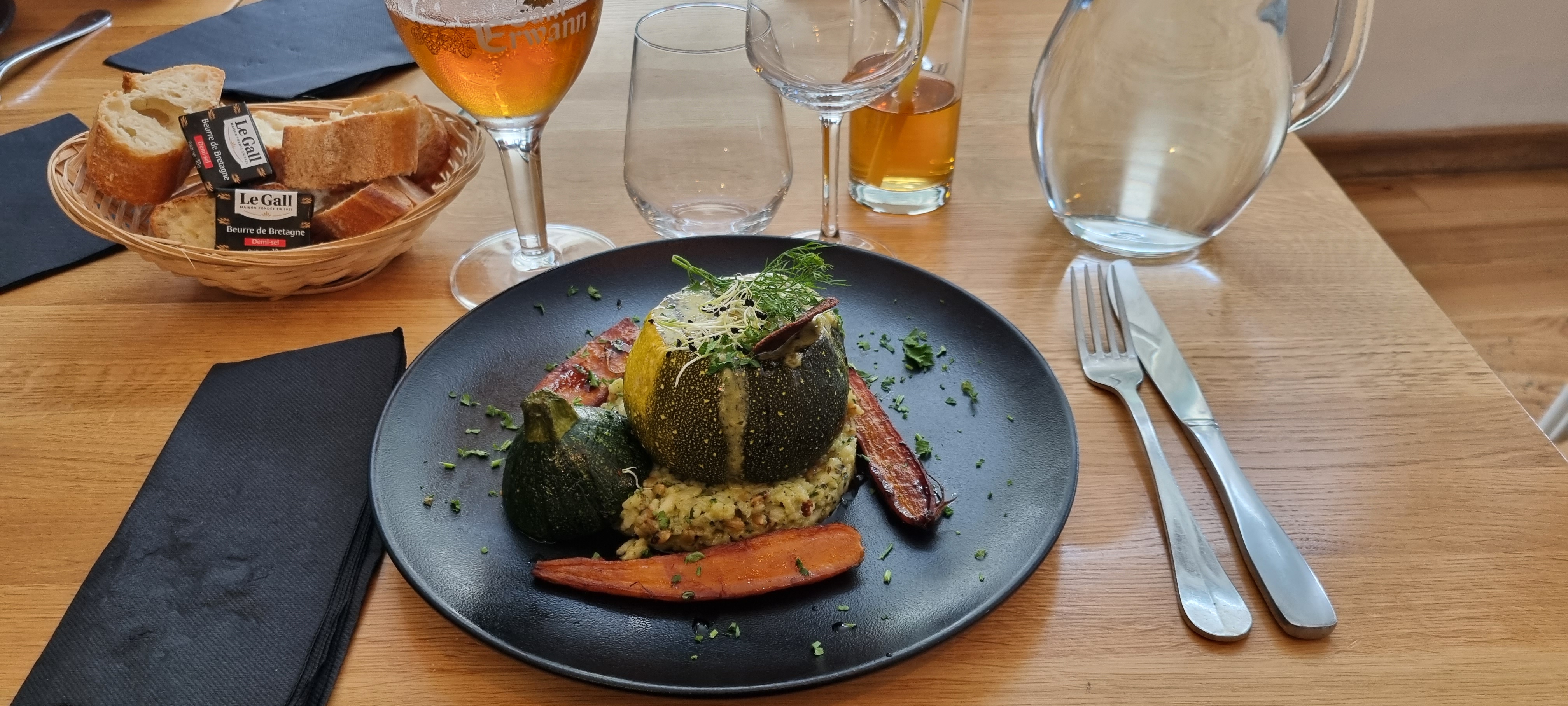 Les assiettes sont belles, Les associations de saveurs recherchées (le burger à l’artichaut et la tarte au citron au basilic 👍🏻) avec des préparations locales revisitées (farz, biscuit breton) Et le service est top. Je recommande en tant que végétarienne 🌱