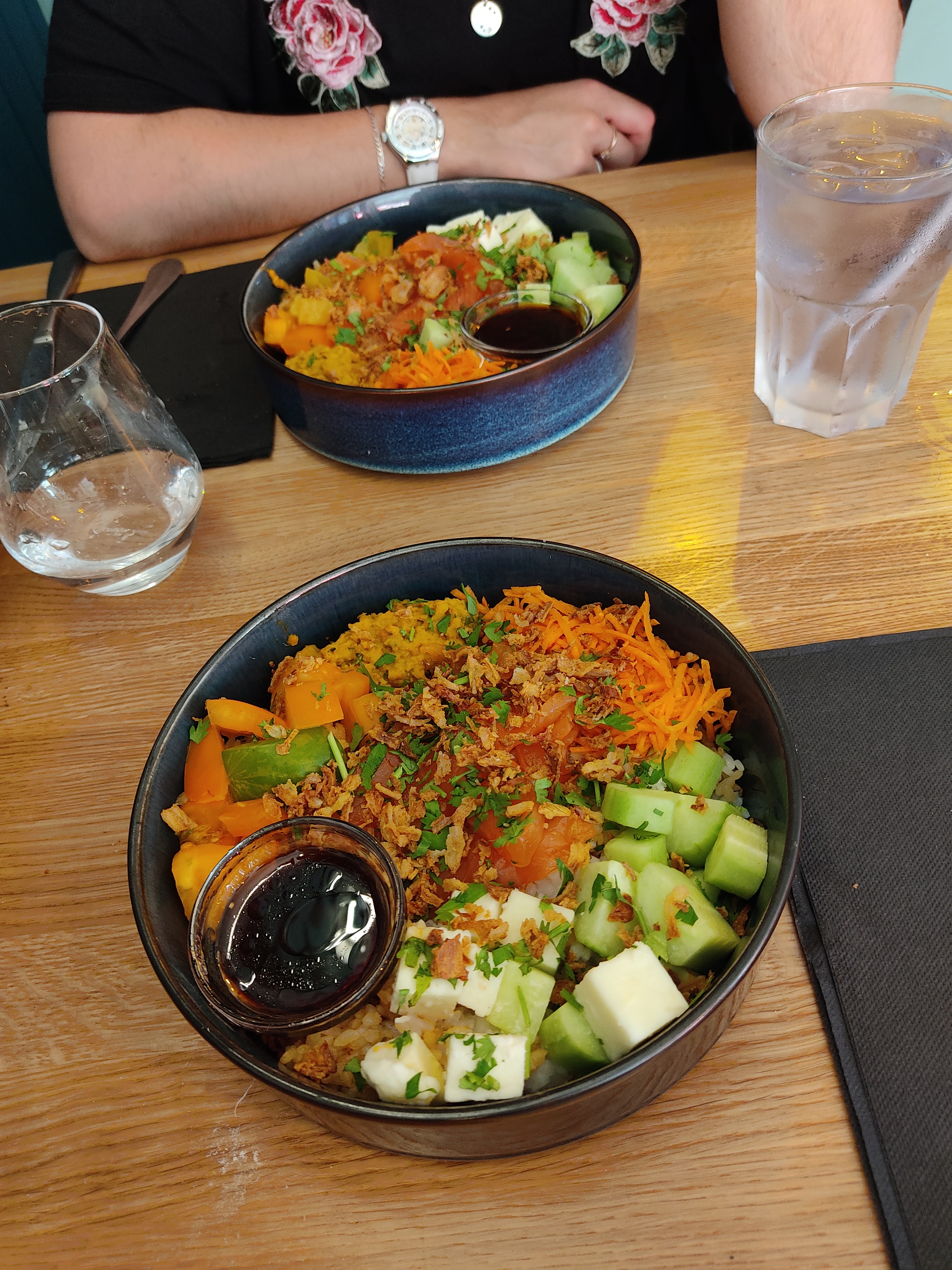 Nous avons dégusté le « rosko bowl » (saumon confit, riz vinaigré, carottes, radis, chou rouge, houmous, guacamole, oignons frits, menthe fraîche et une petite sauce à tomber... délicieux, frais, équilibré, copieux juste comme il faut et extrêmement bien assaisonné. Nous nous sommes régalés !!!