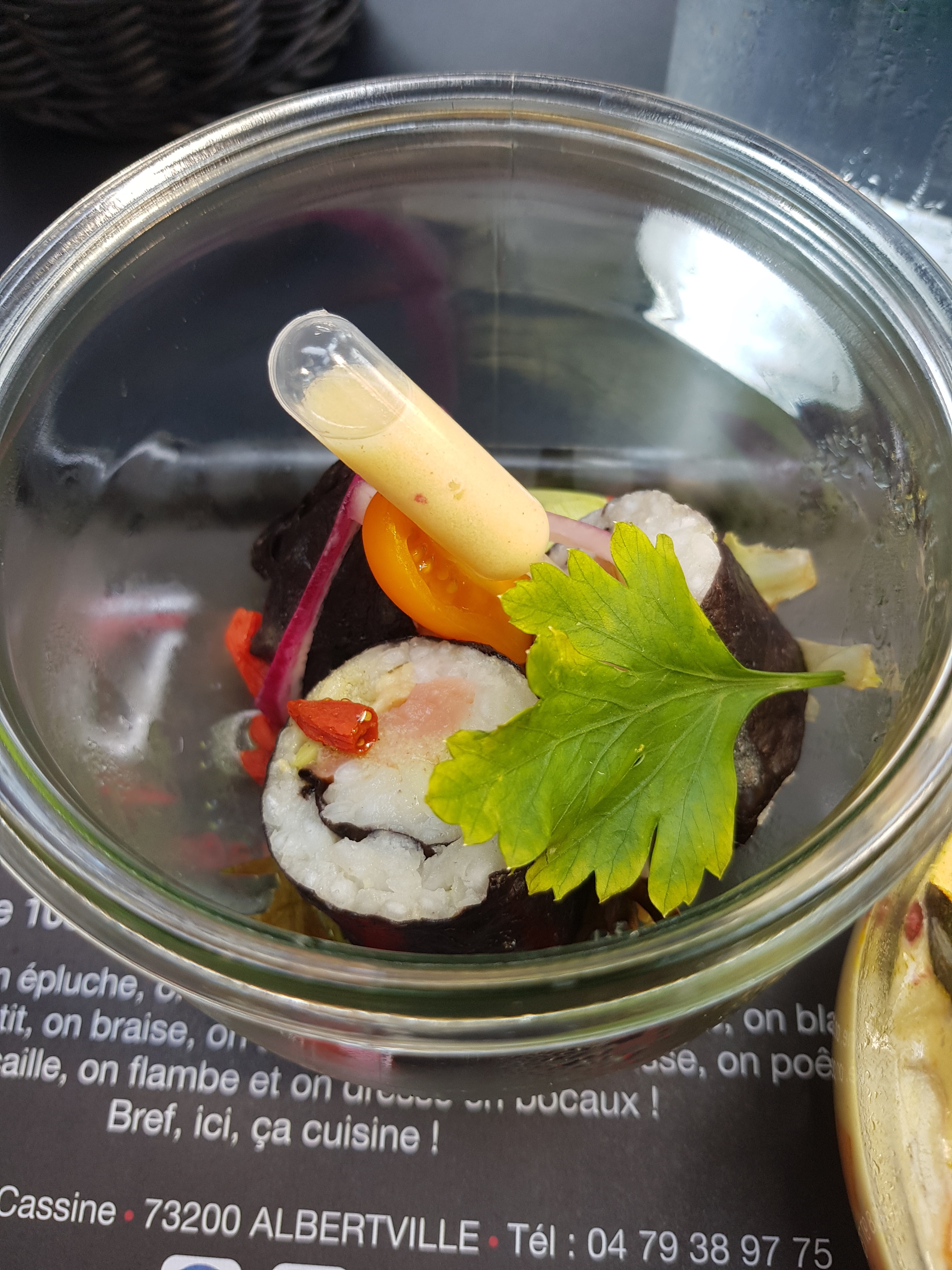 Nous ne connaissions pas du tout le concept de manger dans un bocal et nous avons été très agréablement surpris. Prit le menu et servit d'un coup..entrée,plat, dessert.! Les plats sont vraiment très bons ,très parfumés et bien cuisinés. Service rapide avec une équipe sympa..( même le café est en bocal..) je recommande vivement et dès que je repasse a albertville j'y retourne.