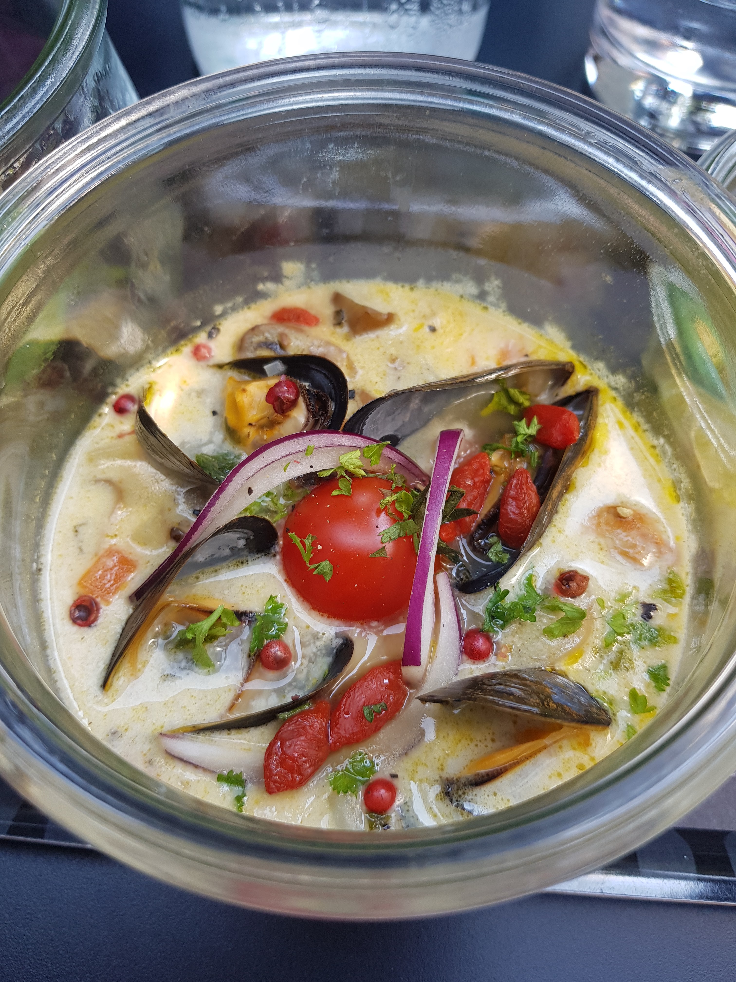 Concept très sympa, le repas entier est servi en une fois sur un plateau et chaque plat est dans un bocal, de l'entrée au dessert ! La vente peut se faire à emporter aussi, c'est une bonne chose 😊 La cuisine est de qualité, la croziflette mériterait un peu plus de reblochon et un peu moins de crème ;) Juste un petit peu refroidie sur le buzzer qu'on nous pose sur la table et qui indique qu'on doit aller chercher notre plateau si le serveur n'a pas le temps de l'amener. Peut-être parce que ce n'est pas habituel d'un restaurant, je suppose qu'il faut accepter ce concept aussi :) ça n'enlève rien à l'accueil et au reste qui étaient bien !