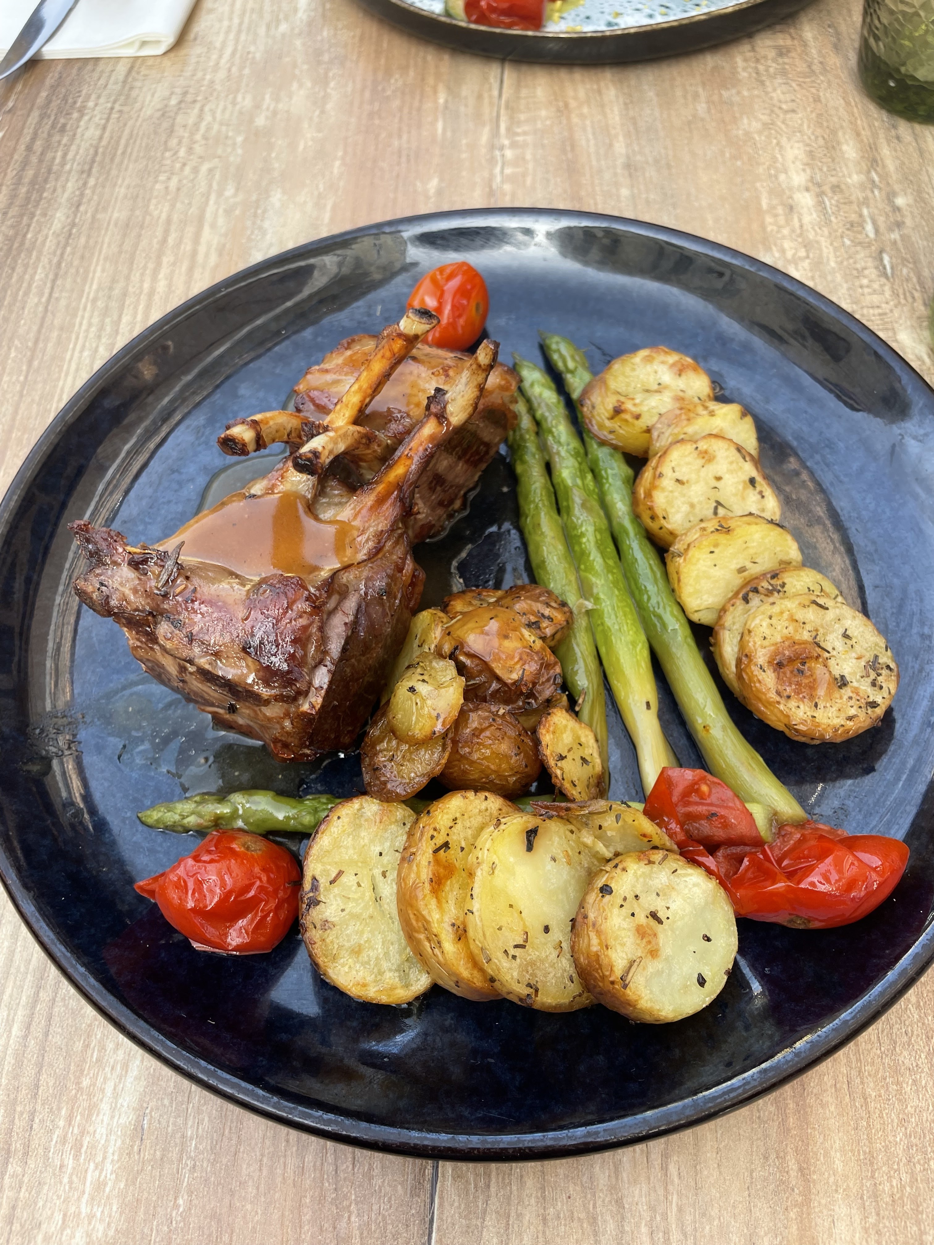 De passage à Nice, nous avions les belles photos du plat Côte d’agneau avec asperges et pommes de terre postées la veille J’ai repris ce plat en ayant 4 rondelles de pommes de terre et 3 asperges, très déçu pour 28 euros le plat seul Dommage car la viande était très bonne mais les accompagnements étaient très minces Mon épouse a eu une salade cesar avec très peu de tomates et surtout des feuilles de salade et sauce