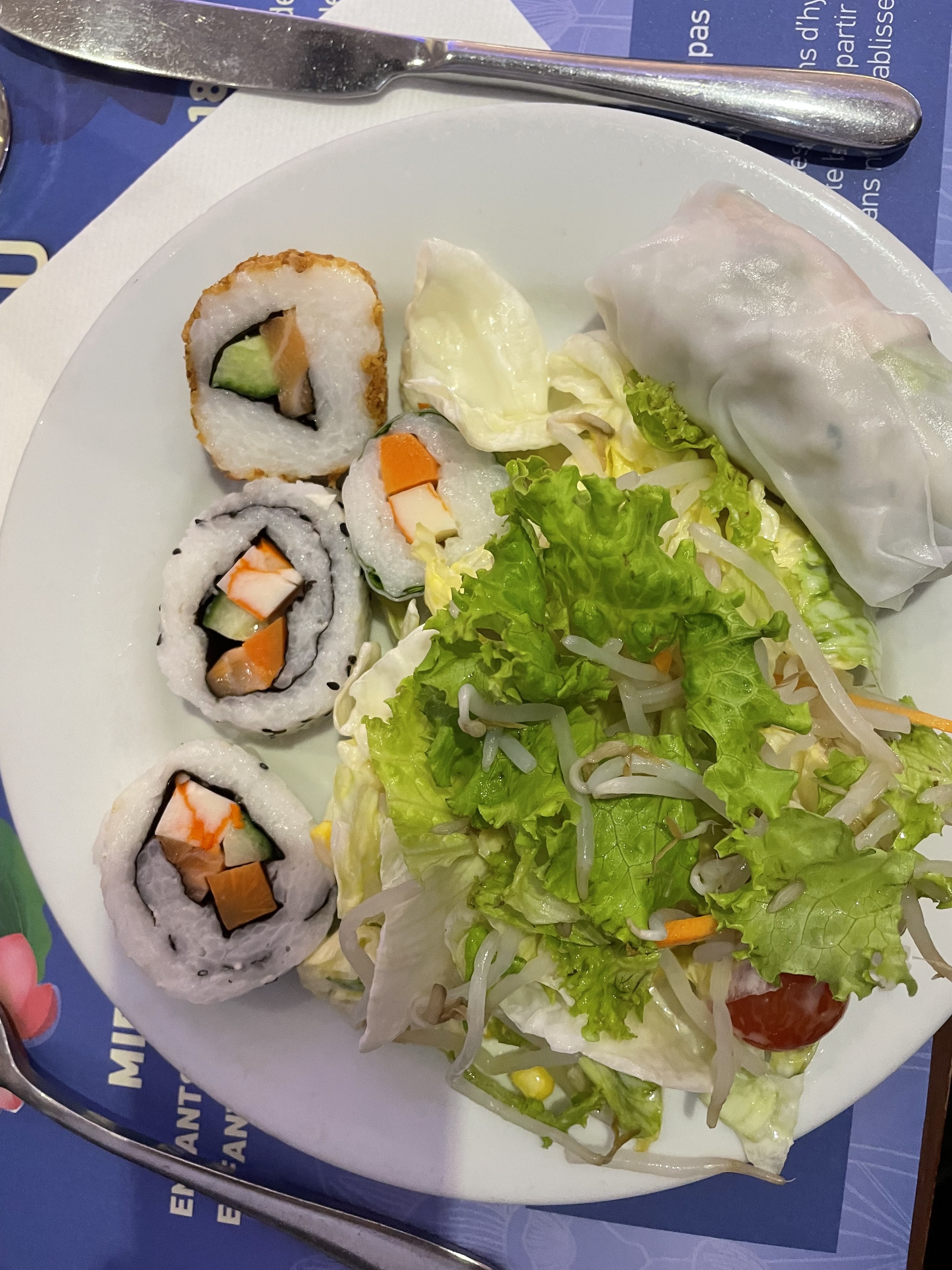 Je n'y était pas allée depuis des années ! Habitué à un autre restaurant j'ai voulu tester... je n'y remetterais plus les pied !!! Sushis beaucoup trop gros. Rouleaux de printemps végan ! Sans compter le tarif ! Faire payer 9,90€ un buffet pour des enfants de 3 ans qui mangent 4 nuggets, une portion de frites et une glace ! Un jus d'orange plein de flotte leurs a été offert ! 🙄 Je me suis faite entendre en caisse, aucune réaction, la dame était la avec son appareil à carte ! Genre Paye et Tais toi ! 🤬😡