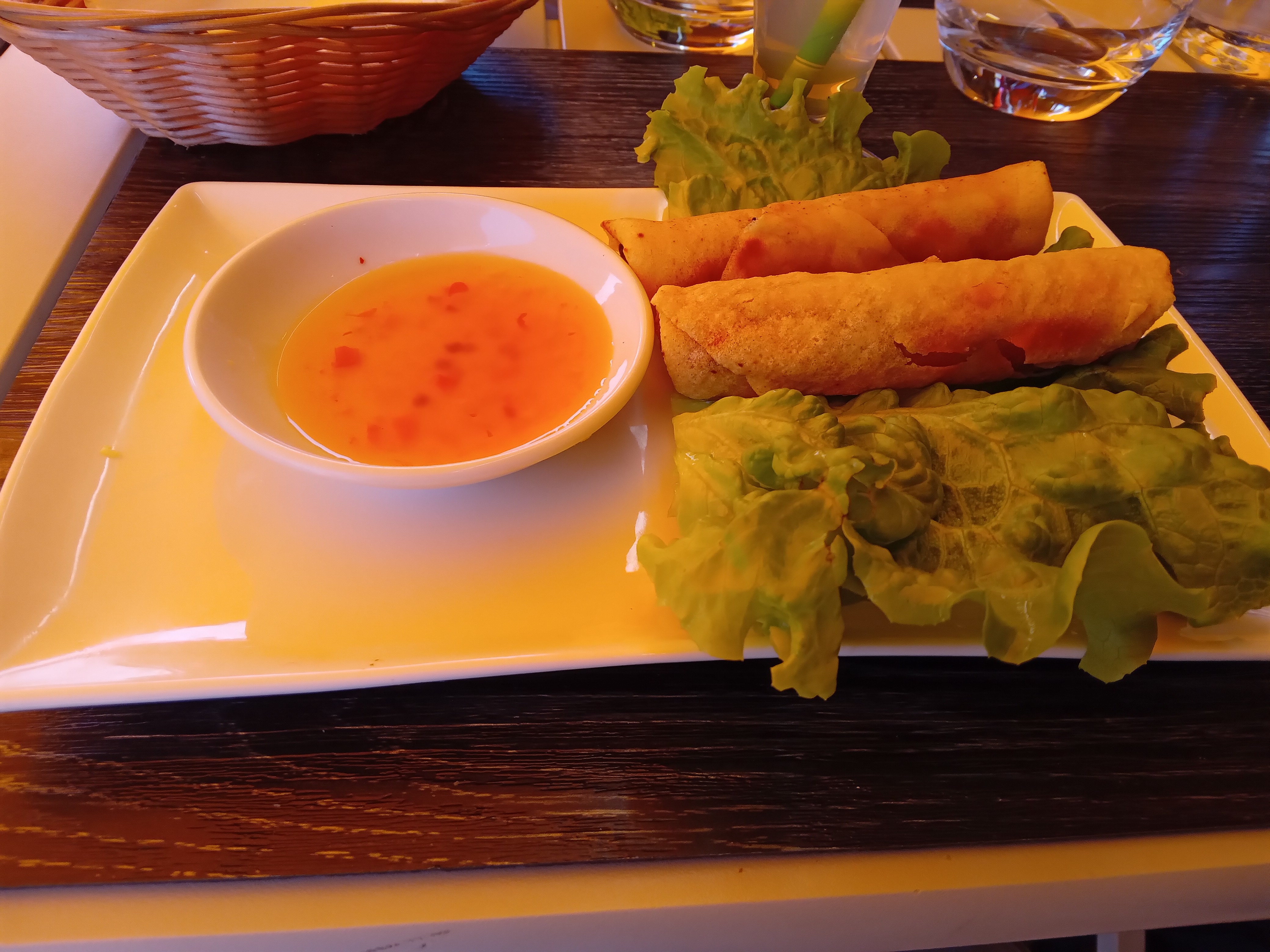 Les plats sont copieux à peine assez goûté, les rouleaux de printemps super bon, très bon accueil prévoir vêtement il ne fait pas très chaud en salle