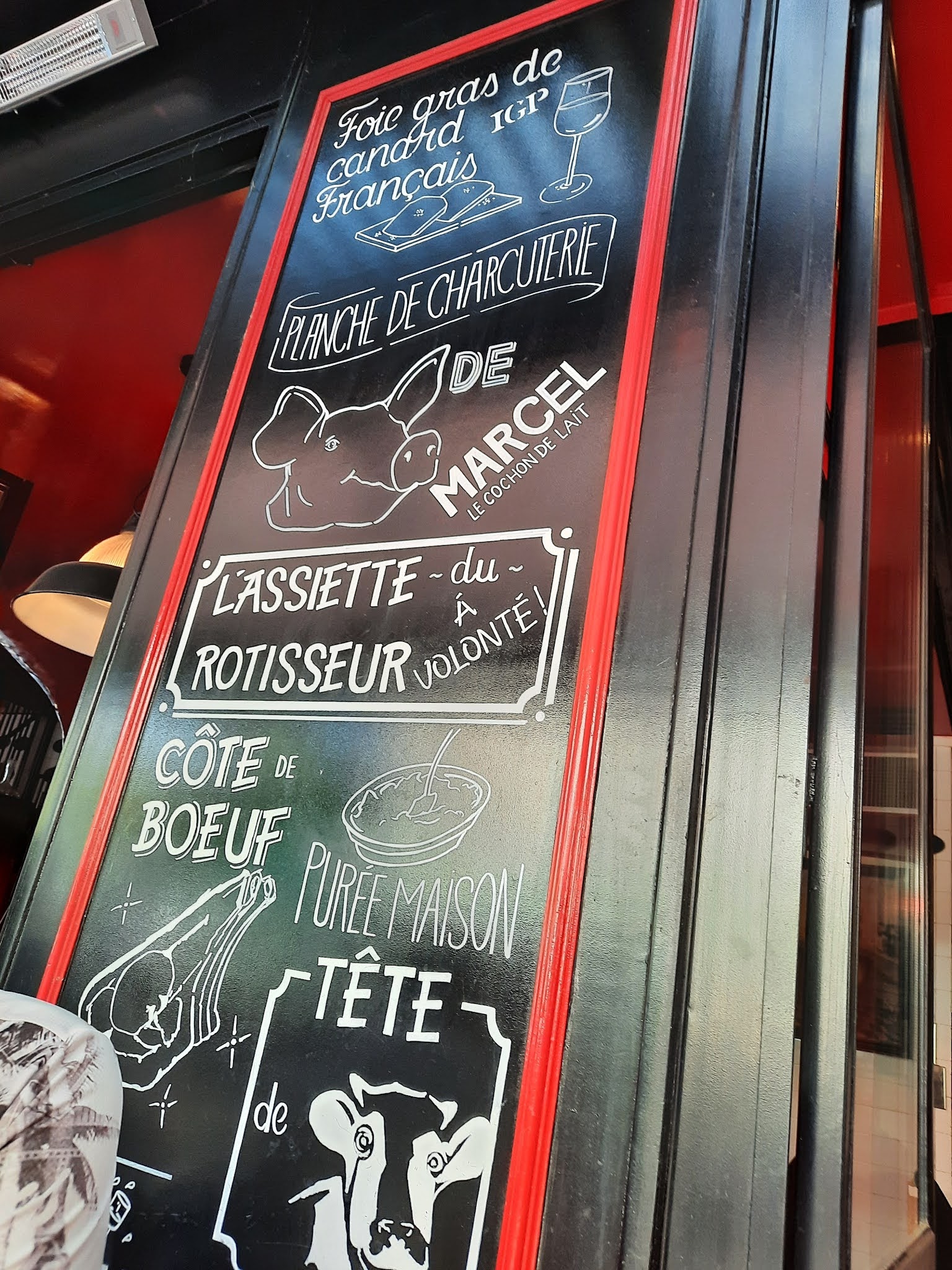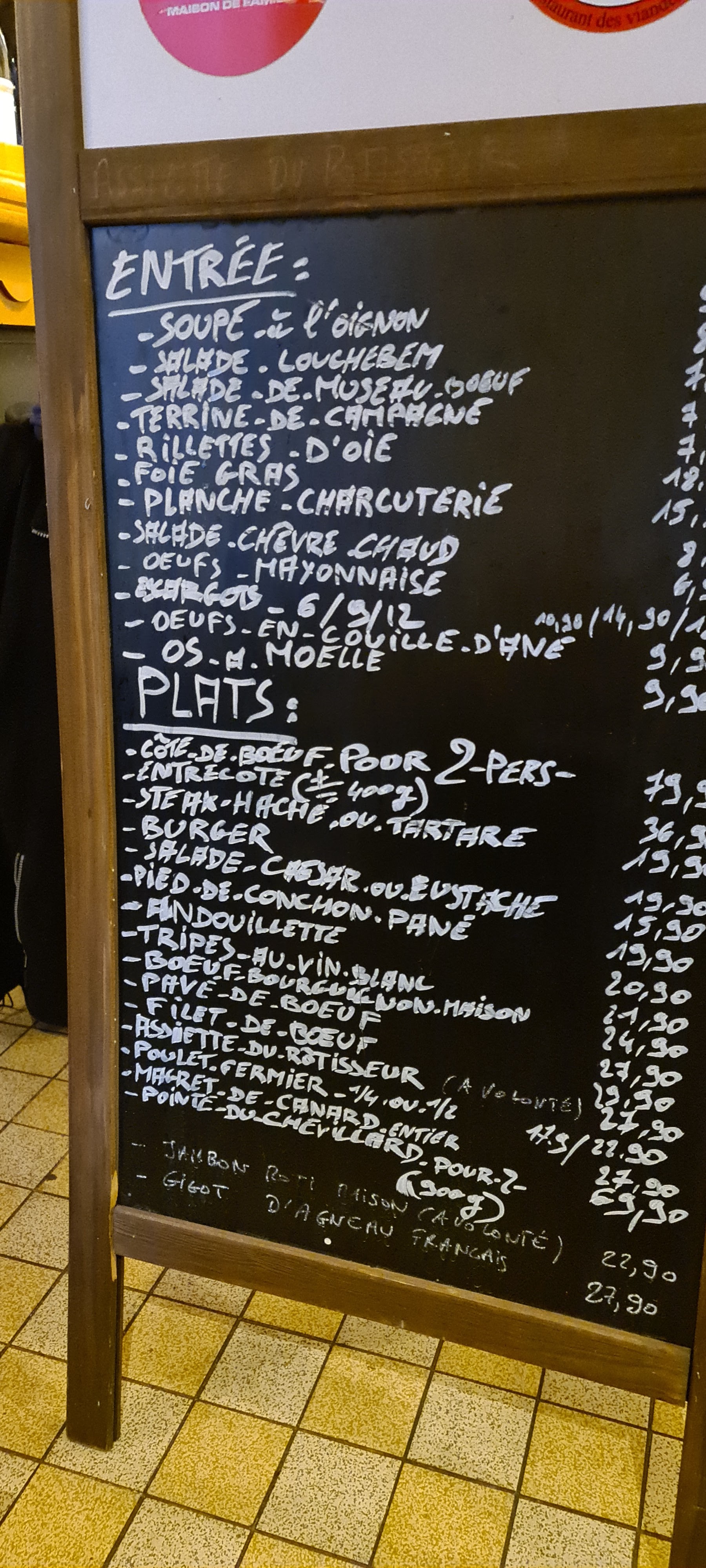 2 étoiles et je reste généreux. J'ai entendu parler du louchebem depuis ma tendre enfance, c'est dire si je me faisais une joie de découvrir ce restaurant. Nous sommes accueillis sans plus. Nous choisissons notre table (peu de monde) en extérieur. On nous amène un grand paneau avec tous les plats proposés, on nous donne la carte des vins et puis........débrouillez vous. Ma femme voulait un onglet mais ce n'était pas proposé (étonnant pour un restaurant de viande). Finalement le serveur arrive et on lui demande s'il est possible d'avoir un onglet. Il acquiesce. Nous lui demandons le prix, il ne sait pas et va se renseigner. Il revient et annonce 27.90eur, j'espère qu'à ce prix là il sera conséquent. Pour ma part un quart de poulet fermier. Le vin au verre, sur la carte, est proposé à 6.90eur. Soit, va pour un verre de Bordeaux rouge pour ma compagne. Étonnamment les plats arrivent très vite mais malheureusement refroidissent aussi très vite. En garniture une poignée d'haricots verts (une petite poignée) et une quantité ridicule de pommes frites. À ce prix là c'est chiche. Les plats ne sont pas mauvais mais n'ont rien de particulier en plus. On s'attend à une cuisson particulière, un fumet, enfin un petit plus quoi. Pas de dessert, nous demandons l'addition. Ma femme remarque que le verre de vin a été facturé 7.90eur alors qu'il est à 6.90eur sur la carte. Le même serveur ose lui dire que c'était le vin du jour, alors que ce vin est sur la carte et affiché à 6.90eur (voir photo). Aucun mot d'excuse, il revient avec une note corrigée et au moment de payer (ticket restaurant et carte bancaire), il rajoute les 1eur encore une fois sur le montant à payer. Je me retiens de lui dire ce que je pense et je reste calme. Trop de couacs, viande sans plus, service incorrect. Désolé, je ne ferai pas de pub pour ce restaurant. Alors Mesdames et Messieurs les clients, vérifiez toujours l'addition car je doute fort être le seul client à qui l'on aura facturé des euros de trop sur la note.