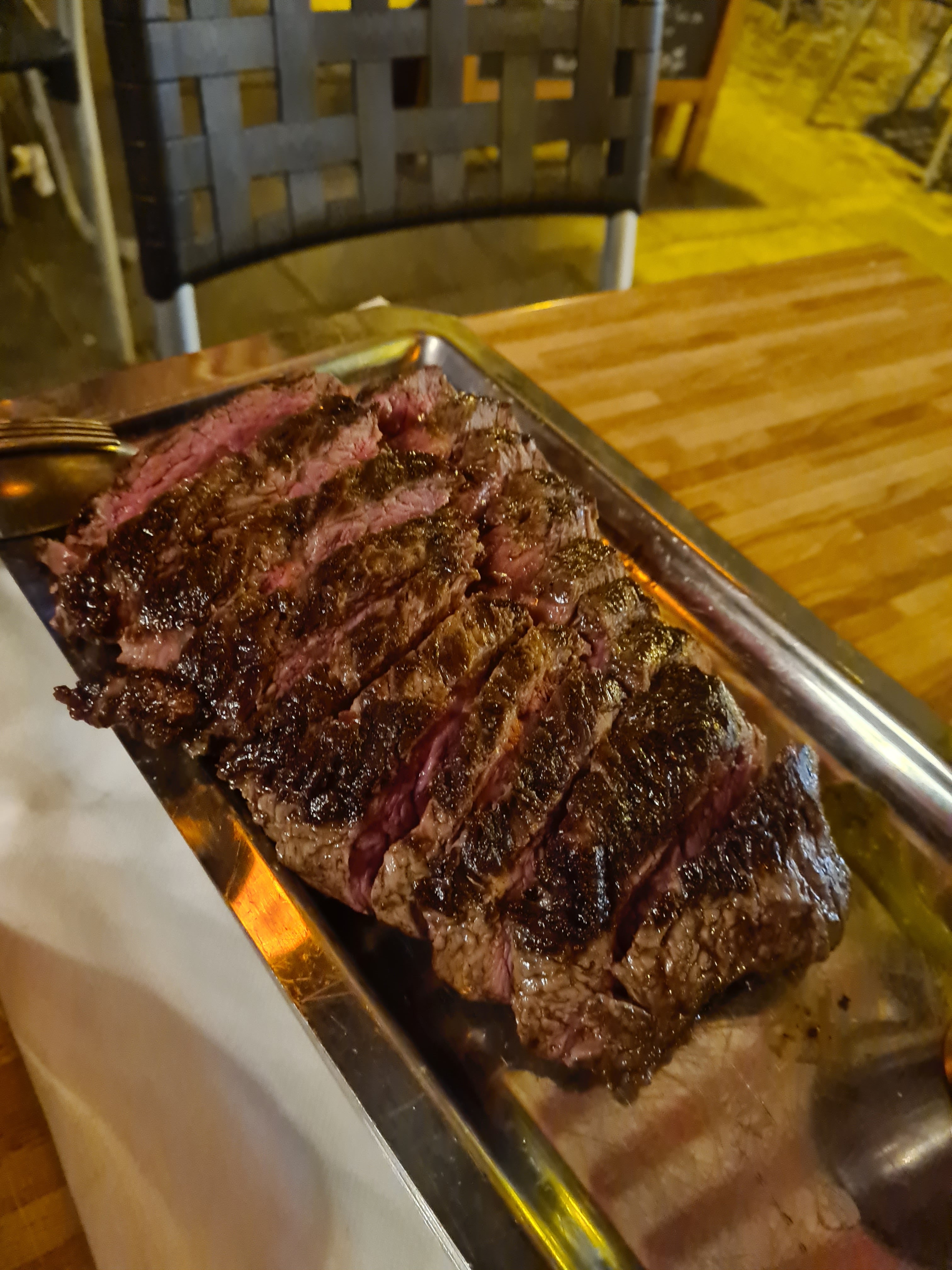 Nous avons commandé une entrecôte maturée. Le serveur ne savait pas me répondre quelle race de bœuf et combien de semaines de maturation, la pièce était proposée. Nous avons demandé une cuisson saignante et nous l’avons reçu bleue. La pièce était à peine passée sur la poêle, moins 2 min par côté pour une épaisseur de 4cm, c’est un scandale pour un restaurant spécialisée dans la viande bovine. La viande était sèche, sans saveurs, non assaisonnée. La base et les fondamentaux sont bâclées. Le service était à l’écoute car nous avons du renvoyer la viande 2 fois en cuisine. Un morceau de bête très mal honorée.