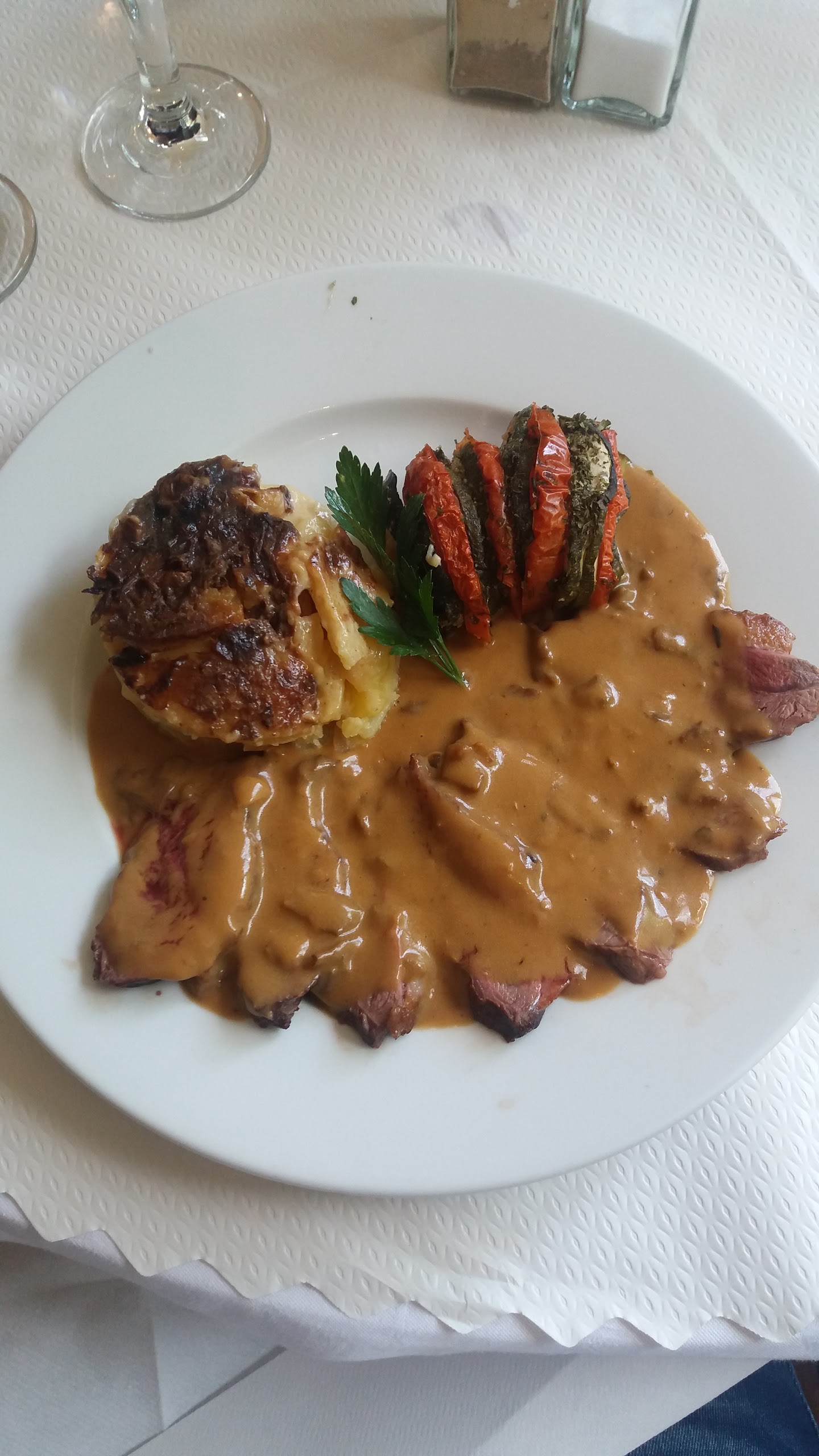 Nous avons très bien mangé à ce restaurant romantique. Je conseille fortement l'entrecôte au four pour deux, servi avec un gratin dauphinois, des légumes, sauce béarnaise et roquefort et des oignons caramélisées ; il était délicieux et la cuisson saignante parfaite. Décor sympa, toilettes propres. Une bonne expérience.