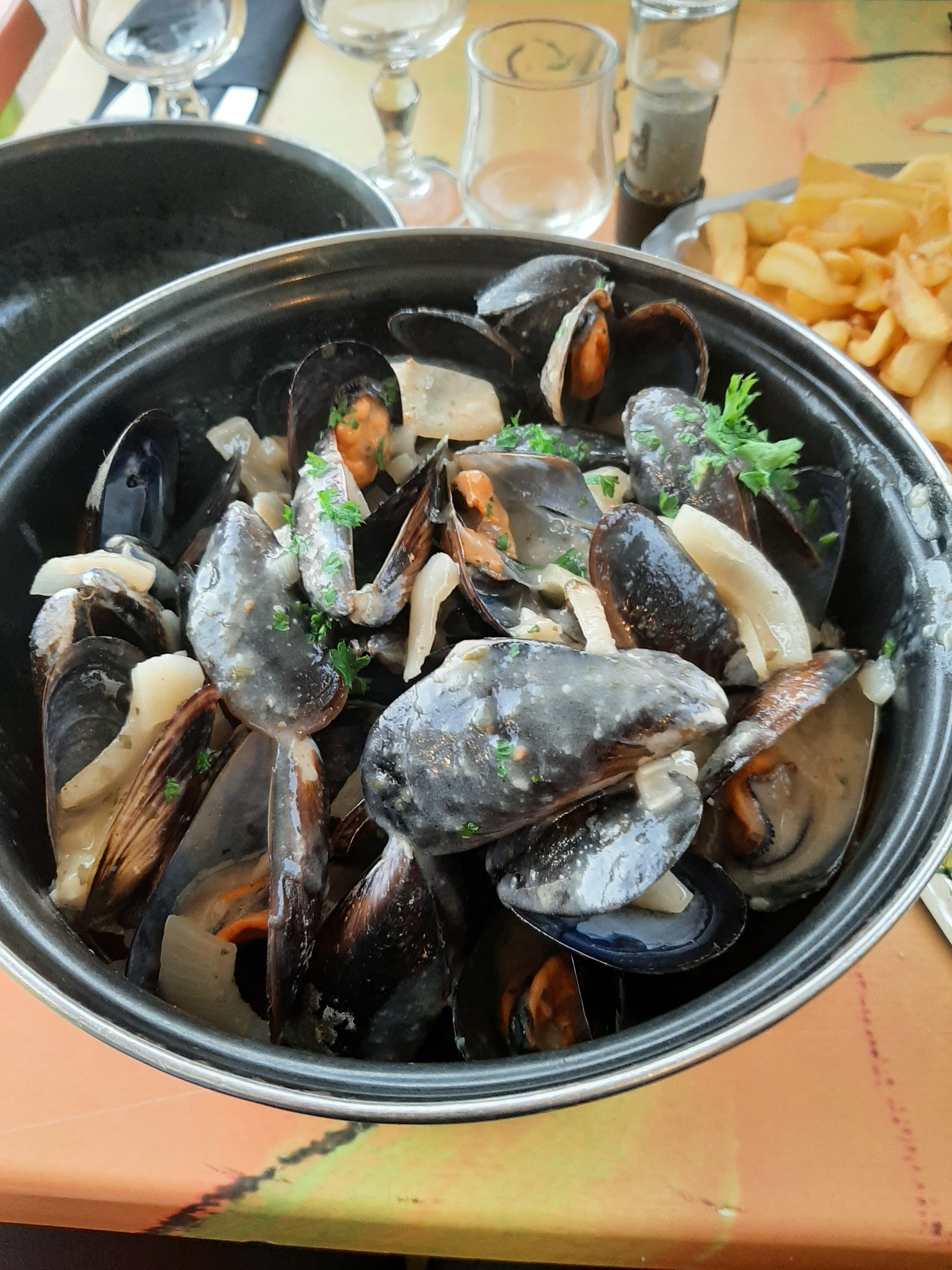 Nous avons été très déçu, nous avons attendu très longtemps avant d'être placé, sous les plus de 30°,en suite le service à été aussi long, ou nous avons commandé deux moules frites, avec très peu de frites et des moules marinières sans vin blanc, et sans sel.. ☹️☹️