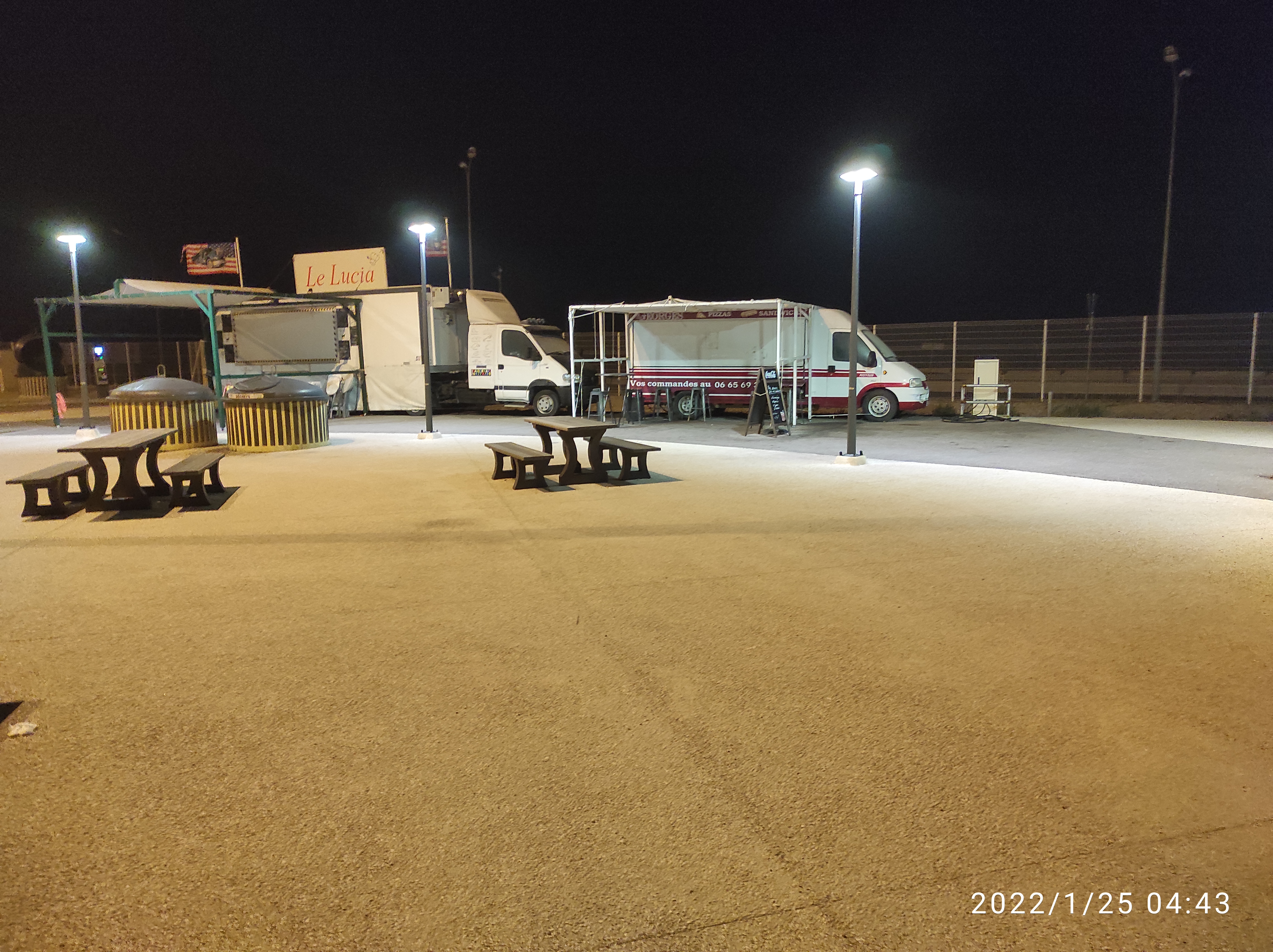 Parking avec douche. Coût 10 € pour 11 heures. Bon parking propre. Il y a 2 food trucks, ouverts à partir de 7h00.