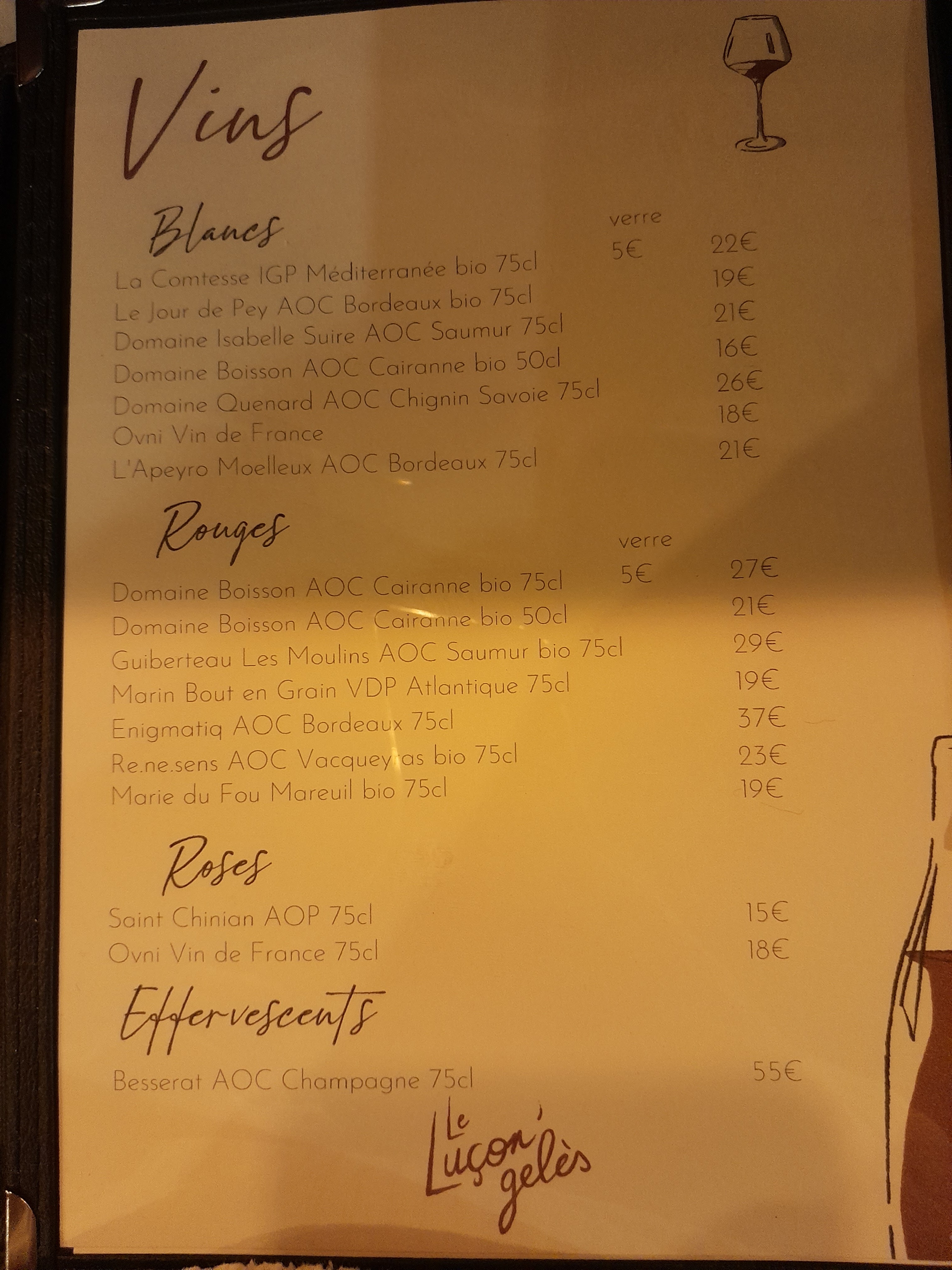 Un service très sympa et serieux...du choix pour les whisky et les vins .une belle carte avec des plats variés....que du frais....cuisine excellente et belle présentation...dommage il n y avait pas de tiramisu.....vin rosé sec st Chinian...prix très corrects