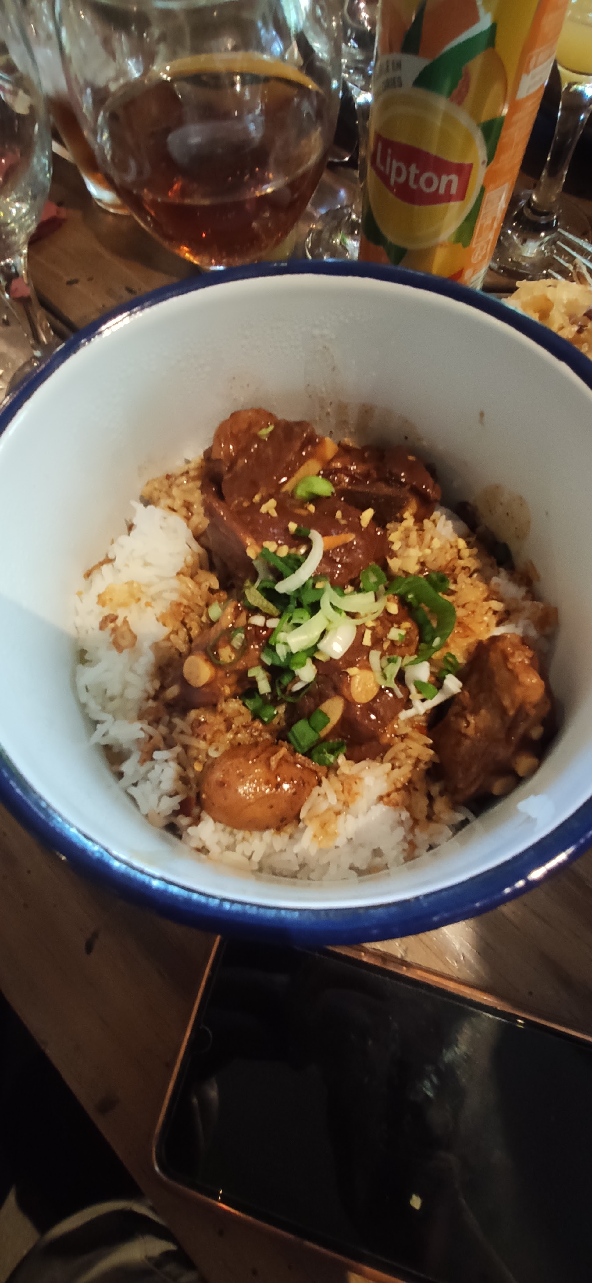 J'ai pris un menu un dimanche soir à 22,90€ Entrée - Plat - Dessert Nems tout à fait correct, je les préfère plus garnis mais j'ai des références très élevées donc difficile de vraiment me satisfaire en matière de chả giò (nems) Des boulettes de bœuf au gingembre mijotées à la sauce soja épaisse, très sympa, et c'est une première fois pour moi J'ai goûté les aubergines préparées de la même manière et pour les végétariens c'est parfait, même goût avec un très léger croquant, aubergines légèrement frites j'imagine puis mijotées dans cette sauce de soja épaisse, vraiment très bien. Les travers de porc doivent être excellents avec cette recette Pour finir, perles de tapioca au lait de coco et mangue, servi frais, très bon, pas trop sucré, un classique bien maîtrisé, revu à la mangue, parfait