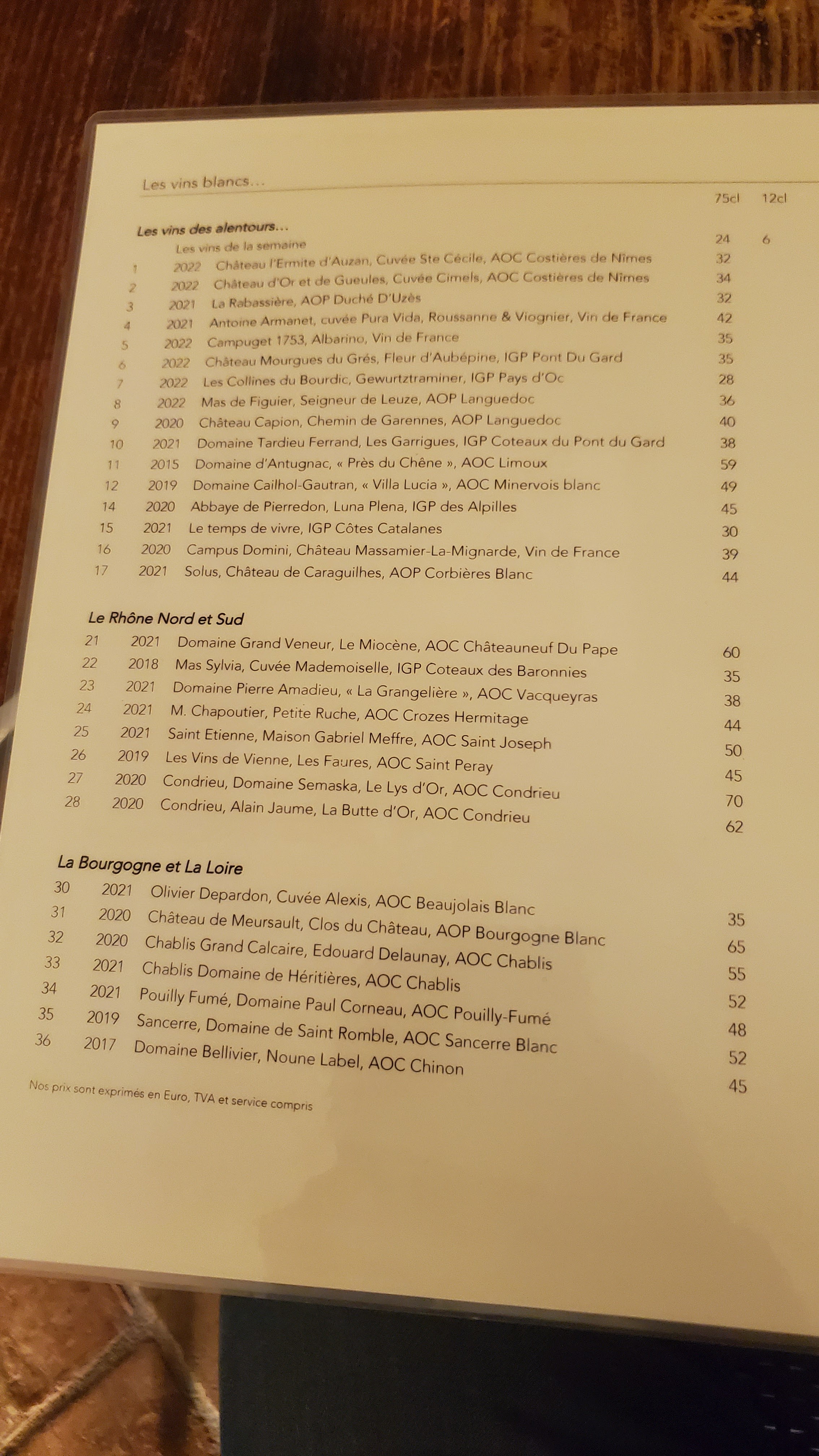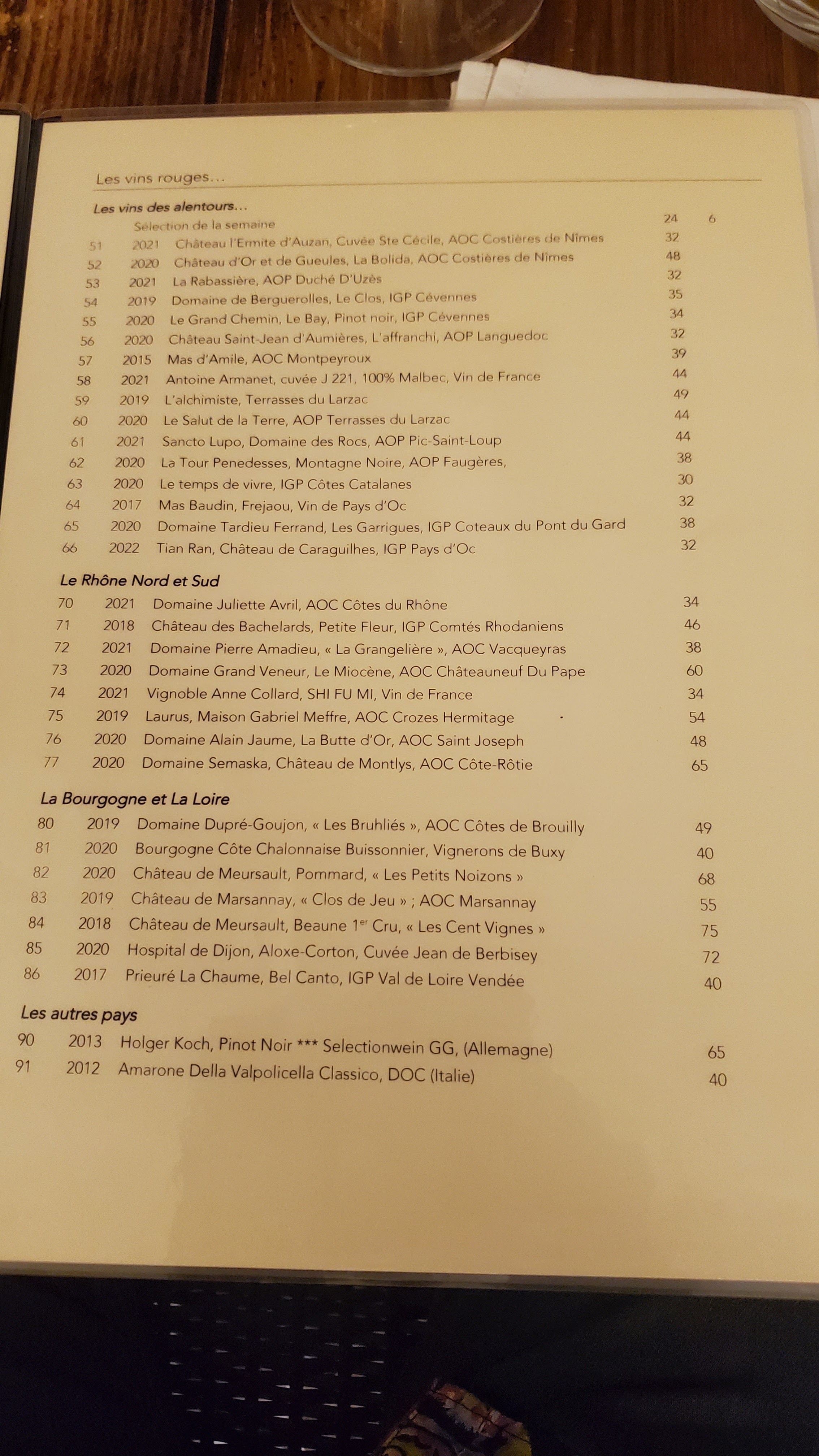 Bonjour Très joli cadre Un service trop lent Un peu déçu par le menu l’agneau confit laisse un mauvais souvenir Le vin excellent mais c’est une question de choix mon ami a choisi un Pommard on avait peu de chances d’être déçus