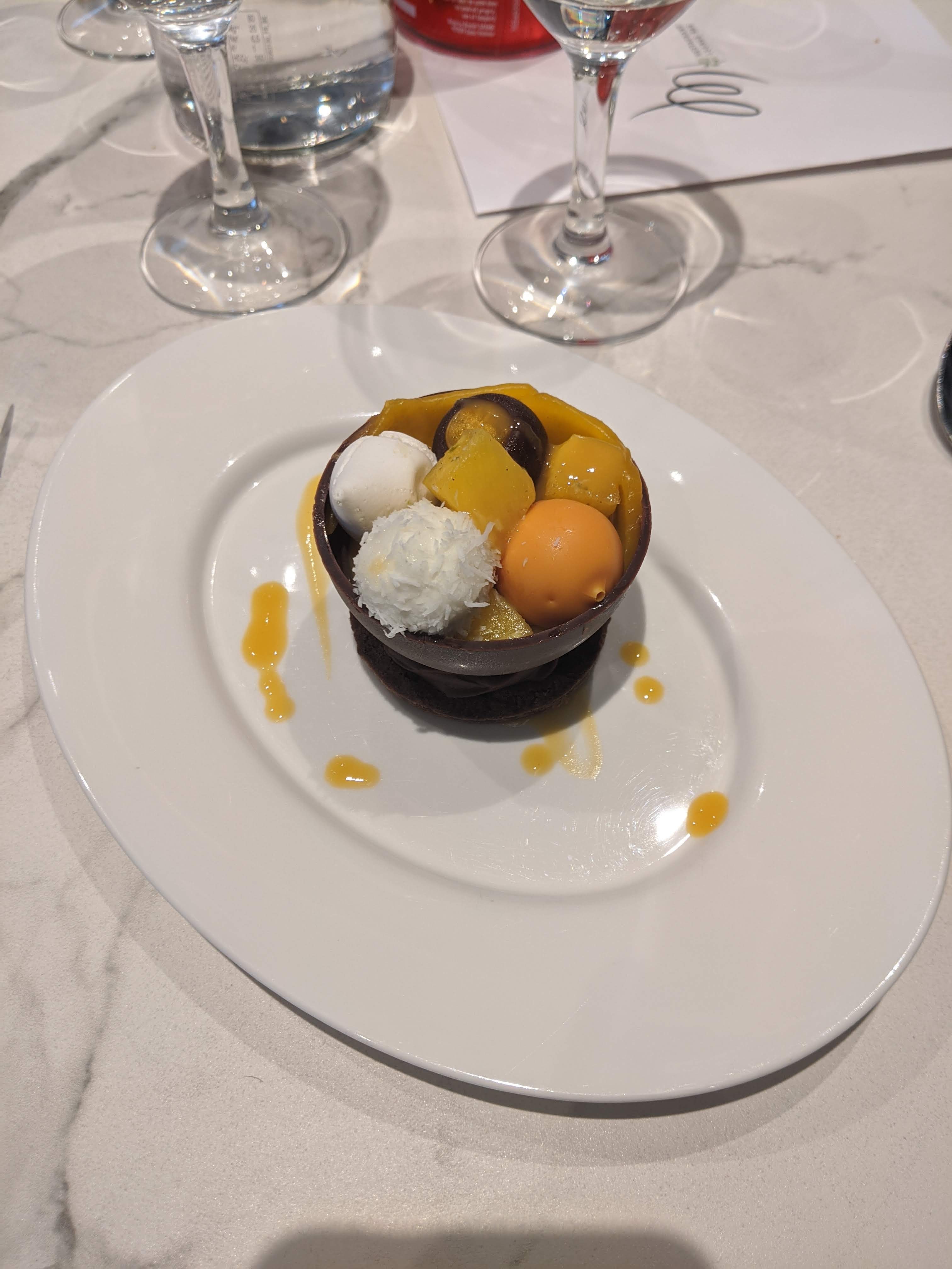 Un excellent moment gustatif démarré par une coupe de champagne au parfum d'hibiscus et qui s'est terminé sur une scenette autour du chocolat. Service attentionné. Bravo.