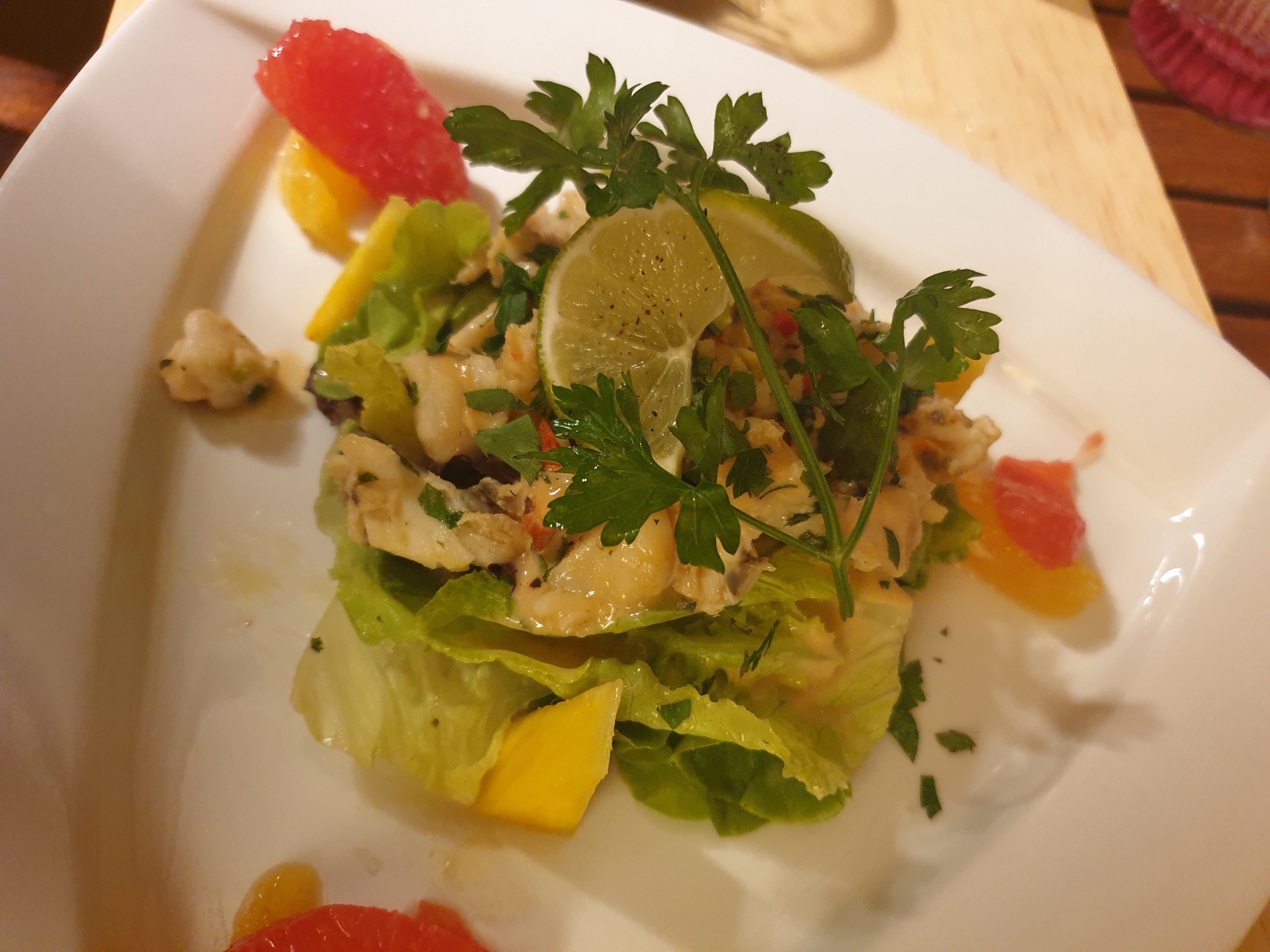Cocktail et ti punch bien comme il faut ! Tout d'abord le mojito : il a gout de rhum et pas d'eau. Le ti punch : on vous apporte ce qu'il faut et vous faite votre mélange (miam le 59° de Marie Galante). Bien fatigués de la journée, nous avons simplement fait apéro, entrée, plat. Rien à dire sur les plats... On regretterait de ne pas avoir été déraisonnables. Bref, le secteur n'est pas très attractif de nuit, mais arrêtez vous et passer le pas. A noter également que la cheffe est maitre restaurateur.