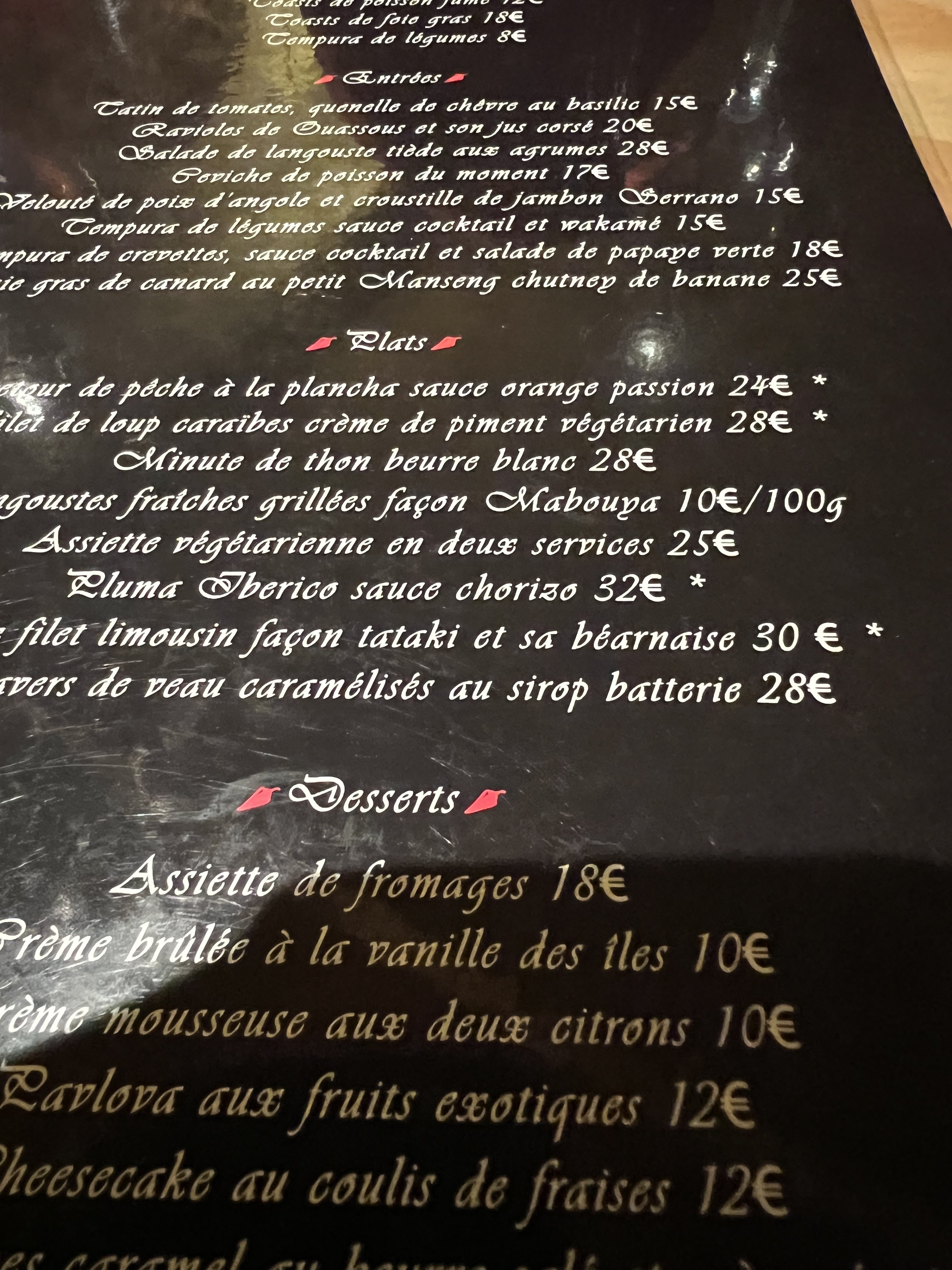 Très beau cadre. Le service est aimable et souriant. Bémol, la lenteur à laquelle arrive les plats (fin décembre, c'est pas la haute saison) La cave propose d'excellents vins sans être inabordable avec un très grand choix. C'est top La carte est simple et épurée, elle ne nous noie pas dans le choix. Les produits ne sont pas locaux (pas le poisson, dommage pour une ville de pécheur) . Les langoustes sont finalement aussi grosses que des écrevisses et importés. Dommage car la Guadeloupe en regorge. Les plats sont beaux, bien présentés mais c'est sans plus. Peu de saveur et pas grand-chose dans l'assiette ce qui est regrettable pour un prix qui reste excessif.