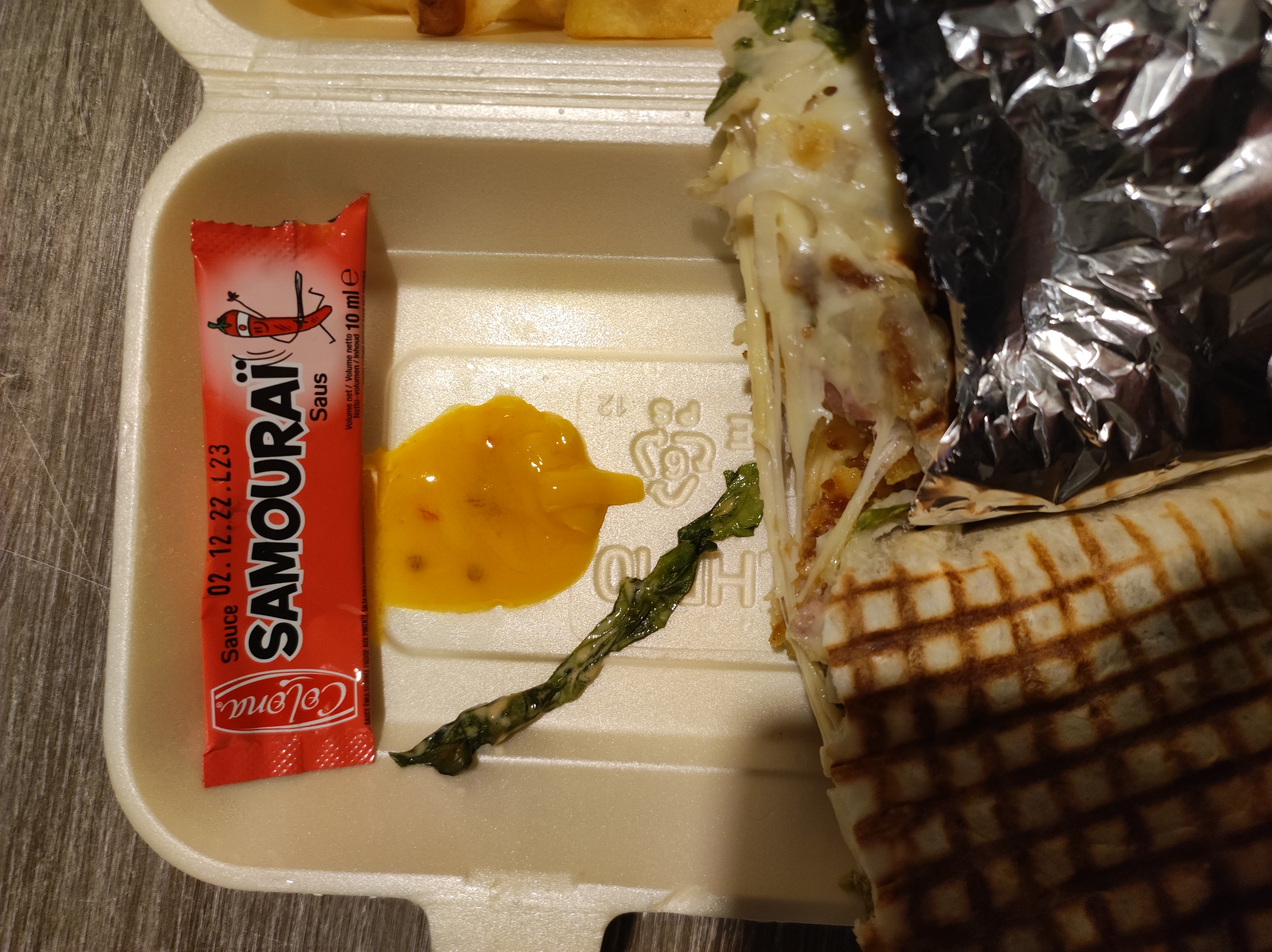 Tacos assez bon et de taille correct , frites pas assez cuite mais je laisse le bénéfice du doute avec la livraison etc.. Clou de spectacle sauce samouraï périmé du 22/12/22 pour une consommation le 17 /01/23!