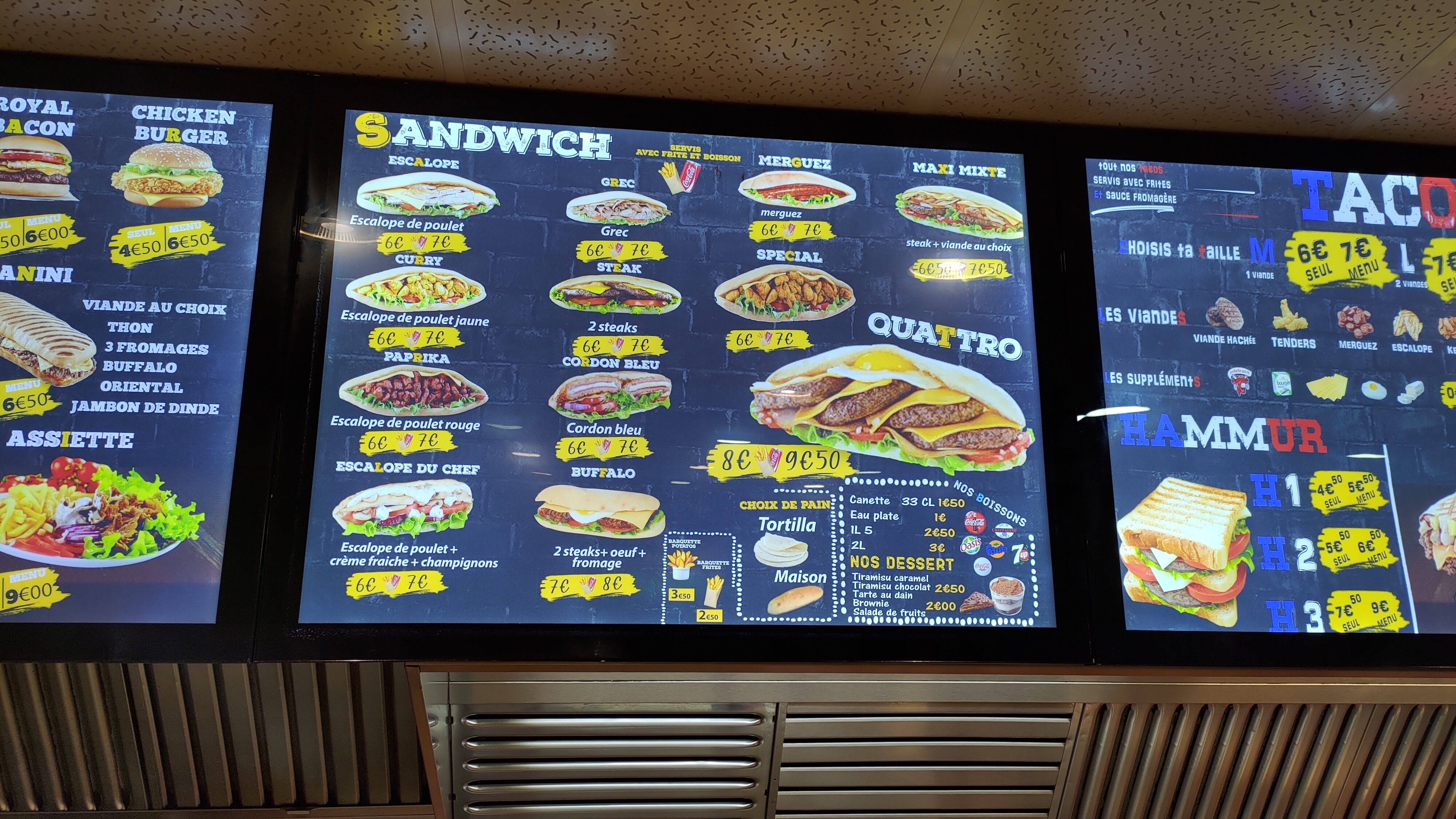 Grande salle. Sandwich variés et pizzas correcte. Évitez le sandwigh kebab par contre...et dernière chose les frites ont parfois le goût de l'huile rance, ils ne doivent pas la changé souvent.
