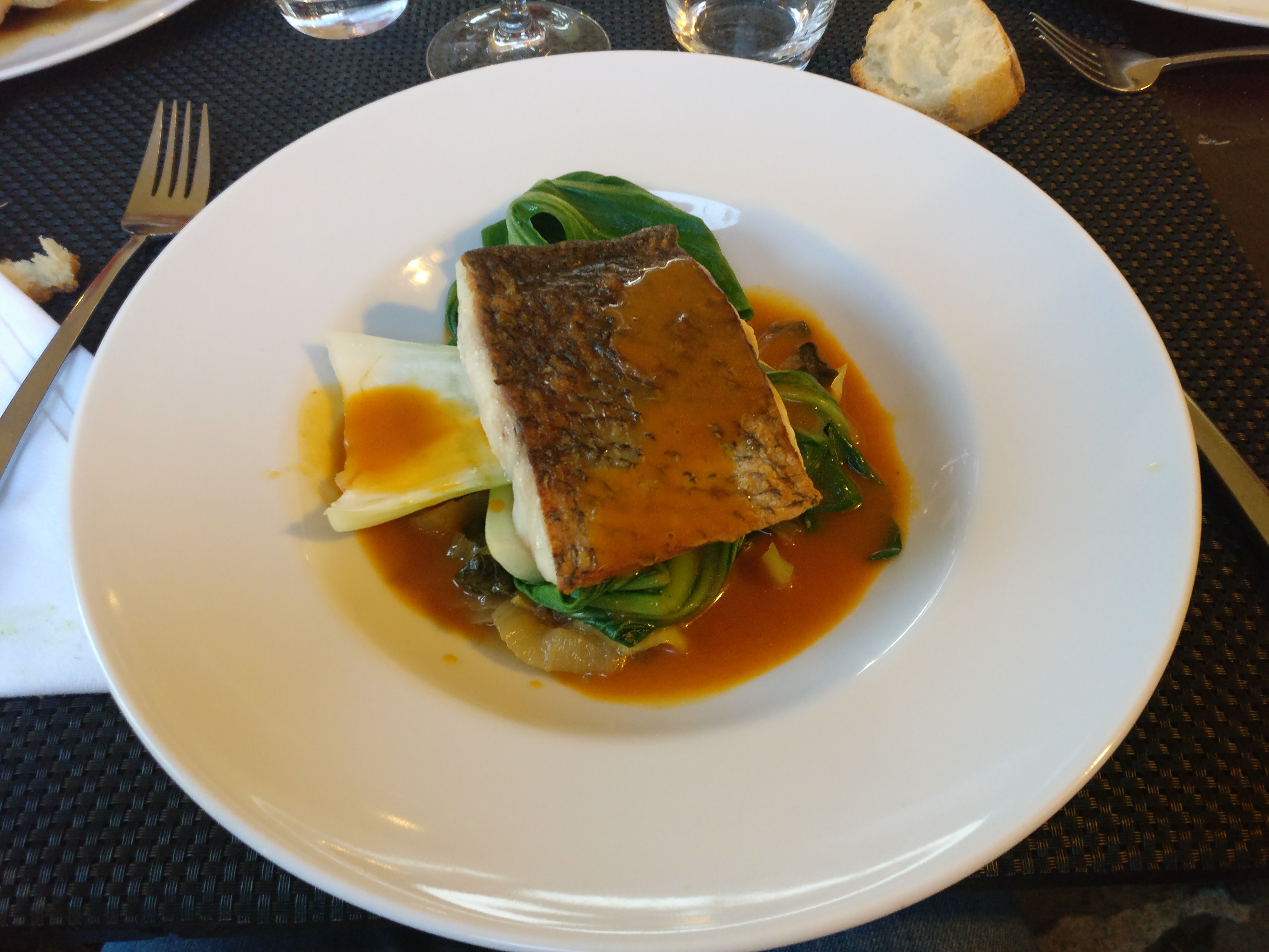J’ai eu 3 petites gambas (crevettes) servies avec les spaghettis à l’encre de sèche.. pour 34 euros le plat, le verre de vin blanc à 8 euros, j’ai pris du Bordeaux, trop sucré, je voulais un blanc sec, ça aurait été bien de me renseigner mais les serveurs sont très sympa..