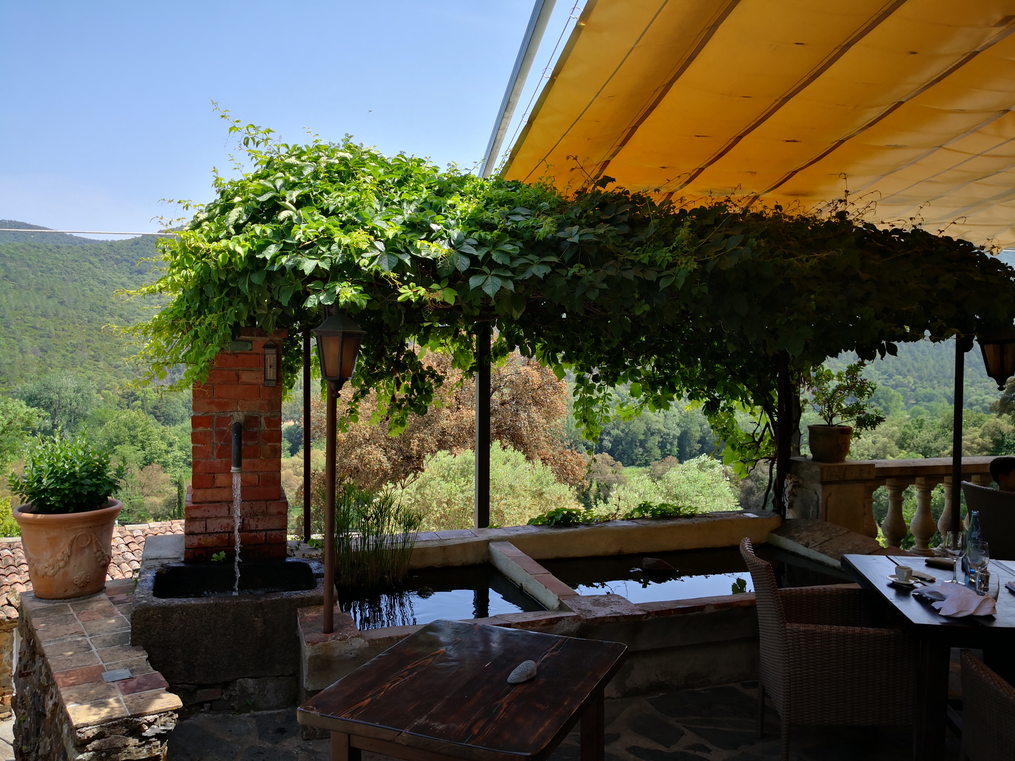 Malgré notre retard consécutif à un accident de la circulation bloquant la circulation, nous avons été très bien accueillis. Le repas fut servi sur une terrasse dominant la vallée avec une vue imprenable sur la chaine des Maures. Le repas de qualité fut accompagné d'un excellent rosé qui fut aussi apprécié par un papillon. Pas de nuisance sonore. Un lieu à recommander.