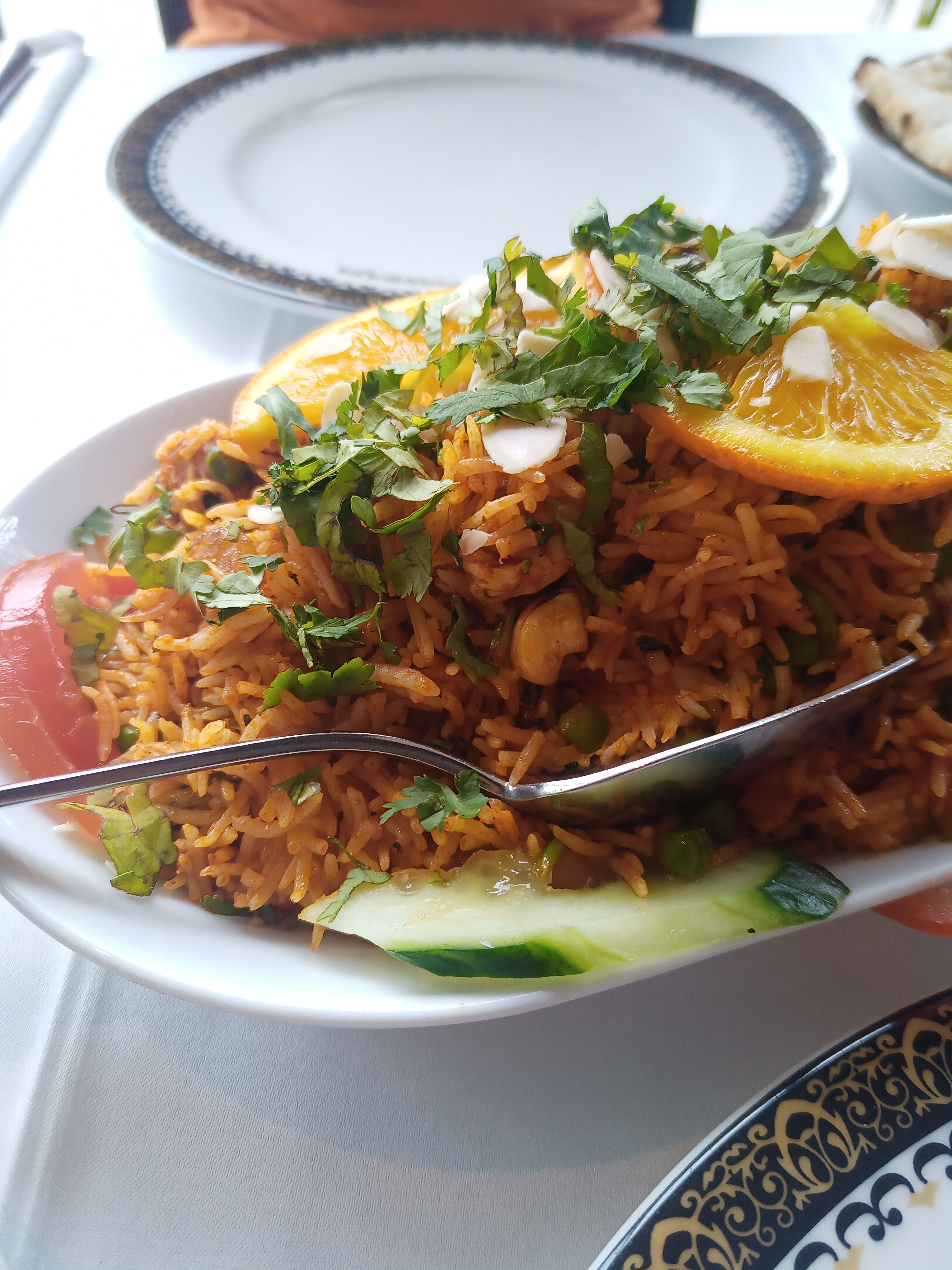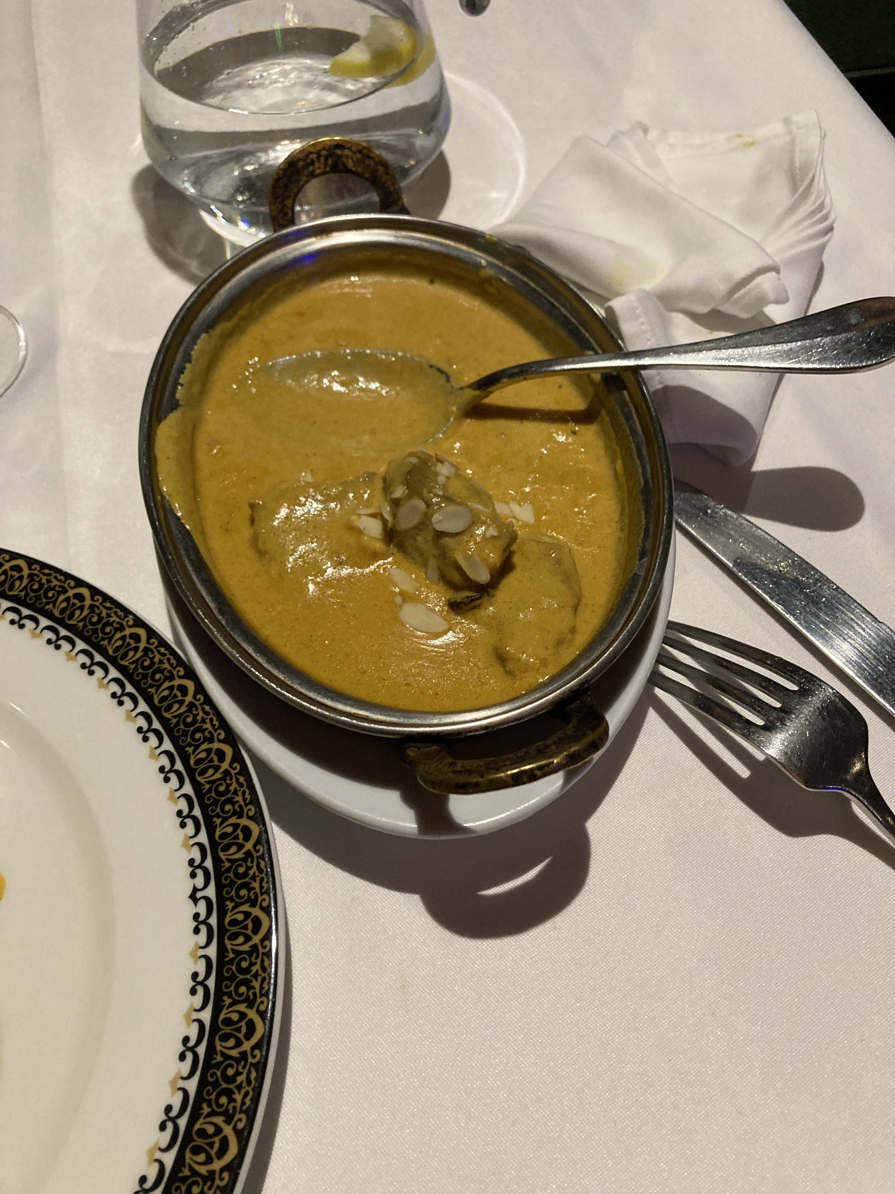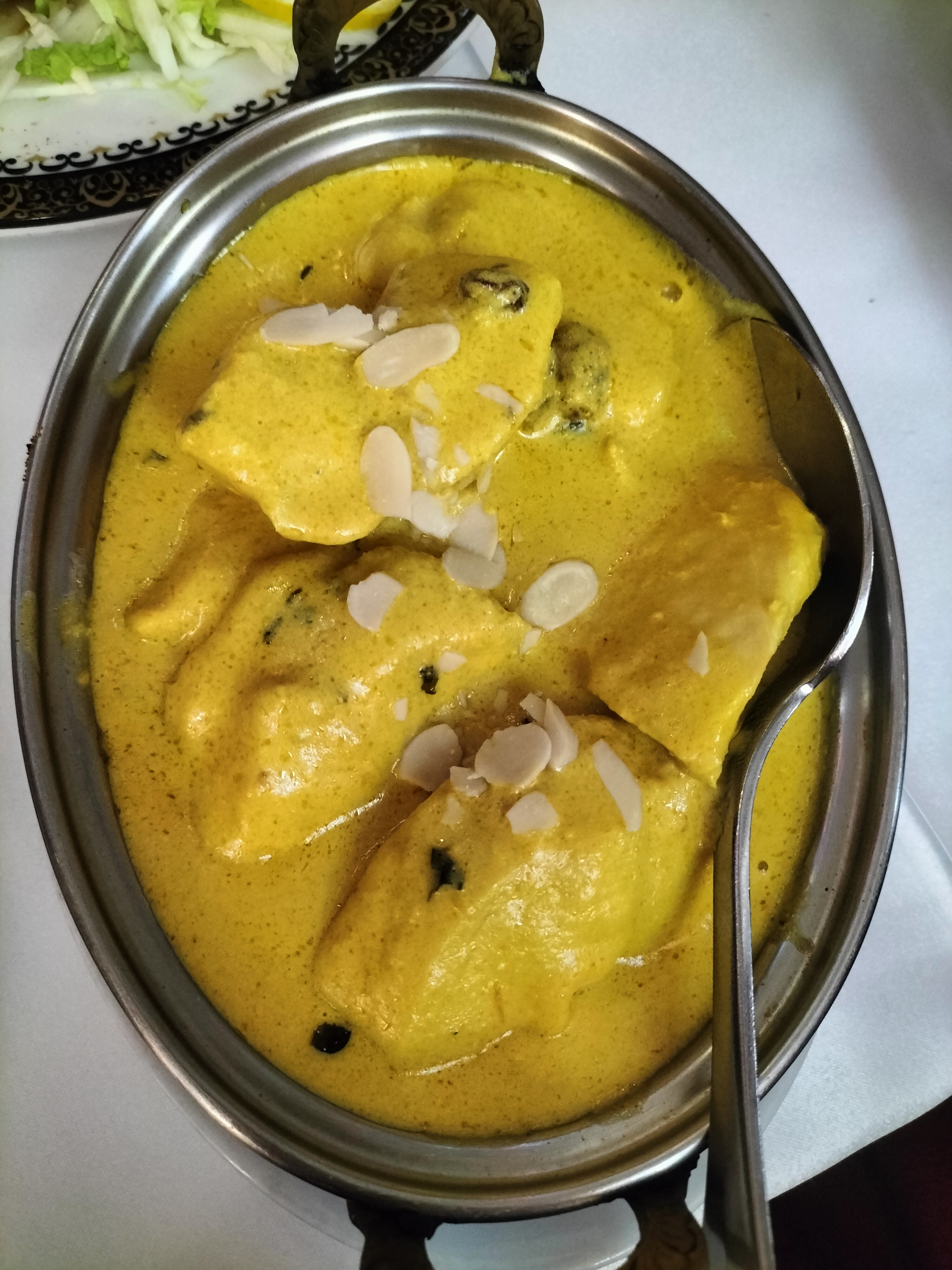 Restaurant très jolie Belle nappe service rapide et courtois. Pour le reste l assiette convenable. Le riz parfait le poulet tiede et simple le dessert très cher pour un carré de semoule et des amandes environs 5 gr Pour 7.50.un restaurant à faire quand même mais pas pour découvrir les saveurs indiennes saveurs
