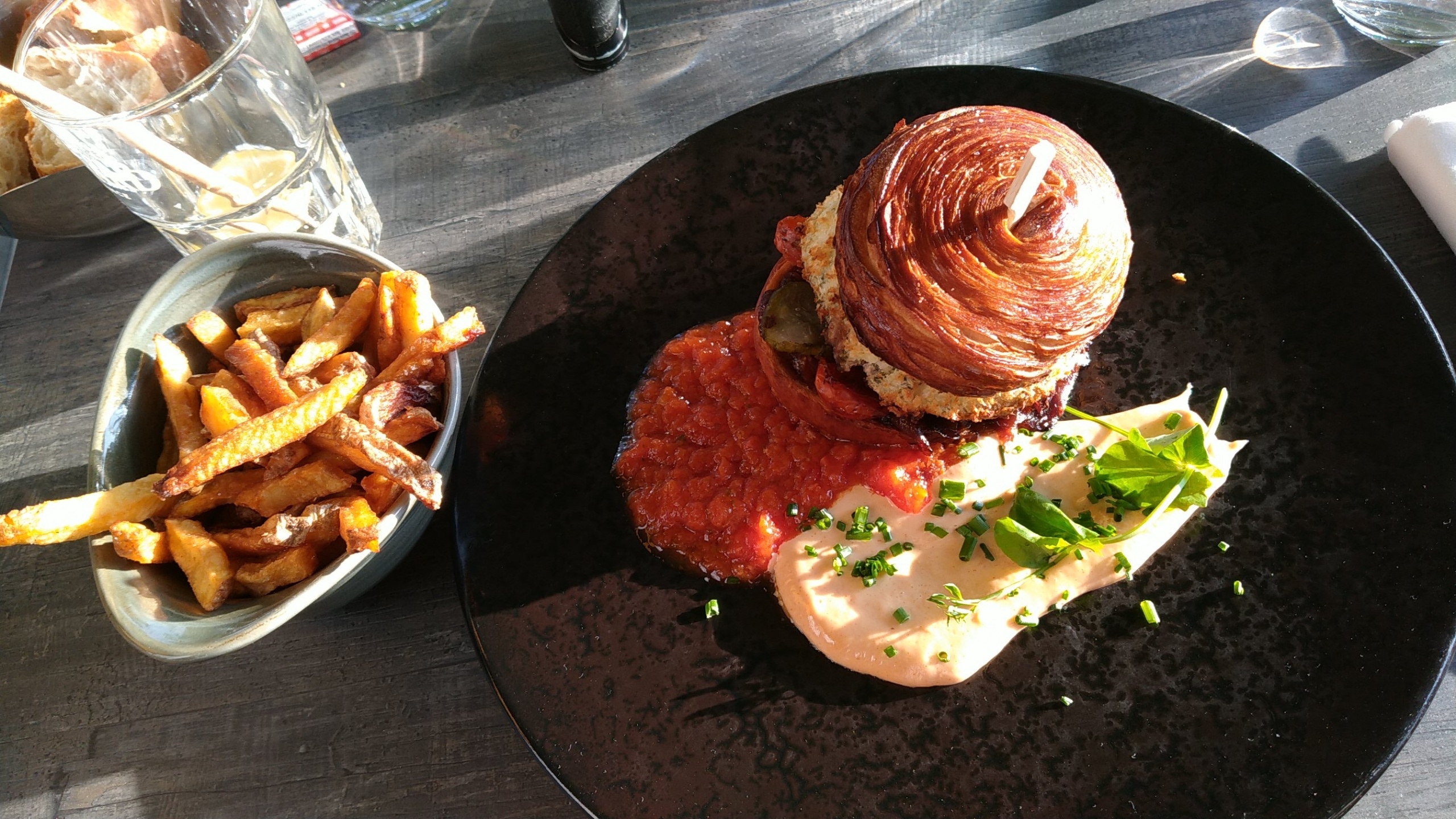 Super déjeuner en terrasse. Plats copieux et délicieux et cocktails au top