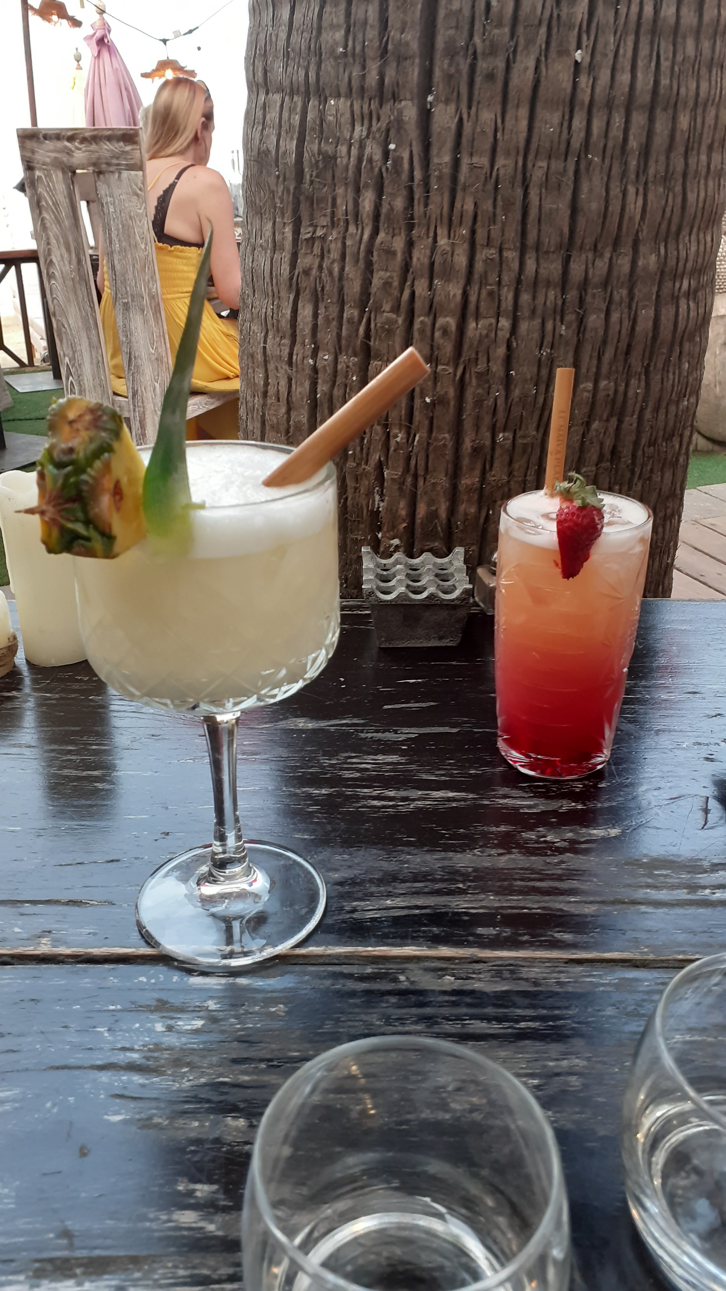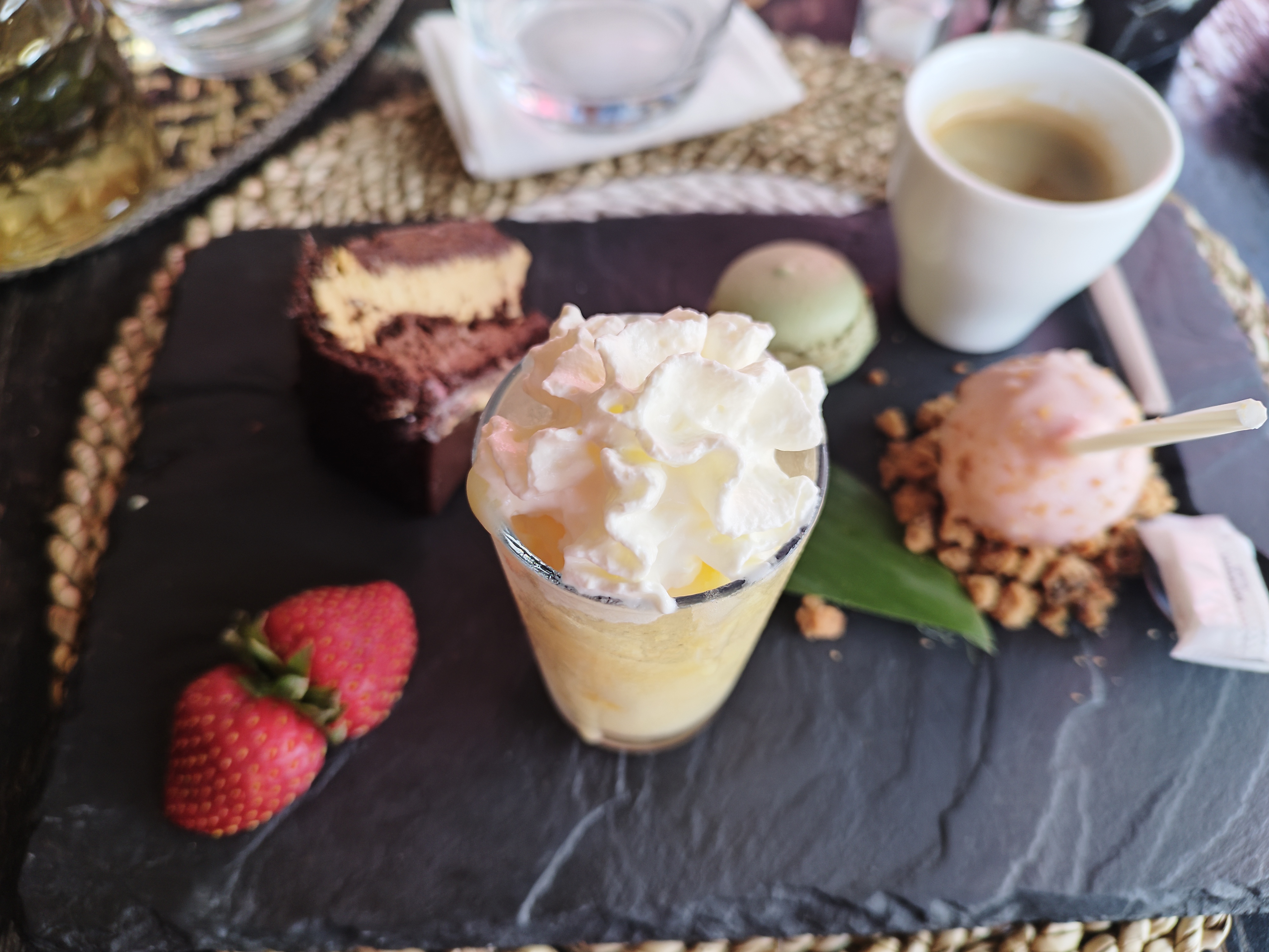 Dépaysement garanti enThailande au bord de la mer admirant le coucher du soleil, allongee sur un divan, cocktails excellents cosmopolites. Avec et sans alcool, . On peut également y déguster des glaces généreuses. Le service est attentionné. Plus haut il y a un restaurant alléchant avec un très joli cadre, à découvrir une autre fois!!!