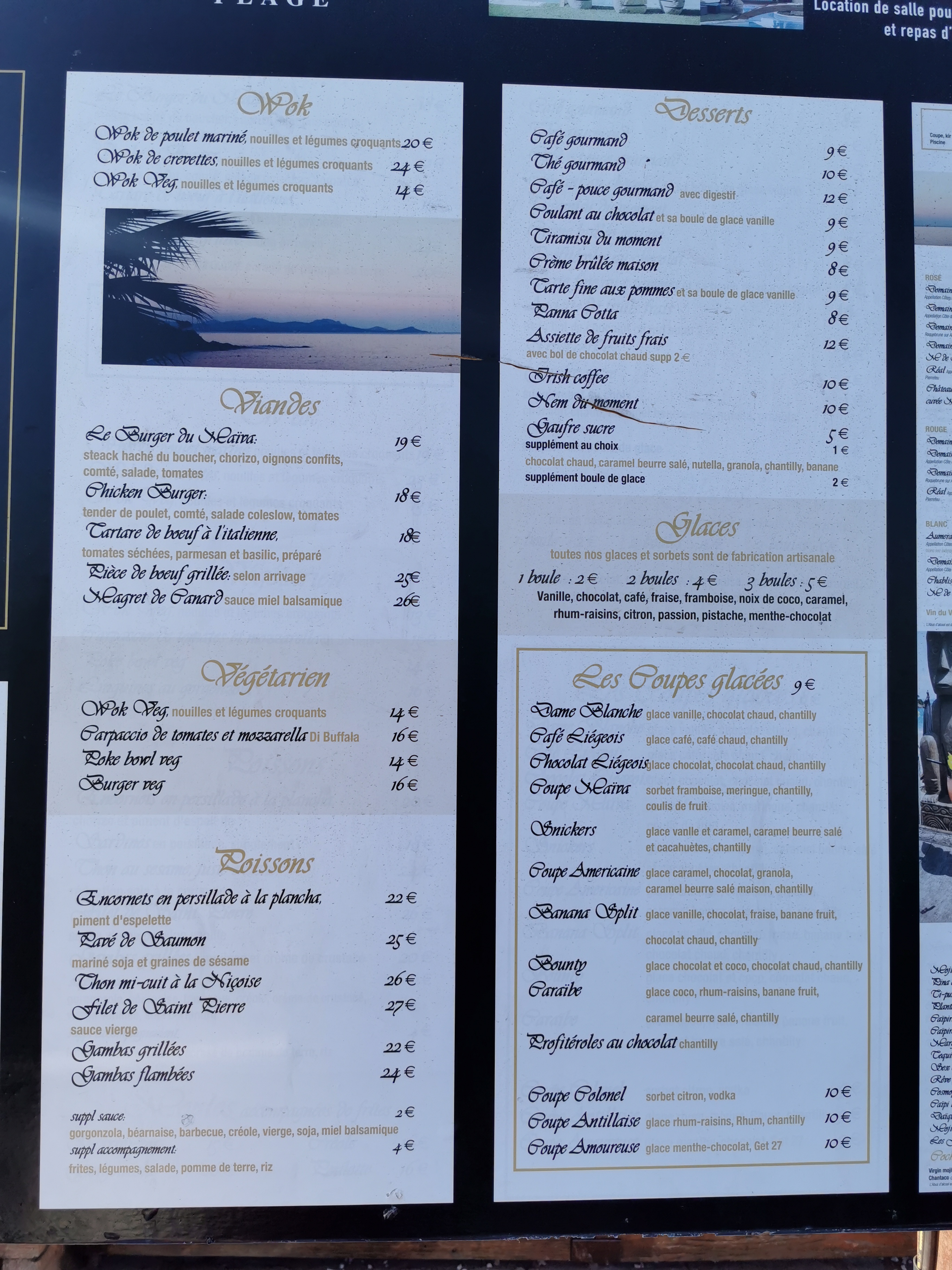 Bon restaurant en bord de mer aux Issambres (19/08/2021). Nous étions 2 adultes et 2 enfants. Plats copieux et bons. Menu enfant 12€, un avait des moules et l'autre avait un steak du boucher. On a pri un menu à 38€: entrée nems (5 pieces), ensuite une pièce de bœuf et un fondant au chocolat avec sa boule vanille (je ne pense pas un fait maison) et un autre plat: Wok poulet, très bon aussi et 2 boules de glace. Je mets la photo de la carte, vous pourrez juger par vous même. Le gros bémol pour nous: on était collé aux autres, pas de vraie distance pour le Covid, on avait 30 cm entre ceux derrière moi et les autres derrière ma femme.....pas de contrôle du pass sanitaire.....et peu de clients avaient leurs masques en venant ou en se déplaçant, c'est énervant quand vous avez fait des efforts depuis 18 mois et qu'ici, dans le Sud il y a tellement de relâchement (des Français et des étrangers en vacances...)...dommage, faudra pas s'étonner si en Octobre il y a un retour.... Personnel très sympa. Endroit avec un beau cadre. Le repas était très bien sinon👍