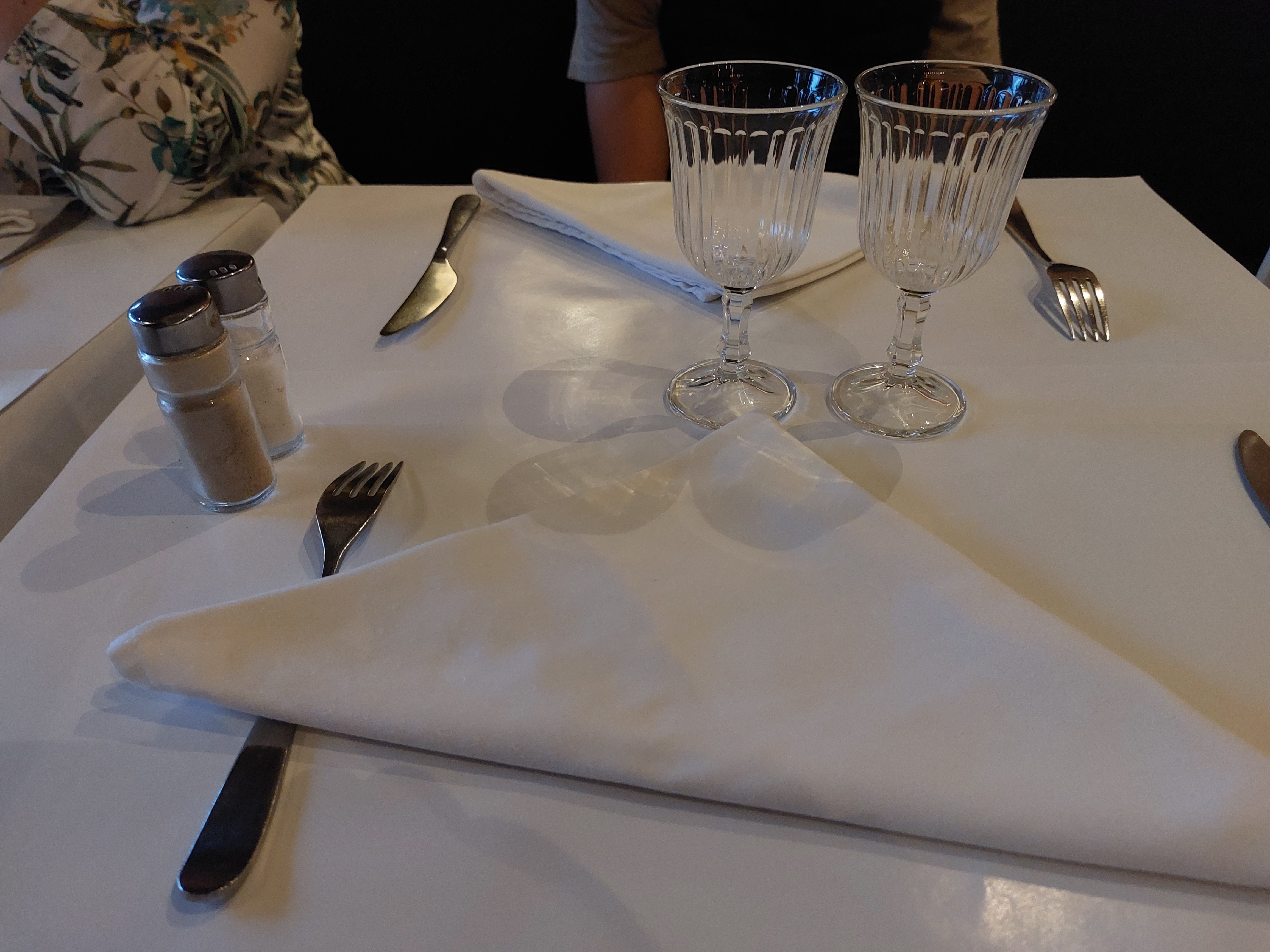 C’est beau ça donne envie mais c’est à peu près tout. Après avoir tenté de nous installer dans un couloir entre la desserte et le bar on finit par nous trouver une petite table. Le vin est bon et frais parfait. En revanche le service est très moyen. Les plats très décevants. Risotto rallongé à l’eau, noyé.. et donc sans saveur. La moitié du plat est froid l’autre tiède.. les noix de St Jacques ne sont pas assez cuites Quel dommage. Il leur manque 1 min de cuisson si bien qu’elles sont restées gélatineuses La mousse au chocolat est très bonne mais la salade de fruits gorgée de sucre. C’est vraiment dommage car les fruits étaient beaux et frais. Pourquoi toujours mettre du sucre dans les salades de fruits ? Si j’avais eu envie de sucre j’aurais commandé un dessert pâtissier. Le tout consommé à côté du patron des lieux qui se lamentait sur le manque de touristes. Et bien vous en aviez deux juste à côté de vous, et l’expérience était tellement moyenne que nous ne reviendrons pas et nous ne vous recommanderons pas. C’est dommage, vous avez le cadre, l’emplacement, le personnel mais il manque l’essentiel : le plaisir et l’envie de faire plaisir. Ah oui aussi, un presque bon point, l’amabilité ne dépend pas chez vous du montant de la note, 70€ pour 2 un midi en pleine semaine, ni sourire ni merci ni bonne journée.