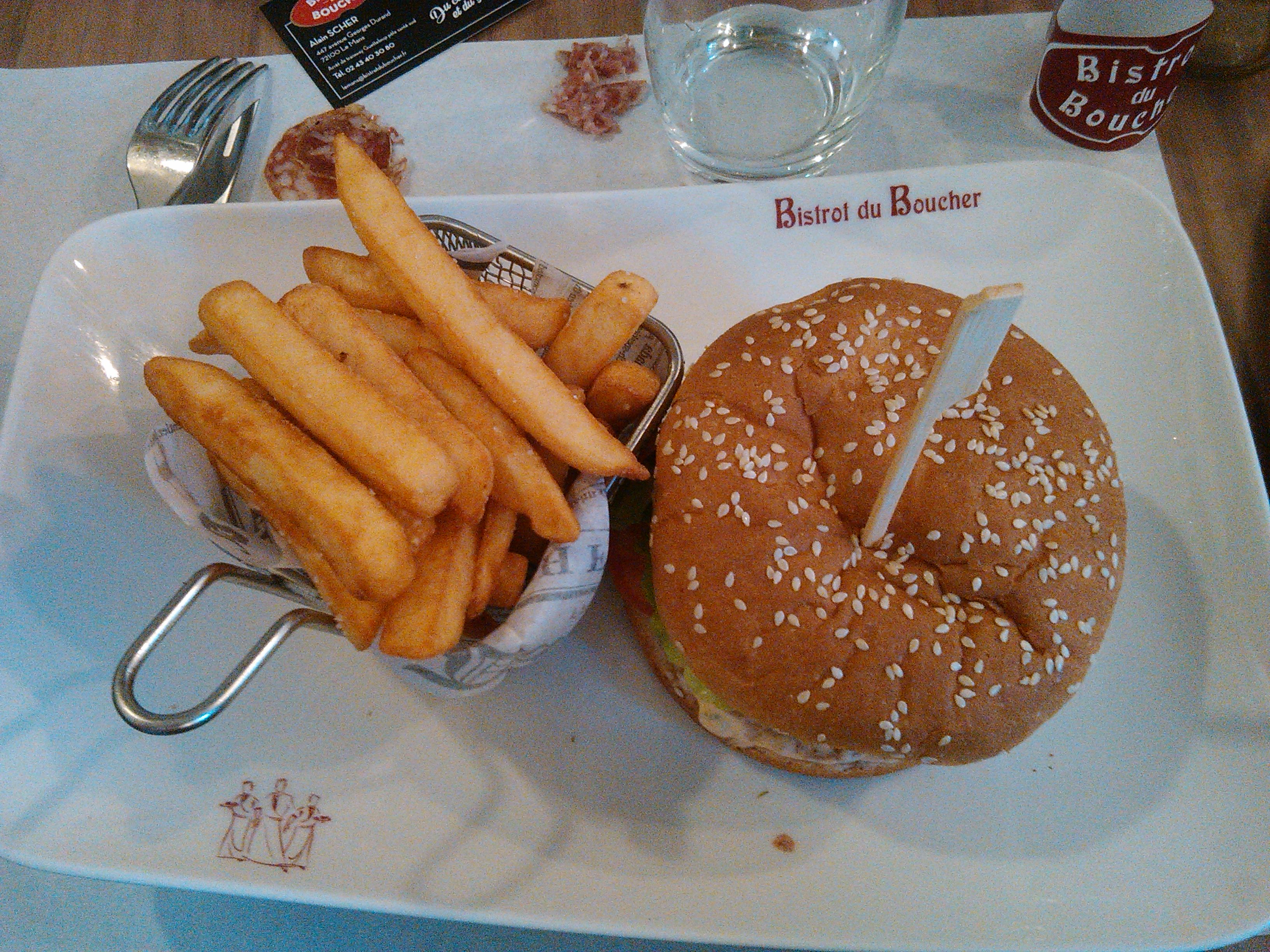 Quand on suggère une entrecôte surtout dans un bistrot qui dit de boucher, on s'attend à une vraie entrecôte qui dépasse de l'assiette au lieu d'un Steak (voir la 2ième photo du commentaire de Sab mais je vous assure que l'assiette n'est pas grande). Je dirai qu'elle n'était pas de mauvaise qualité mais vu ce qui est proposé sur le Mans c'est un peu en dessous de la qualité requise. En revanche l'accueil rien à dire, j'y reviendrai mais pour essayer autre chose.