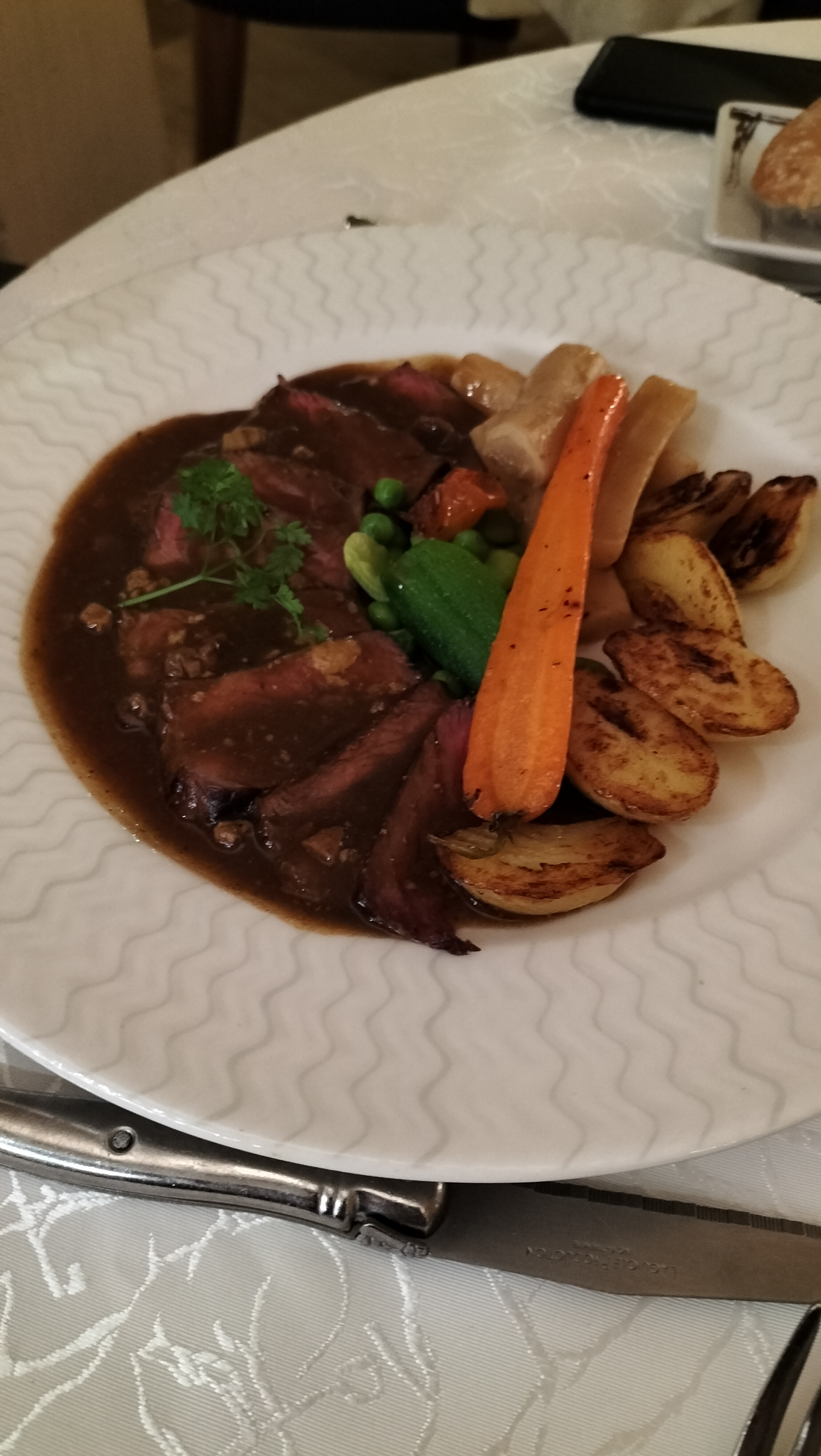 Ce jour là, j'ai choisi le service brasserie. Je me suis régalé d'une fricassée de volailles/salade verte et frites ( mon choix ) la salade extra fraîche et parfaitement assaisonnée. Je connais le Manoir depuis des décennies et je n'ai jamais été déçu. Excellent et fidèle personnel très pro et aux petits soins