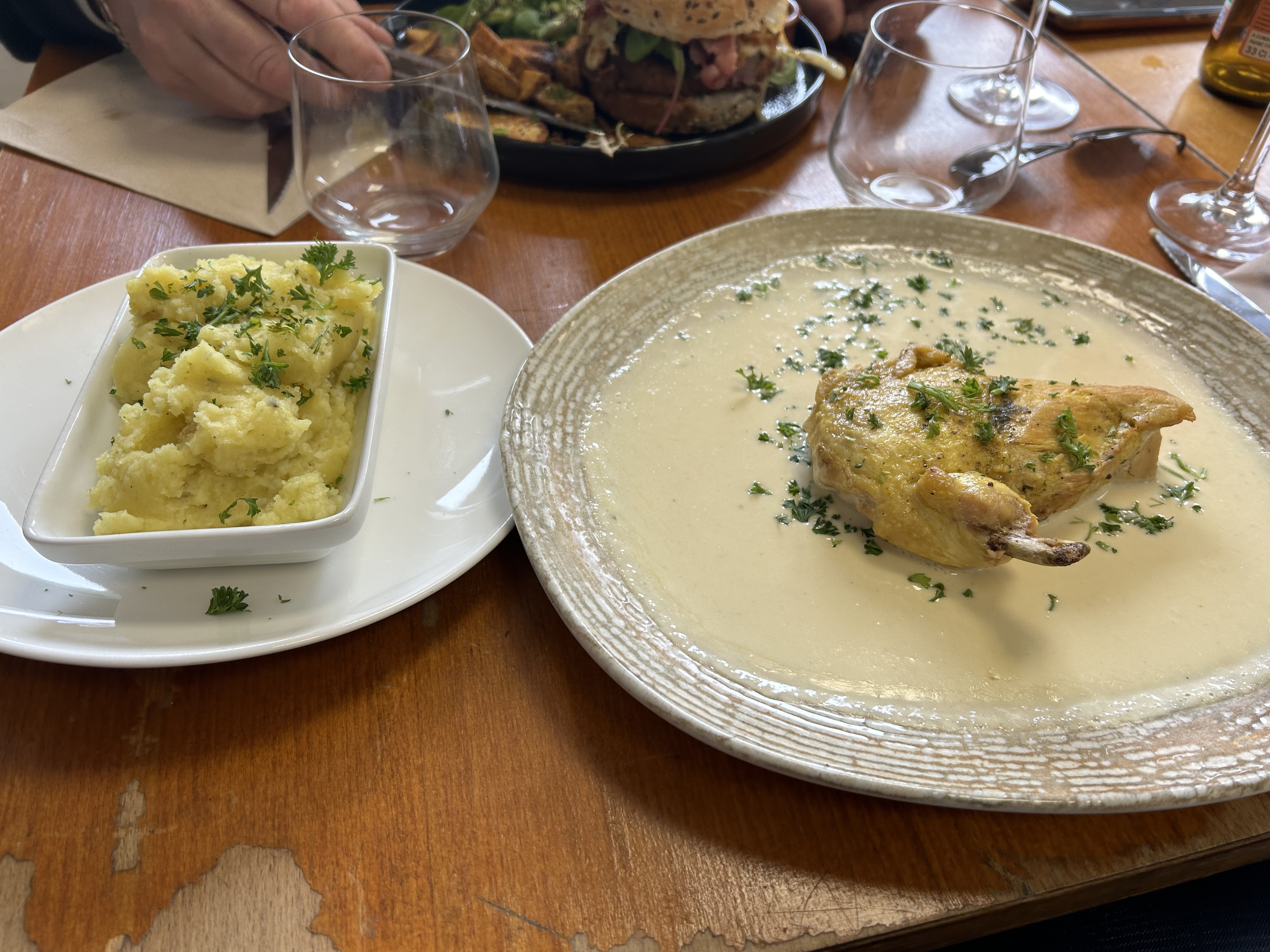 Cuisine simple, plat servi tiède, burger trop cuit sans le fromage à la truffe prévu , produits moyens pour une formule à midi pas très onéreuse il est vrai.