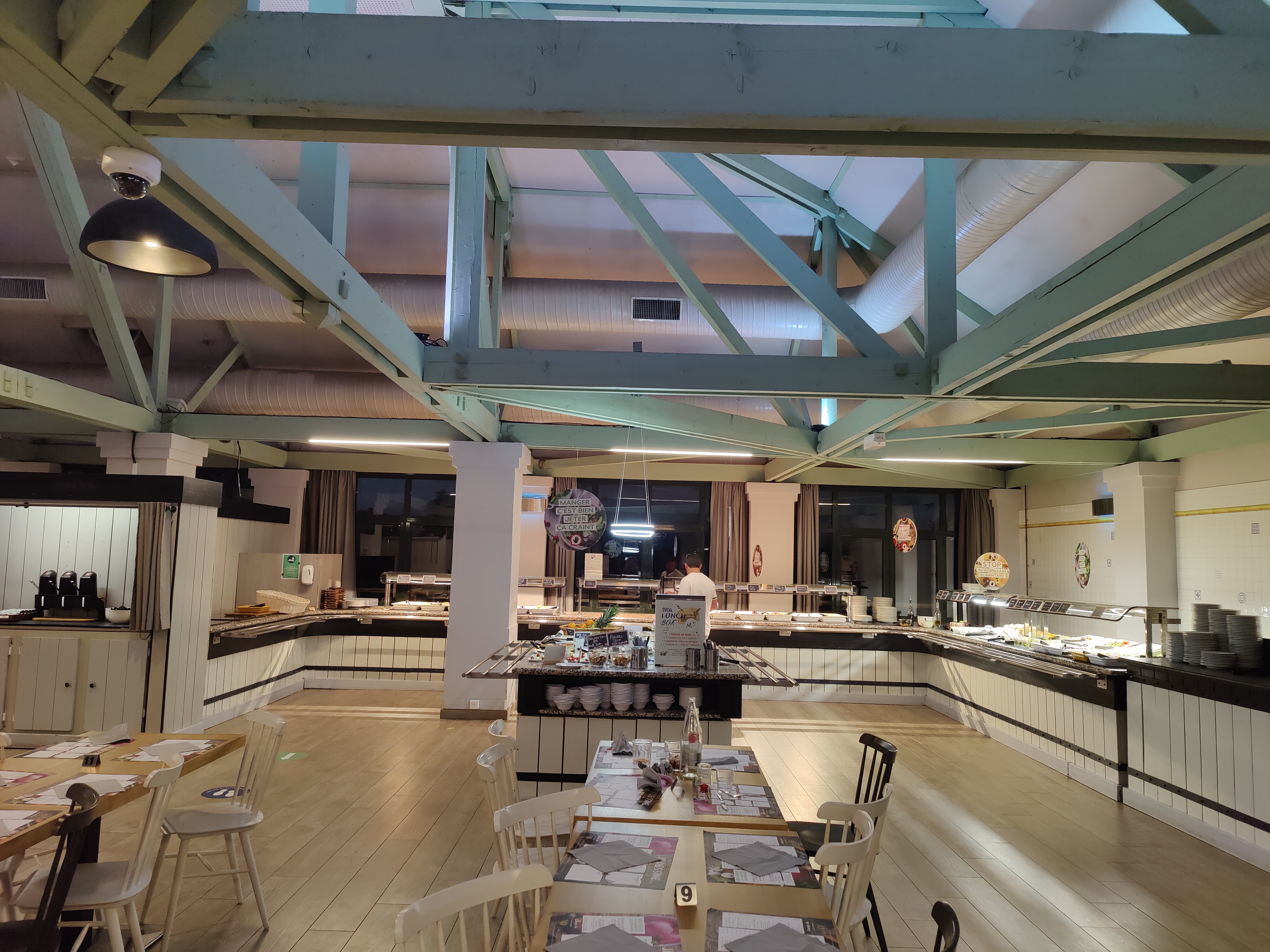 La nourriture pour le petit-déjeuner au Marché est excellente. Assez de choix ! Le personnel est sympathique mais ferme. Nous sommes allés dîner avec un groupe de 4 personnes. 2 personnes étaient déjà là et quand nous sommes arrivés nous n'avions plus le droit de nous asseoir avec eux car tous les 4 personnes. les tables étaient déjà occupées. Lorsque nous avons demandé si nous pouvions ajouter une table pour deux personnes, cela a été rejeté et nous avons dû nous asseoir tous les deux ailleurs. Après avoir demandé 4 fois s'ils pouvaient s'asseoir à côté de nous, par la grâce de Dieu, cela a finalement été possible. En termes d'ambiance, on se croirait dans une grange, donc il n'y a pas de véritables sièges confortables. Prenez un repas rapide puis prenez la route. Pour le reste très bien.