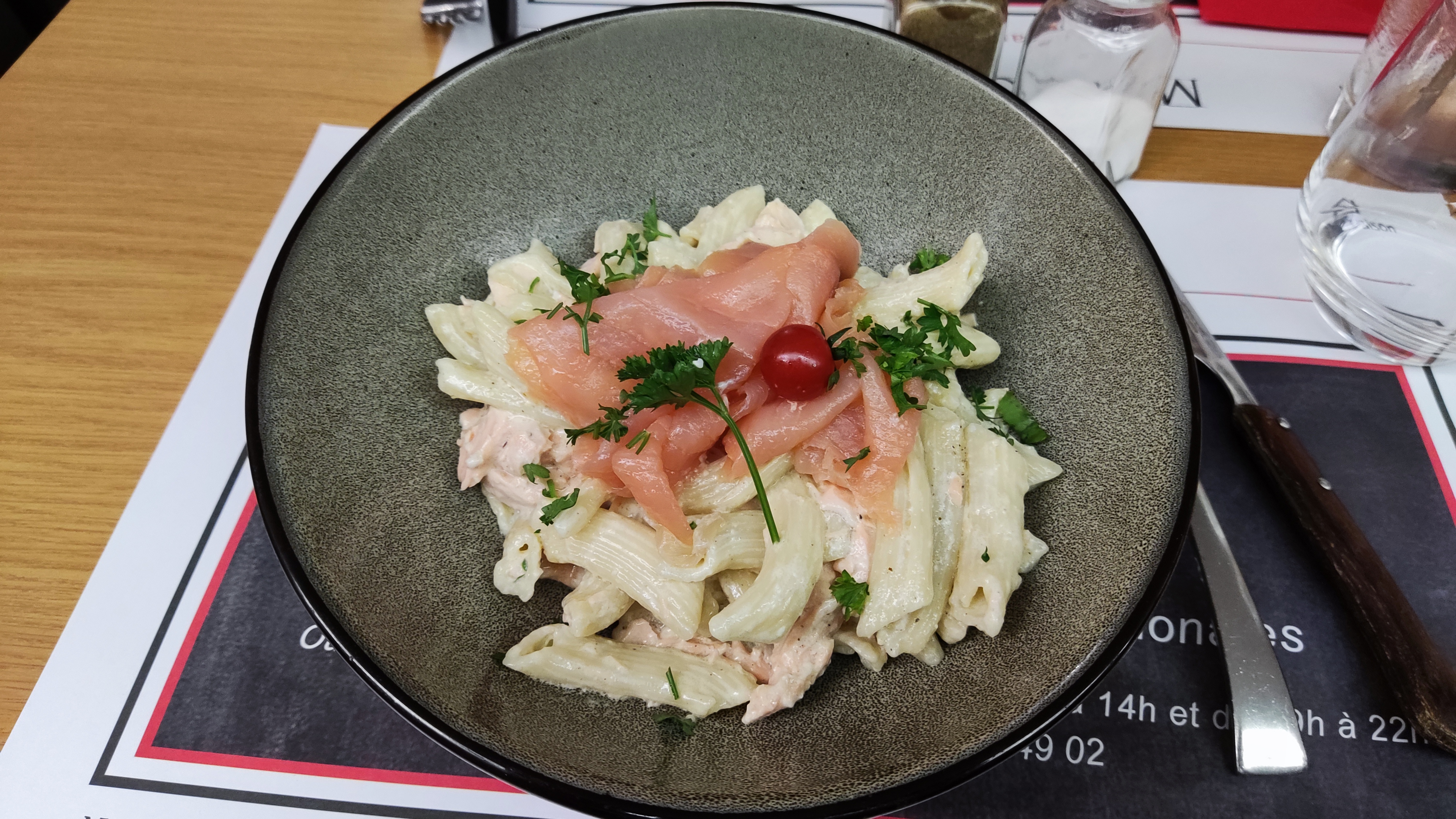 A contre cœur car les autres étaient complet. Pas pressé pour donner l'ardoise, pour l'eau si on ne la demande pas on l'a pas, pour l'appero j'ai demandé un porto blanc...une grosse blague il y avait a peine 4 gorgés dans le verre plus un gros glaçon, l'ardoise n'affiche pas le prix des petites salade. La Salade pour l'entrée est une vrai arnaque a plus de 10€ un œuf coupé en 4, 2 quartier de tomate, une tranche de jambon 4/5 allumette de fromage Conté qui a pris la température des fourneaux, des morceaux de noix qui se battes en duel et biensur une surcharge de salade pour gonfler une l'assiette qui n'a strictementrien d'extraordinaire, n'importe qui peu dresser une telle assiette mais c'est surtout le pris qui est prohibitif. Pour le plat Pâte à la Carbonara rien a dire à part que je ne suis pas un enfant de 5 ans. En sommes extrêmement chers pour ce qu'on nous sers et je sent une désorganisation dans l'équipe des 4 serveuses. Très deçu