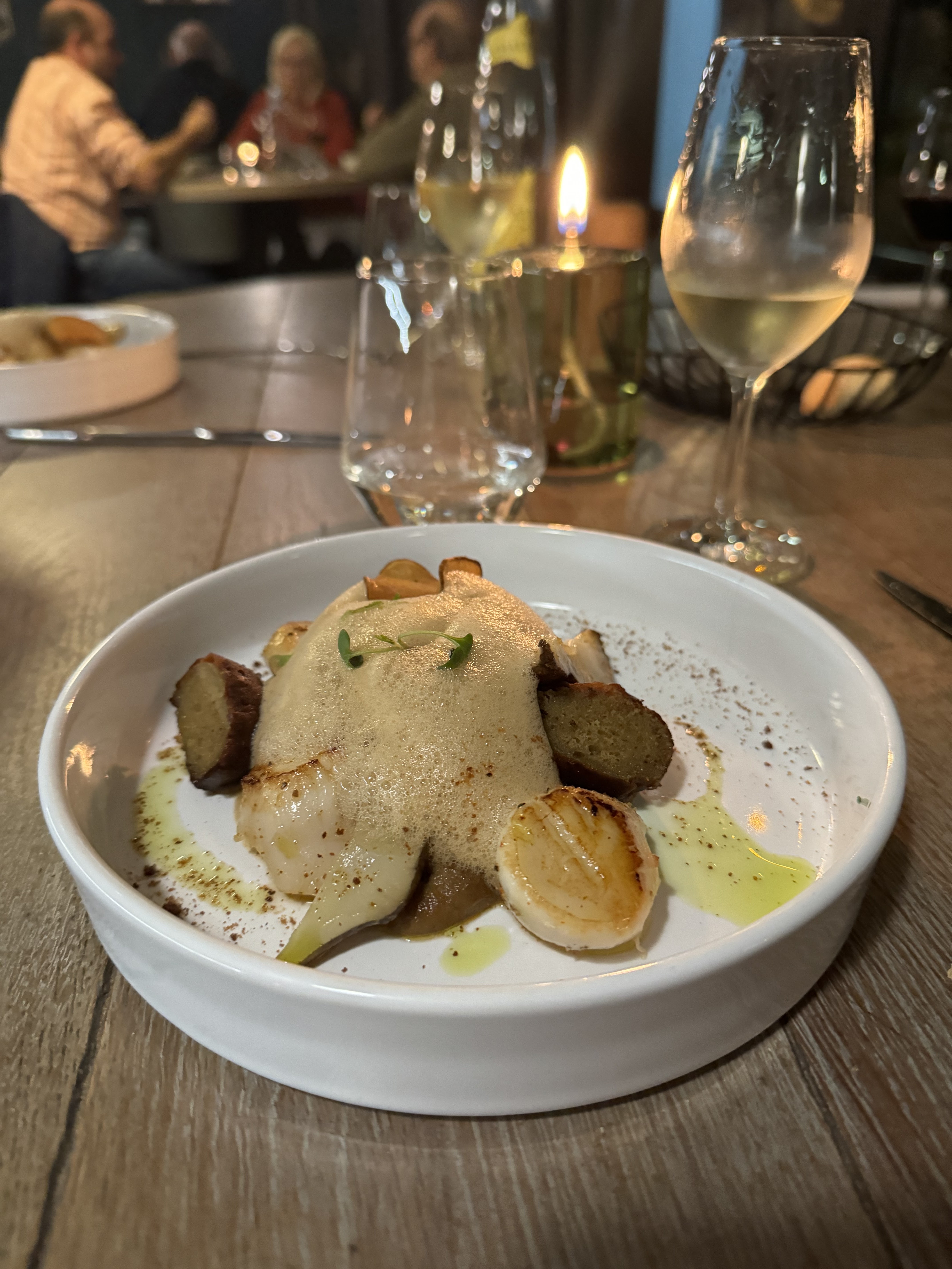 Grosse déception. Au départ on nous installe sur une table près des toilettes et sans éclairage. On nous a permis de changer de table. Aperos chers avec 1 seul amuse bouche plus que décevant. Que dire des vins : très chers et vins demandés non disponibles. On nous en propose un 20€ plus cher en remplacement.... Plats qui pourraient être bons mais poisson pas assez cuit, risotto tiède. Accompagnement décevant (beaucoup trop d'emulsions). Redemander du pain est compliqué : on nous apporte un morceau coupé en 2.... Bref : surfait et réputation largement usurpée.