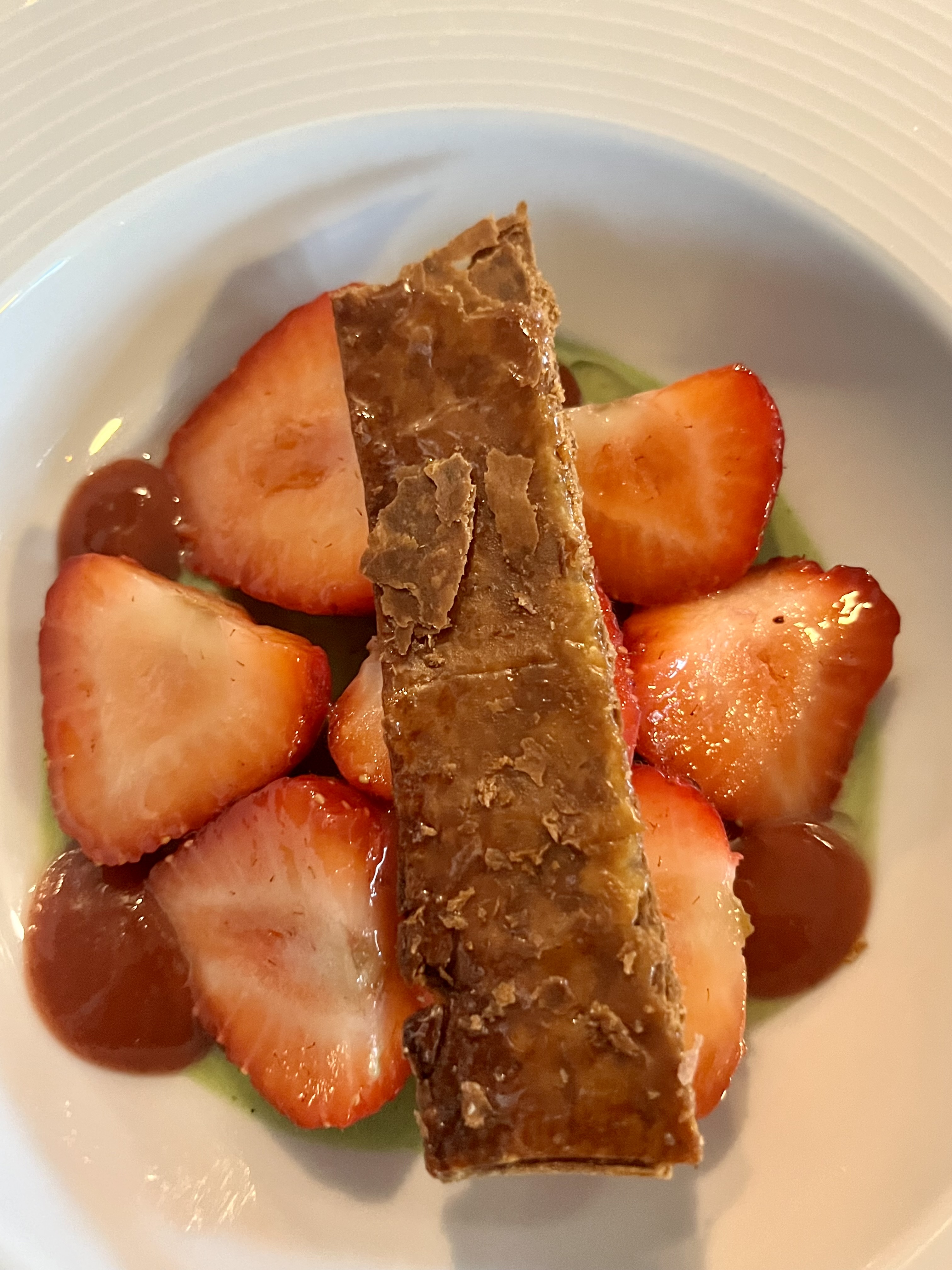 Après y avoir dîné à 10 reprises et avoir été notre restaurant de cœur au havre, quelle déception....MAIS QUELLE DECEPTION Nous débutons par un apéritif à 10euros le verre, un amuse bouche de 0,3 cm nous est servi, 2 ou 3 par personnes seraient appropriés. L entrée, le foie gras nous est servi malheureusement, il sort juste de la réfrigération, donc très ferme.je commande 2 verres de CDR blanc, celui ci est insipide , je le fais remarquer mais comme d habitude la réponse est souvent récurrente que personne ne S'en est jamais plaint..... (je suspecte étant connaisseur surtout des cdr que celui ci a été ouvert depuis plus de 24h) Le plat principal (cochon) est acceptable mais où est l accompagnement ? Je commande un verre à 7 euros du Roussillon rouge, bof... Enfin le dessert et là c est le pompon, un ananas fadasse et une mousse(oups un espuma) à la fraise pas très engageante (voir PHOTOS ). C est la degringolade vertigineuse comparées à nos visites précédentes... Dommage et je n ose parler du service (après on va dire que je m acharne) mais quand on sert le vin dans un verre, on essaie un minimum de maîtriser afin de ne pas renverser et si c est le cas on s excuse.