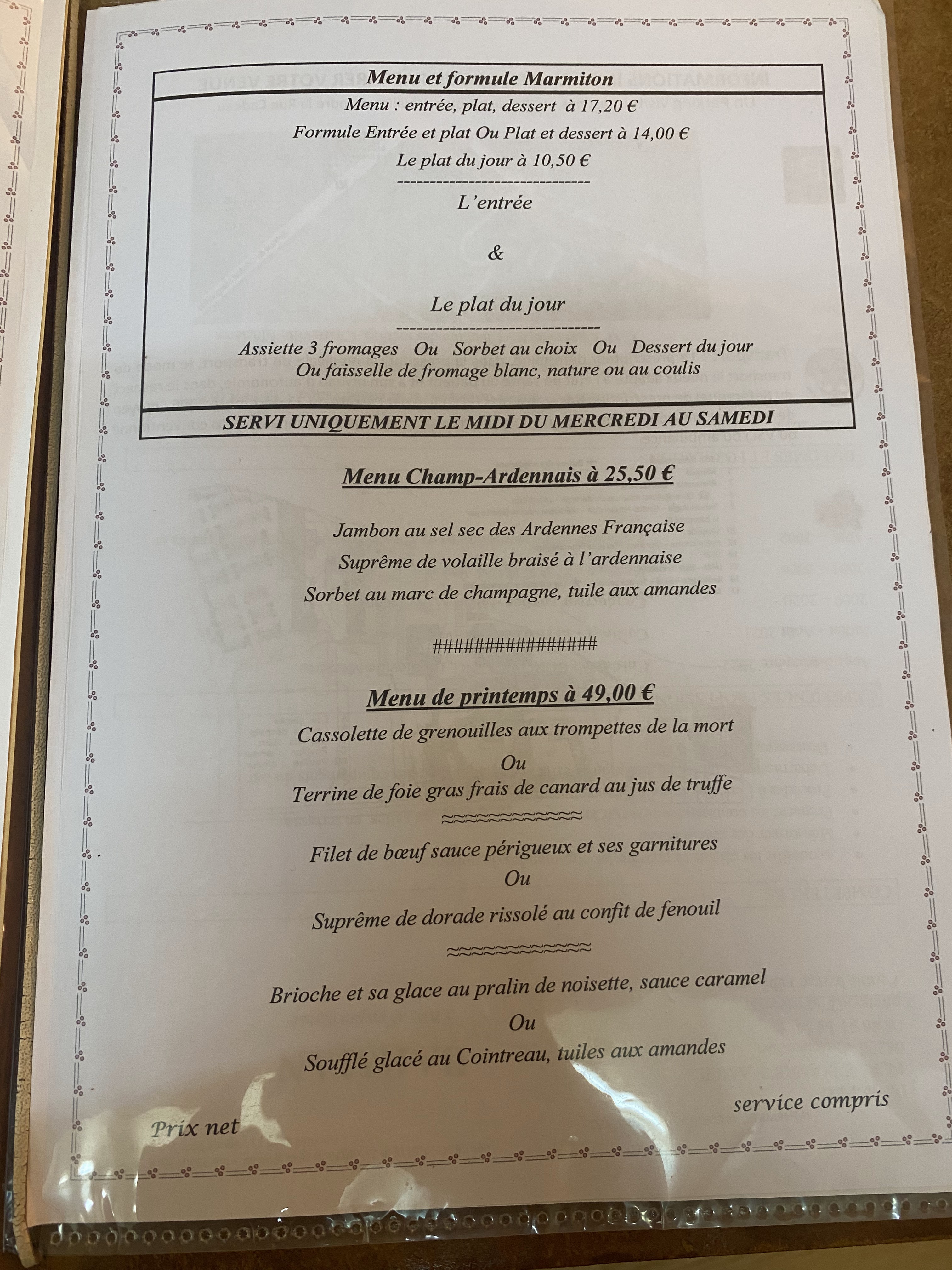 Marmiton et au bon vieux temps est le même restaurant. N'hésitez pas une seule seconde à poussez la porte. Vous aurez affaire à un service de qualité et un repas soigné aux goût et saveur de haut niveau. De plus les tarifs sont beaucoup moins élevés que le niveau de satisfaction que procurera chacune de vos bouchées. Je recommande fortement.