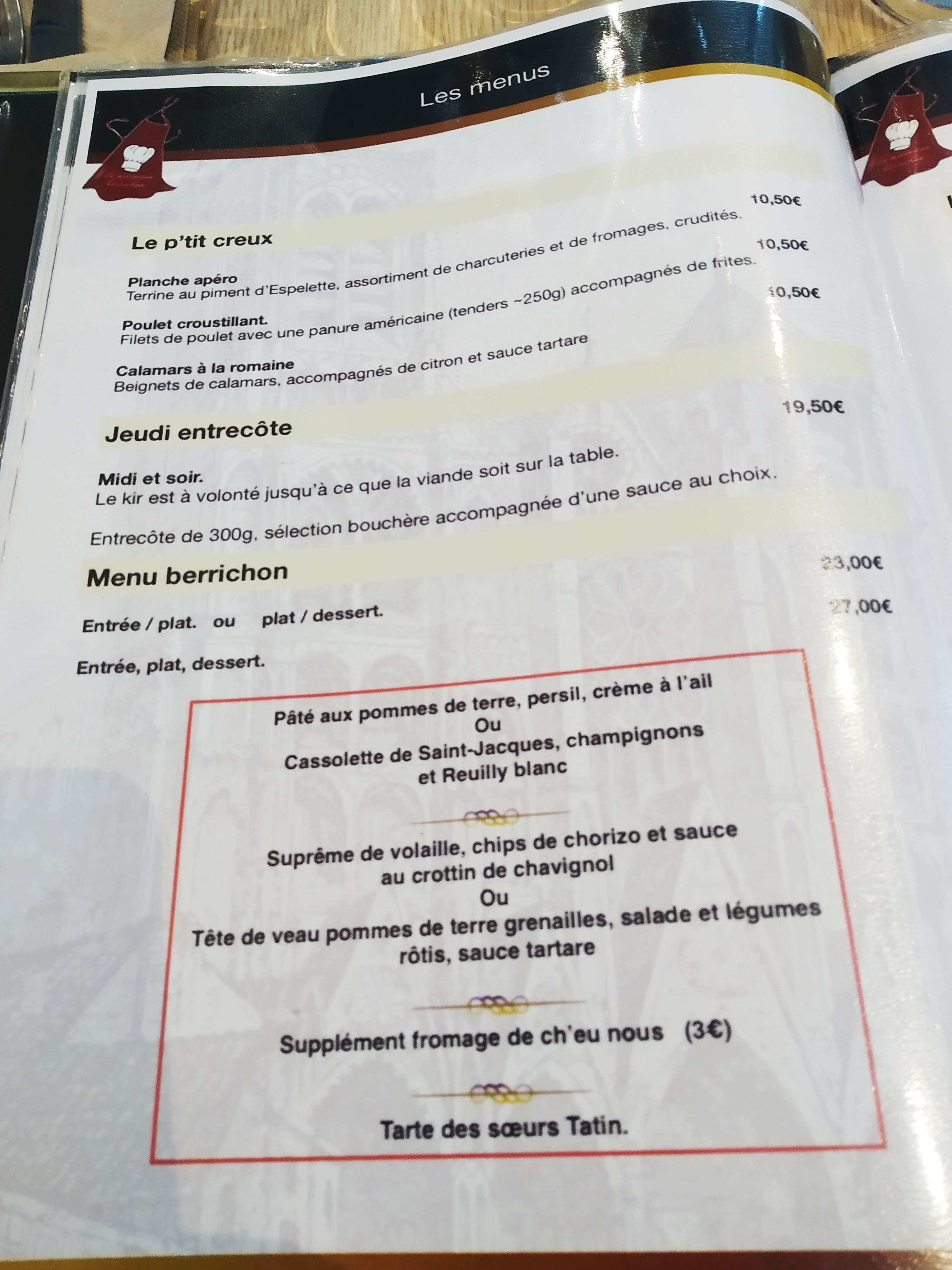 Quelle honte de laisser croire aux touristes Que ce restaurant propose de la cuisine berrichonne. Fuyez fuyez. Et pour répondre à Monsieur, le contenu y est bien en théorie. Je parle de qualité et du fait maison. Et puisqu’on y est, je souligne également que l’hygiène laisse à désirer. Bon courage pour la suite. Ps : lisez les avis Tripadvisor, ce que j aurai du faire en amont .