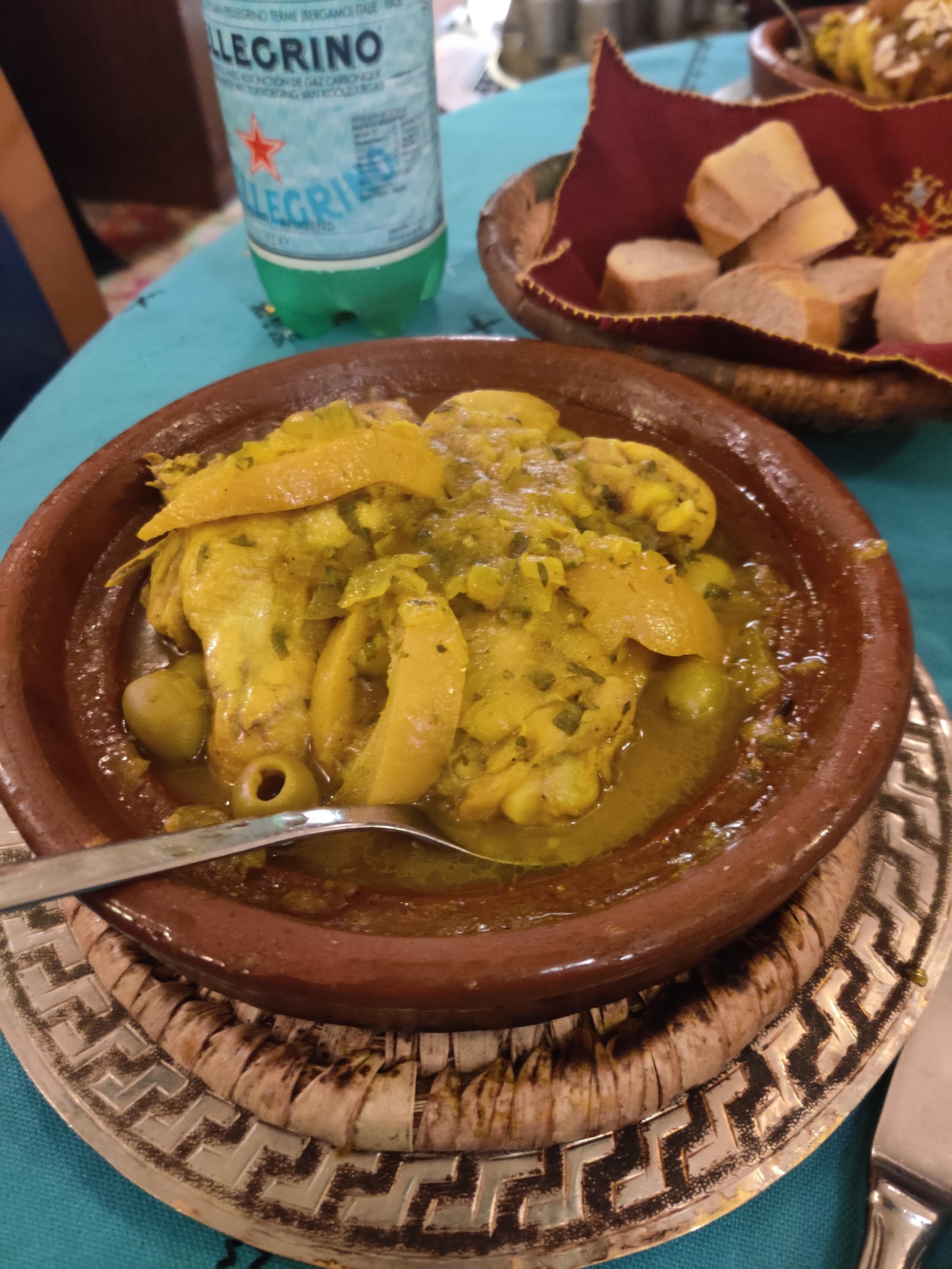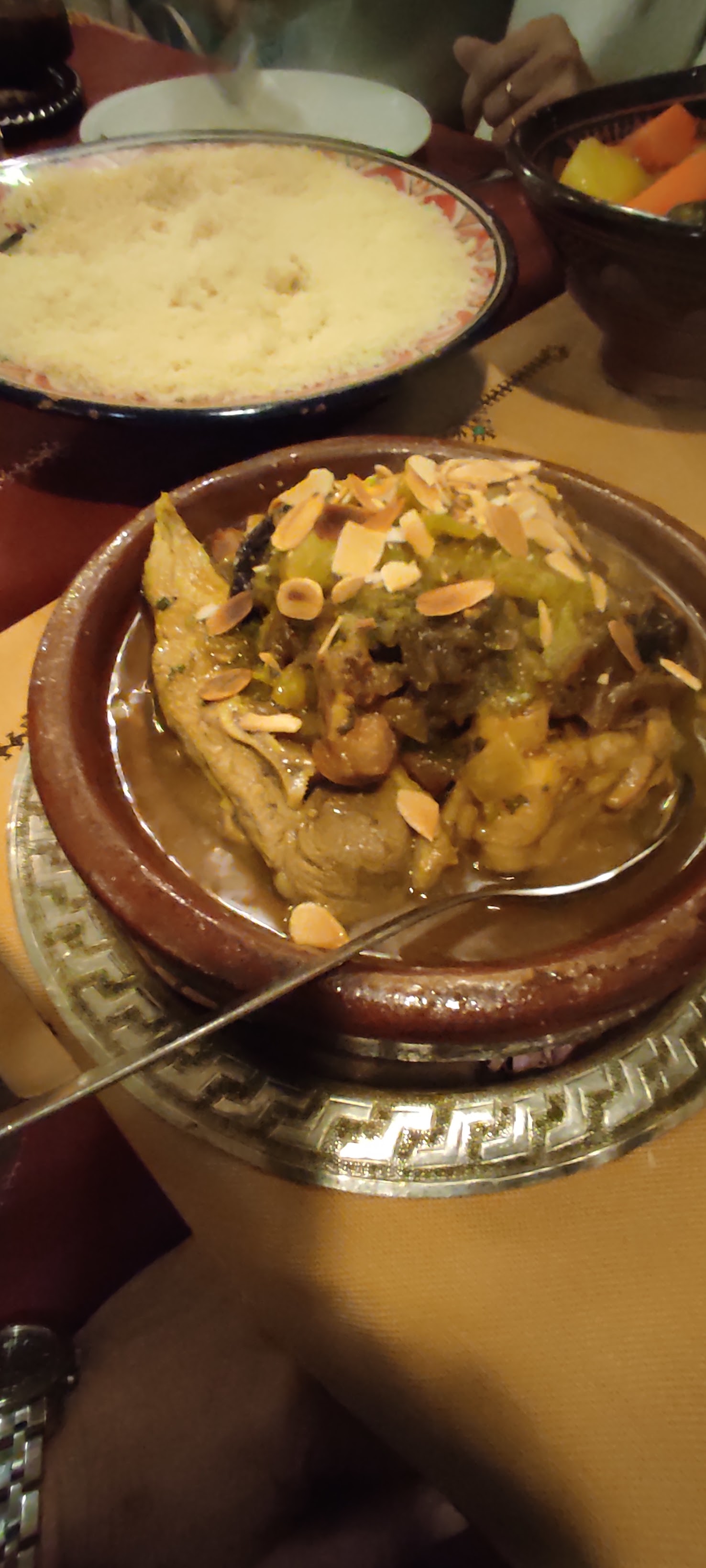 Ma petite amie et moi étions à Marrakech l'année dernière et avons adoré chaque minute de notre voyage. Nous avons été délicieusement ramenés avec ce merveilleux repas. Notre serveur était très bon et a même fait une blague agréable. Ma copine et moi pouvons recommander ce restaurant à tous ceux qui souhaitent ajouter un peu de sucre à leurs souvenirs ou qui souhaitent simplement essayer la cuisine marocaine. Attention il y a beaucoup à manger, avec nos tajines nous avons eu une portion d'agneau et de couscous très généreuse. J'espère que cet avis vous aidera et vous trouvera bien.