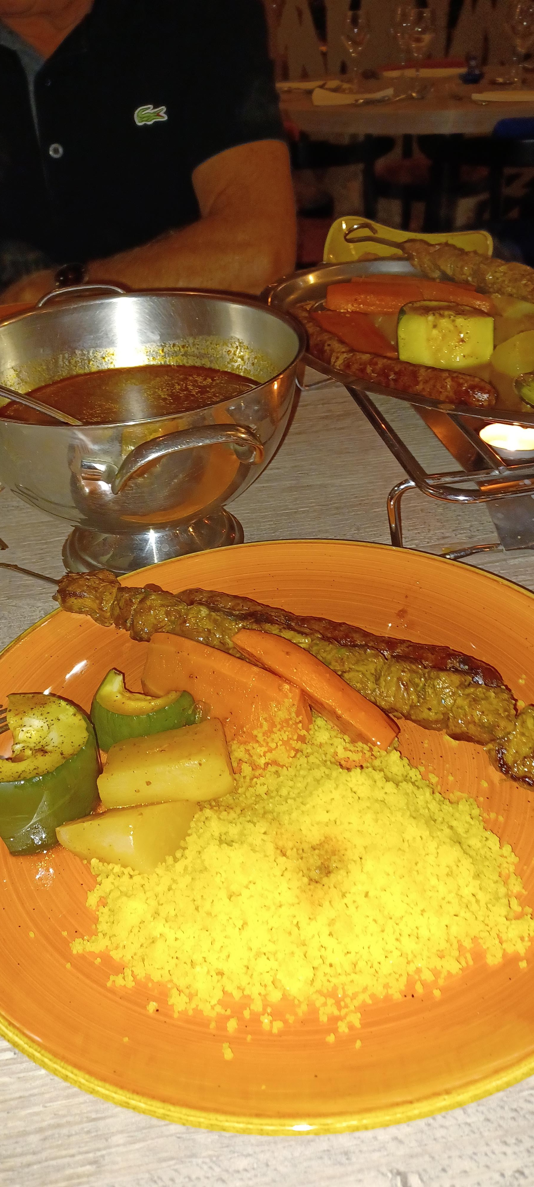 Accueil sympa. La semoule, les légumes et le bouillon parfaits. Les brochettes d'agneau pas assez cuites donc très dures. La tajine parfaite. Le pire c'est au niveau des pâtisseries orientales certainement assez vieilles et dures pour un samedi soir. Dommage. L'ambiance générale est très bonne.
