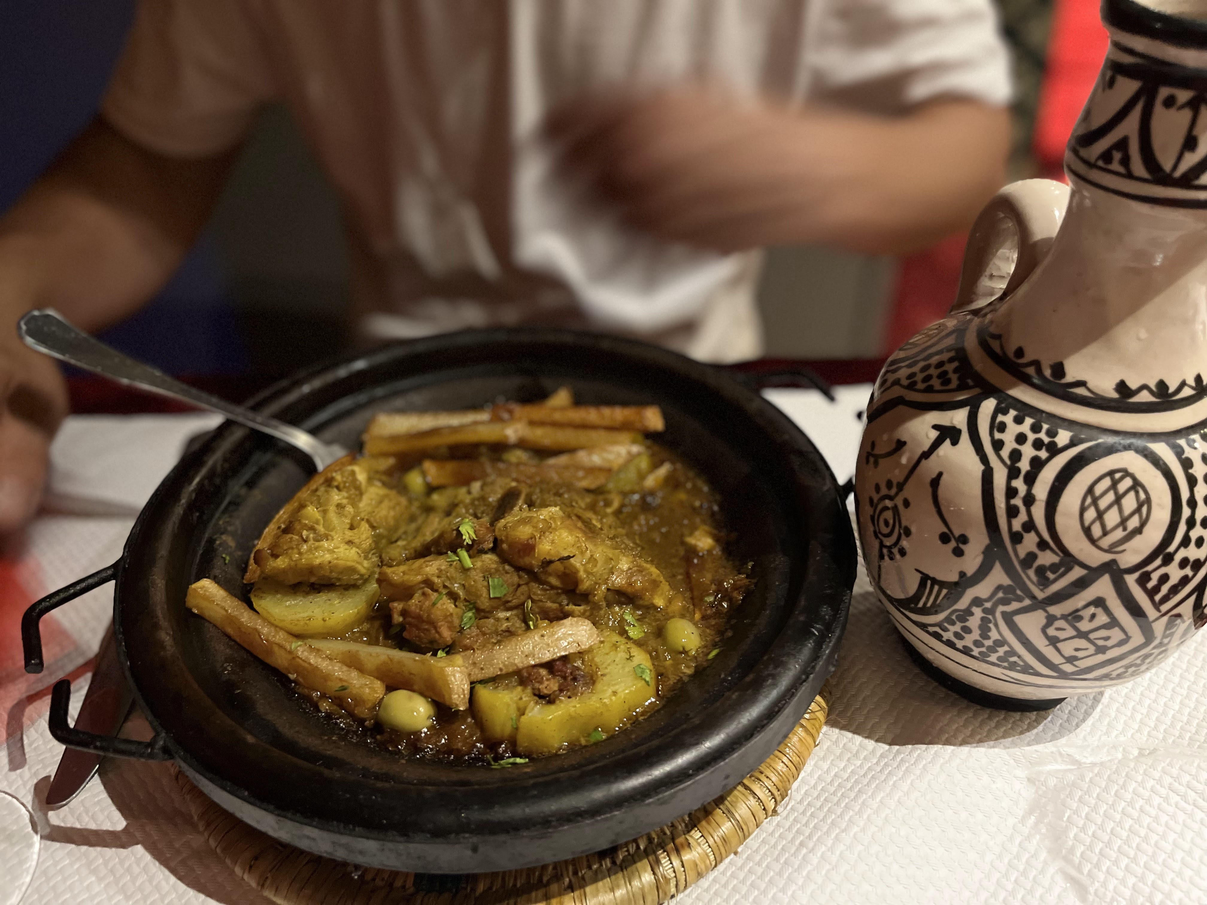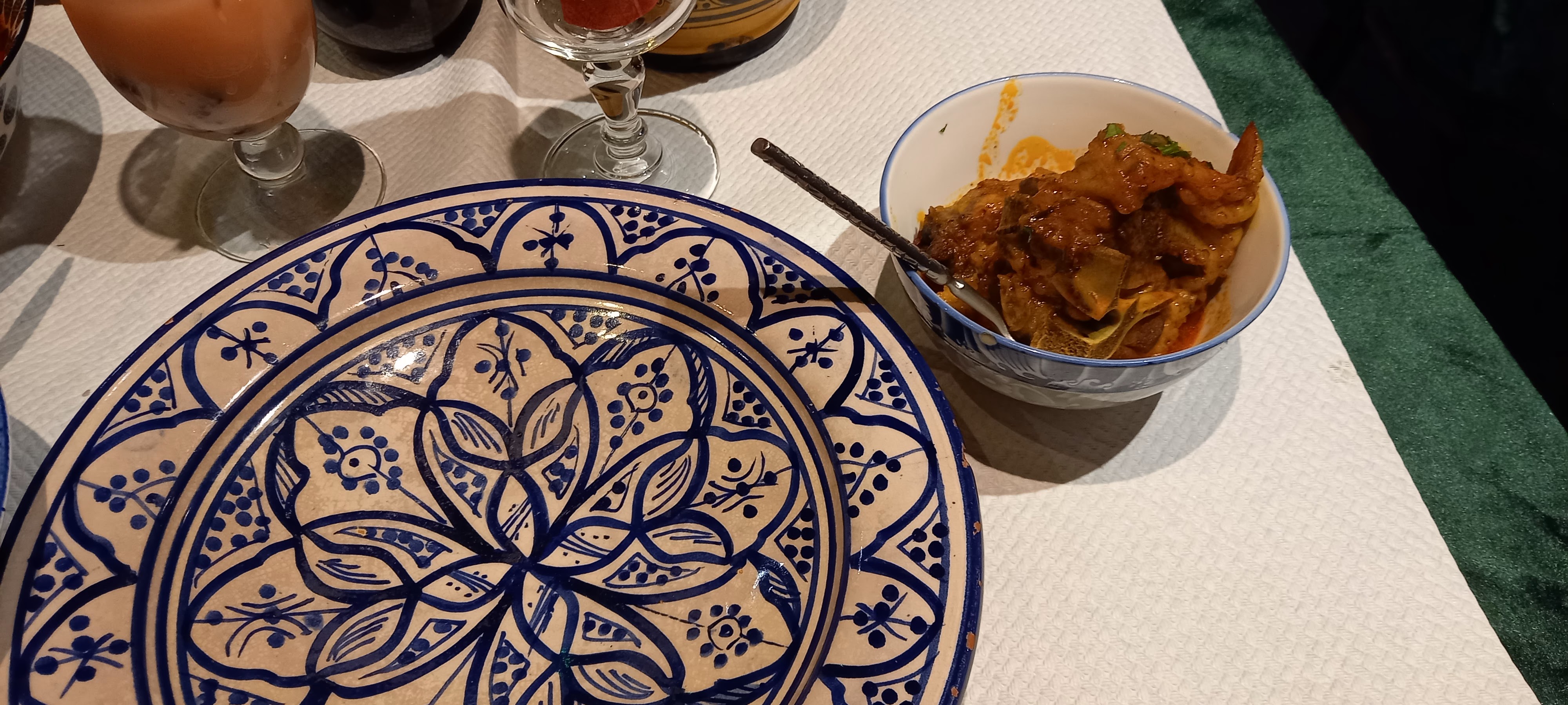 La soupe est très bonne, bien que plus épicée que ce dont j'ai l'habitude. Un tajine tellement excellent que je m'en suis brûlé la langue à vouloir le manger trop vite 🤣. Très bonne expérience