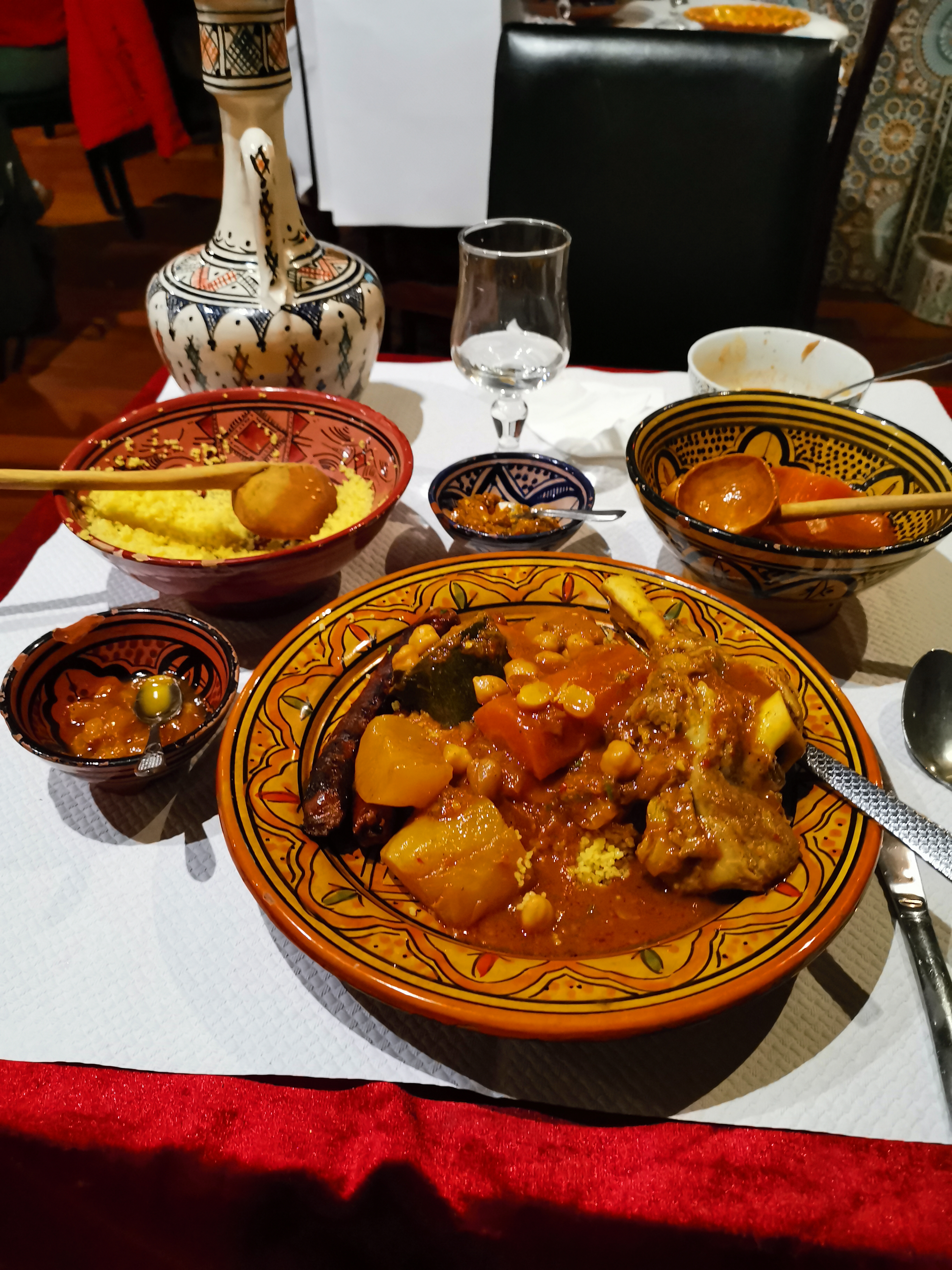 Serveuse sympathique, déco dans le thème, nous avons commandé deux couscous portions généreuses et plats savoureux. Je repasserai pour tester les tajines.