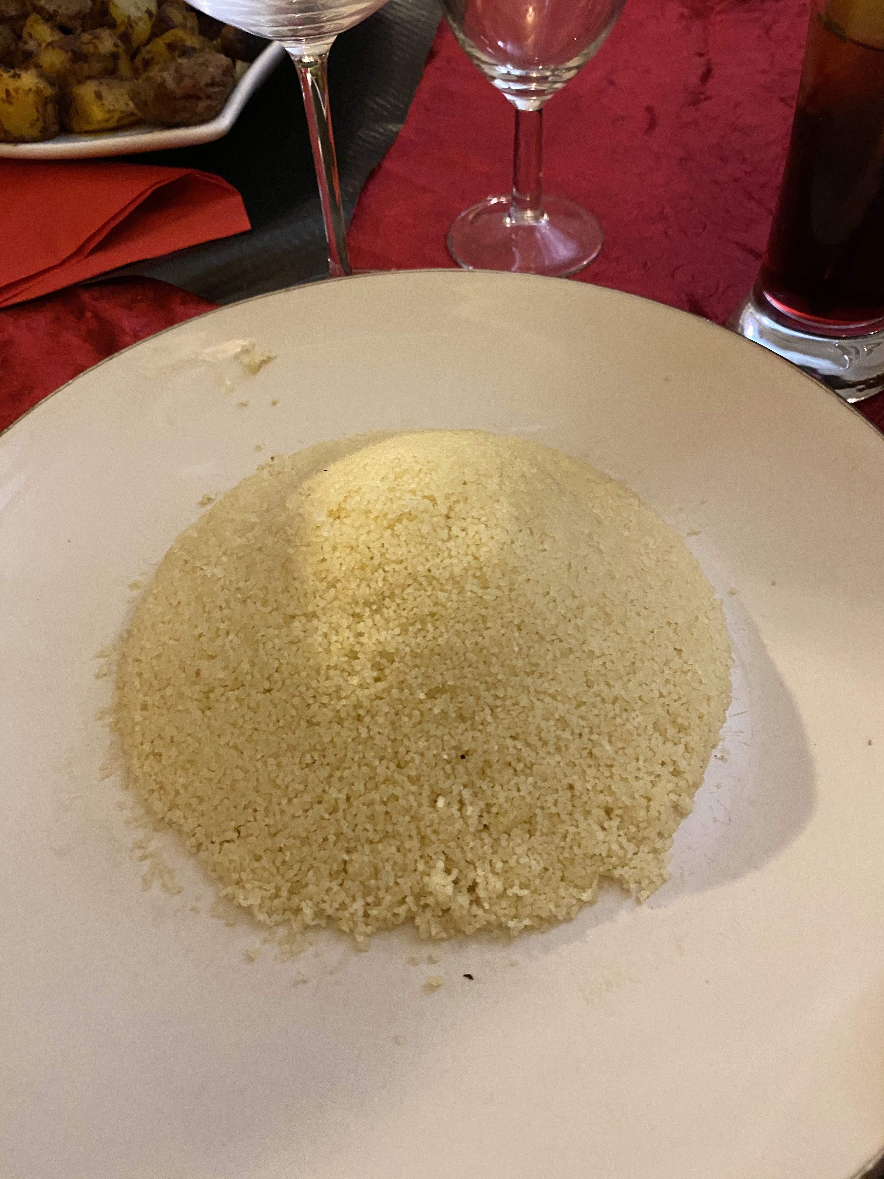 Nous avons été très bien accueilli. Nous avons pris couscous et tajine et c'était délicieux. En plus on a pu boire un p'tit rosé gris qui accompagnait bien notre repas. On a fini par les gâteaux et thé à la menthe qui était bien dosé en sucre, juste ce qu'il faut. En plus on était pressé par le temps car notre hébergement fermait ses portes tôt, nous avons été servis dans les temps. Merci. Arrêtez-vous.😊