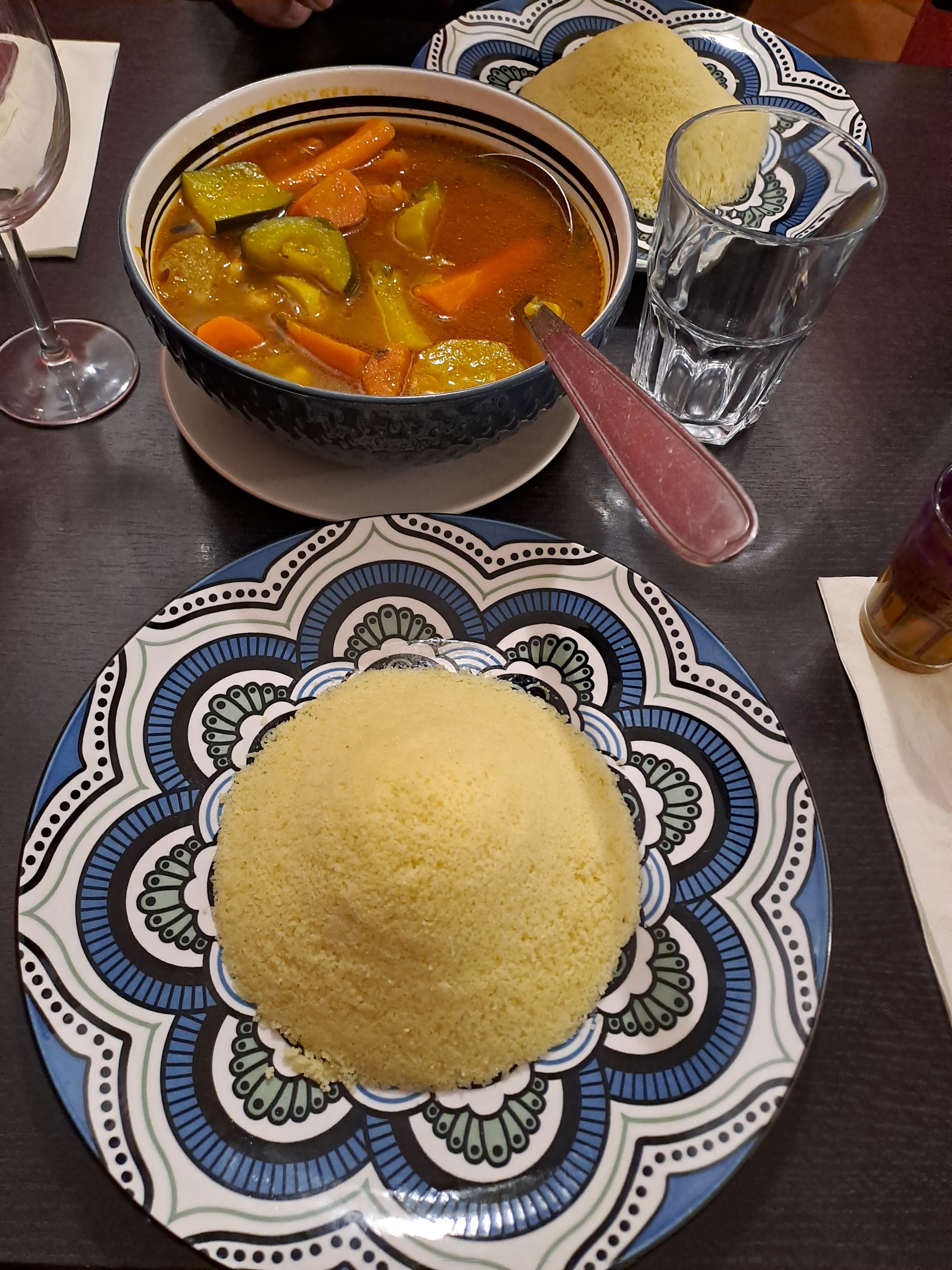 Le service était très sympathique. La musique était un peu trop forte pour moi. Mais quand j'ai demandé à baisser un peu, la sympathique dame a immédiatement refusé. La musique était orientale. Bon. Aussi avec l'ambiance à l'intérieur du restaurant. Quand l'assiette de couscous est arrivée, j'ai pensé... même pas tant que ça, je peux facilement gérer ça. Mais quand nous avons reçu le pot de légumes et la viande, je n'en étais plus si sûr. L’odeur de la nourriture m’a encore plus ouvert l’appétit. Le plat était très savoureux et suffisant ! Au fur et à mesure que le restaurant se remplissait, cela devenait un peu bruyant car il y avait un groupe d'invités qui parlaient joyeusement et fort entre eux. Je pense que cela est dû au plan de la pièce. Mais quand leur nourriture arriva, la situation redevint plus calme. Nous reviendrons certainement. Merci!